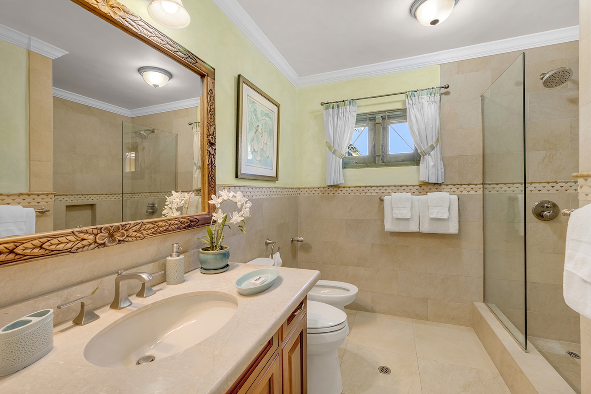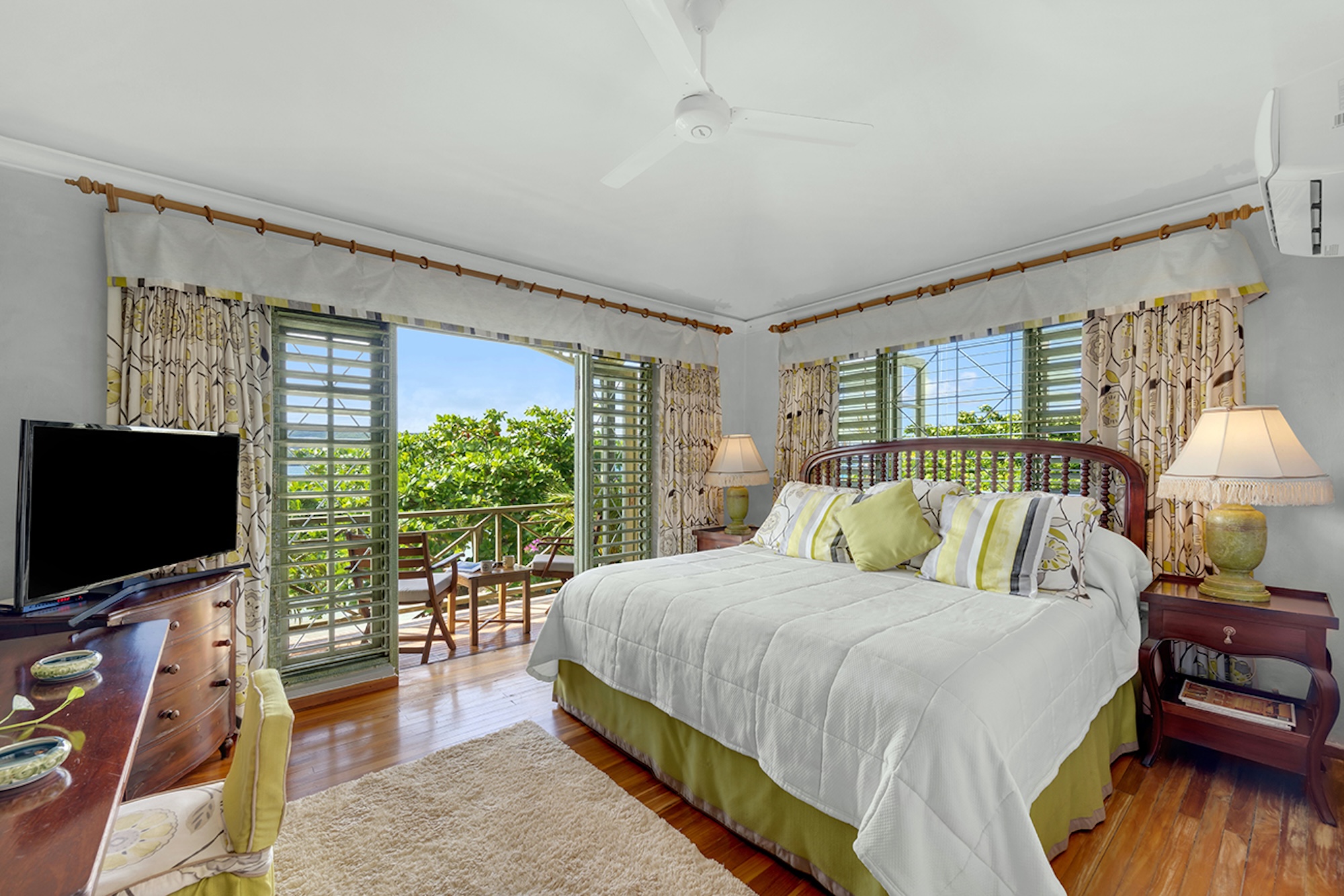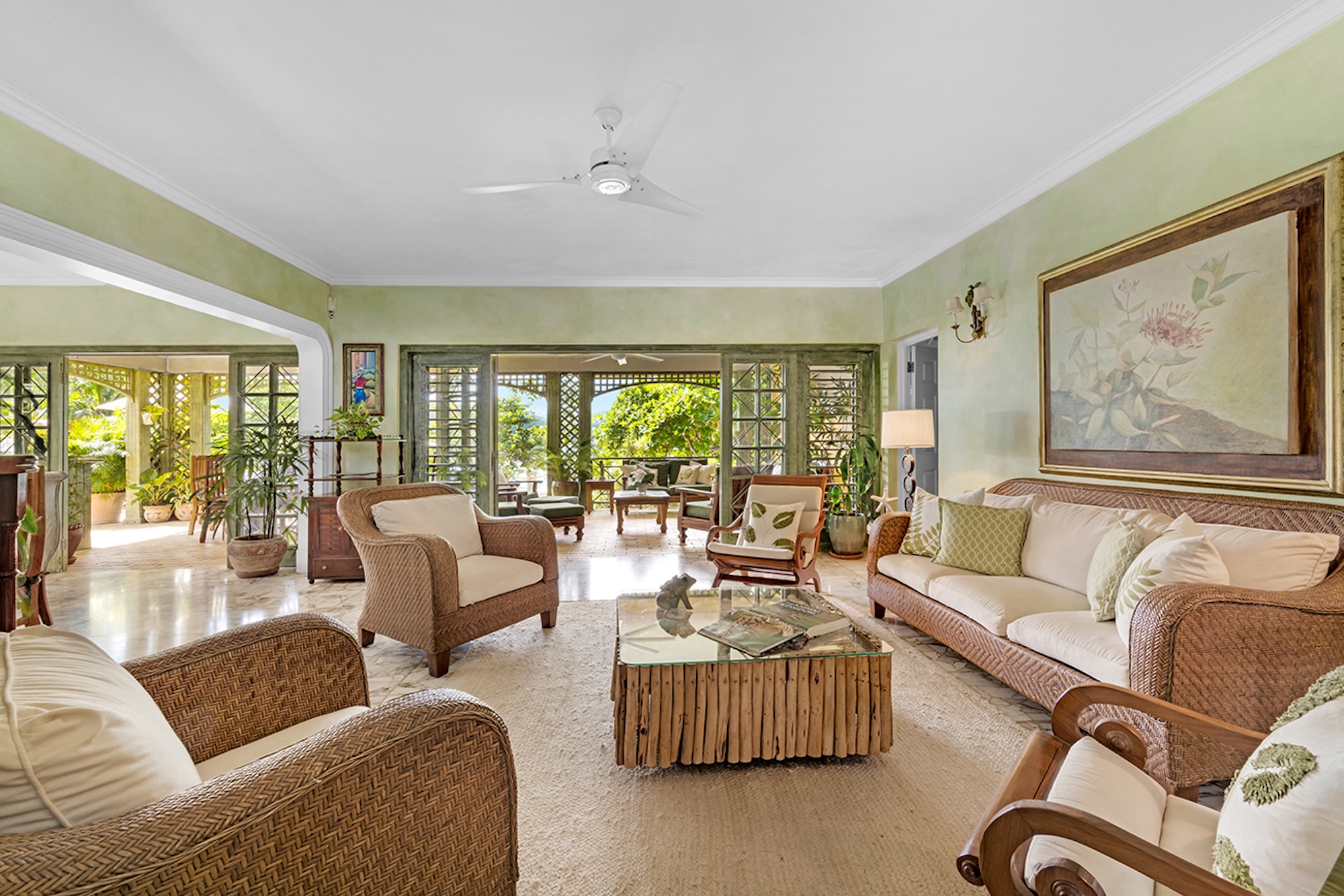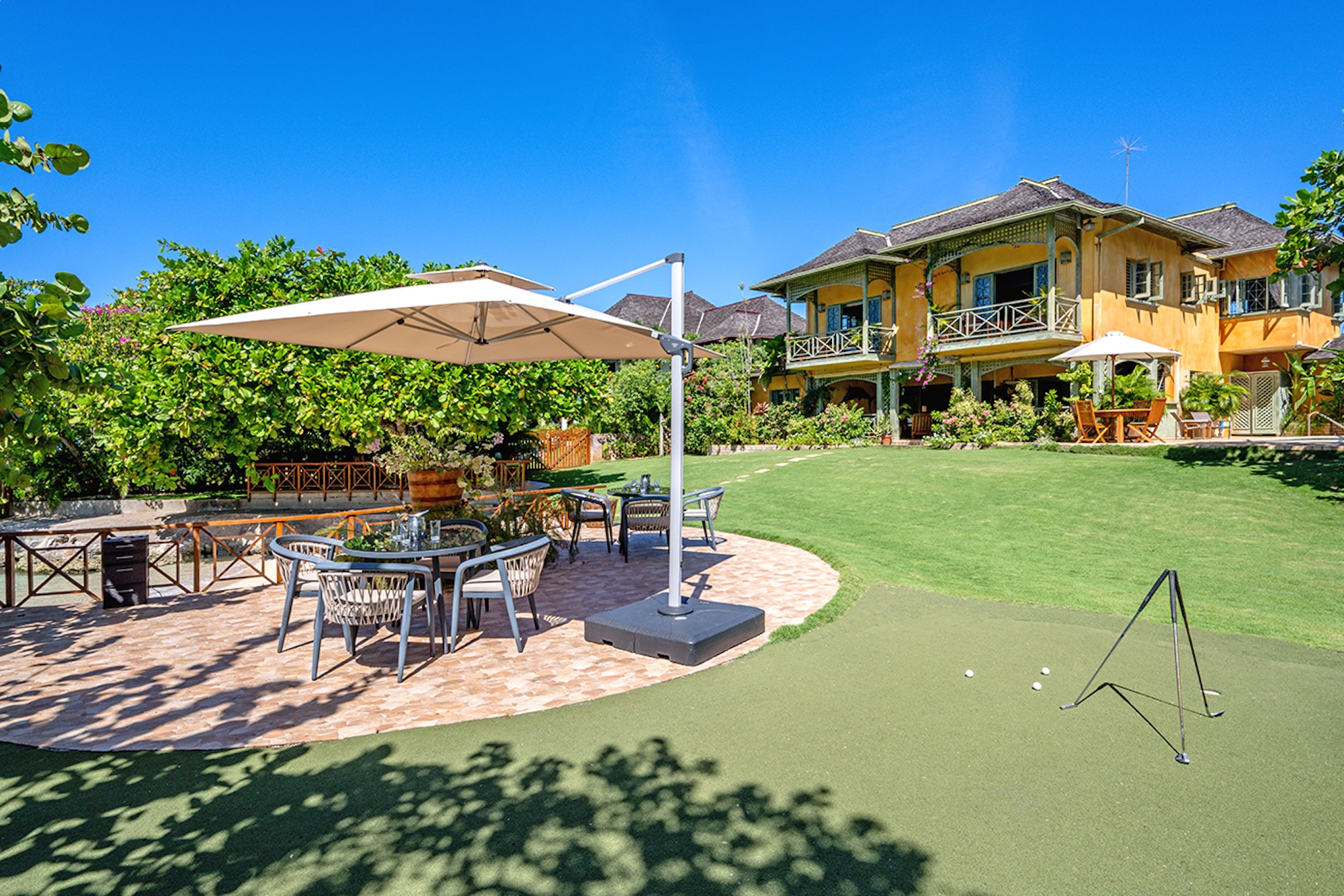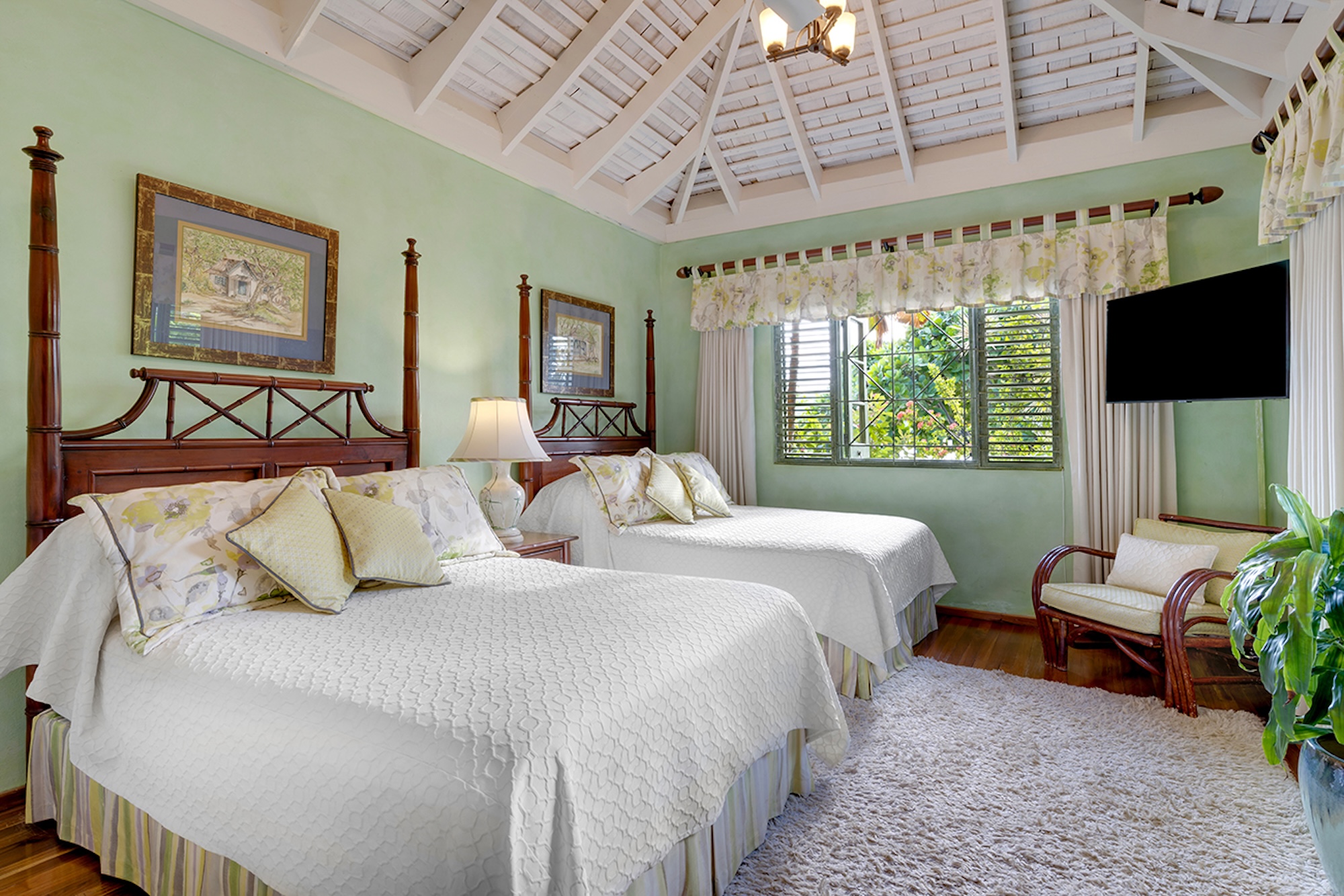 Flowering vines spill across windows and trellises—bougainvillea, hibiscus, shrimp flower, and oleander—drawing hummingbirds and the island’s famed yellowbird. Inside, vibrant tropical hues and curated artwork create a relaxed yet refined ambiance. A path of stepping stones crosses the lush lawn to Keela Wee’s 100-foot ribbon of soft sand and crystalline sea, where complimentary kayaks and an offshore sunning platform invite long, unhurried days on the water just steps from the verandah.