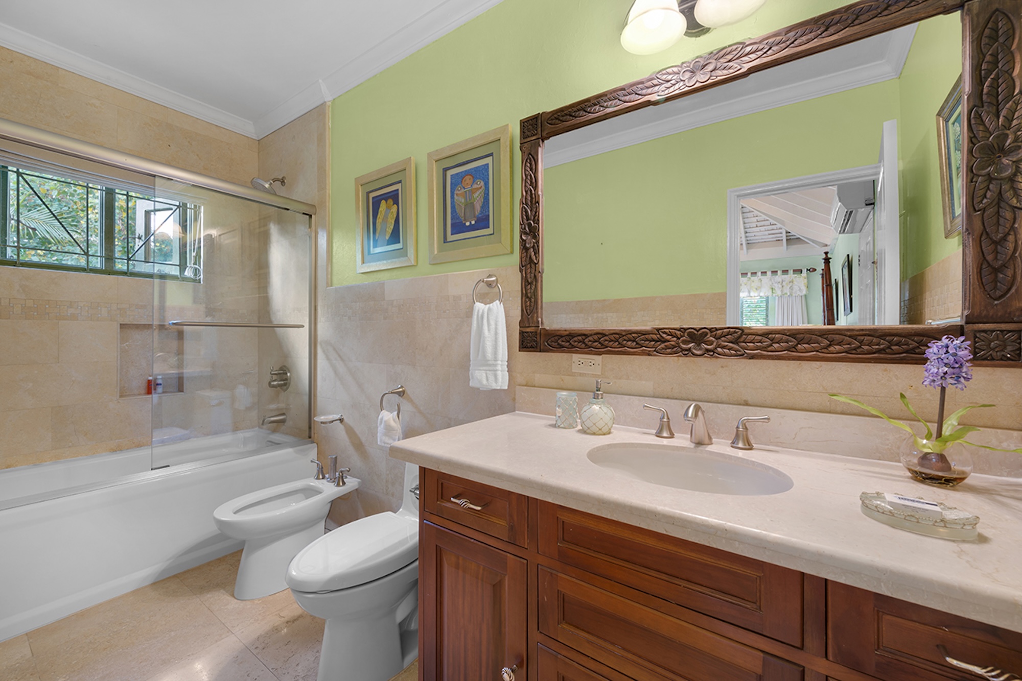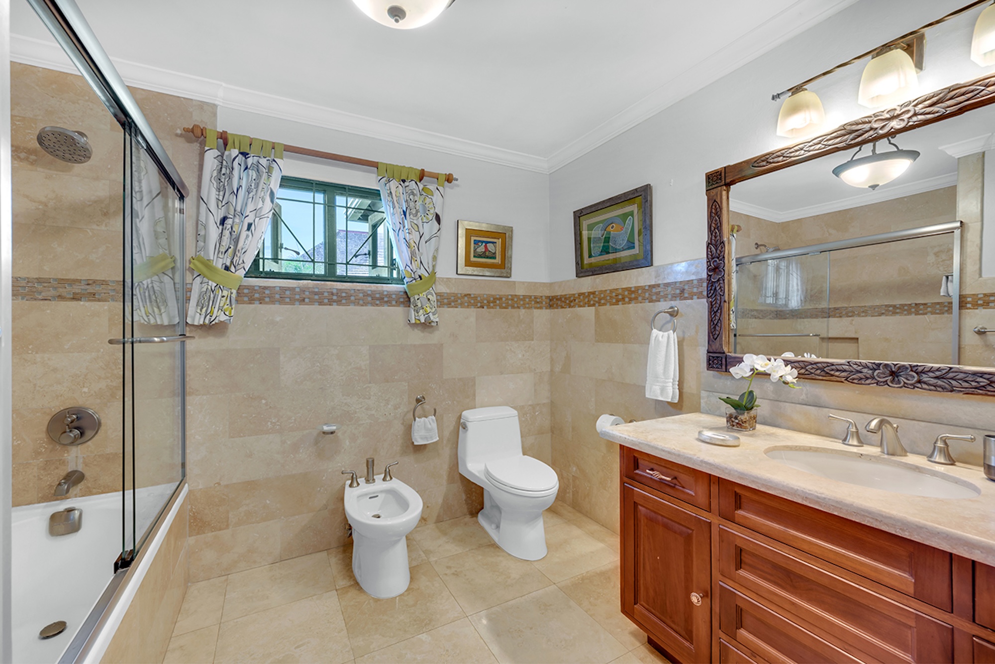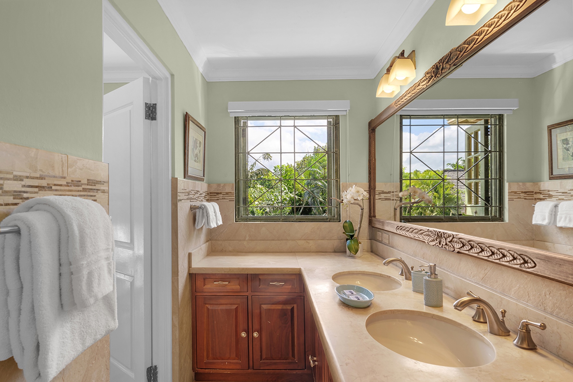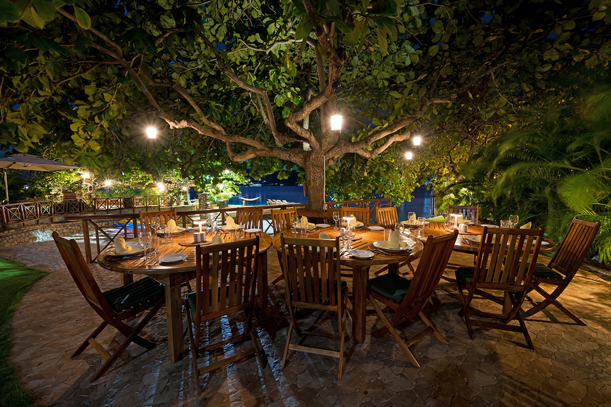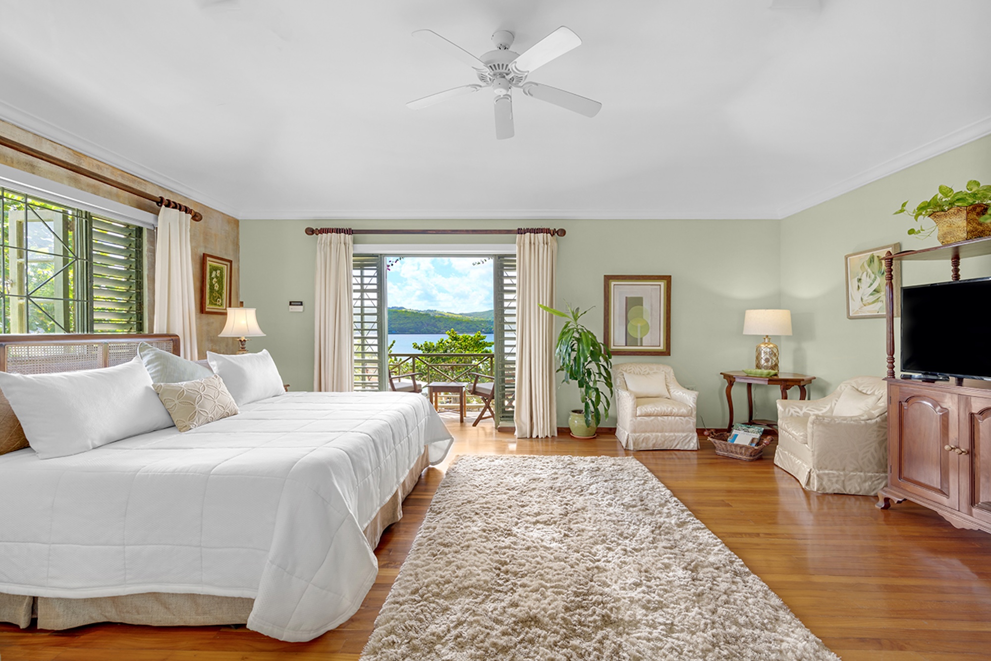Flowering vines spill across windows and trellises—bougainvillea, hibiscus, shrimp flower, and oleander—drawing hummingbirds and the island’s famed yellowbird. Inside, vibrant tropical hues and curated artwork create a relaxed yet refined ambiance. A path of stepping stones crosses the lush lawn to Keela Wee’s 100-foot ribbon of soft sand and crystalline sea, where complimentary kayaks and an offshore sunning platform invite long, unhurried days on the water just steps from the verandah.