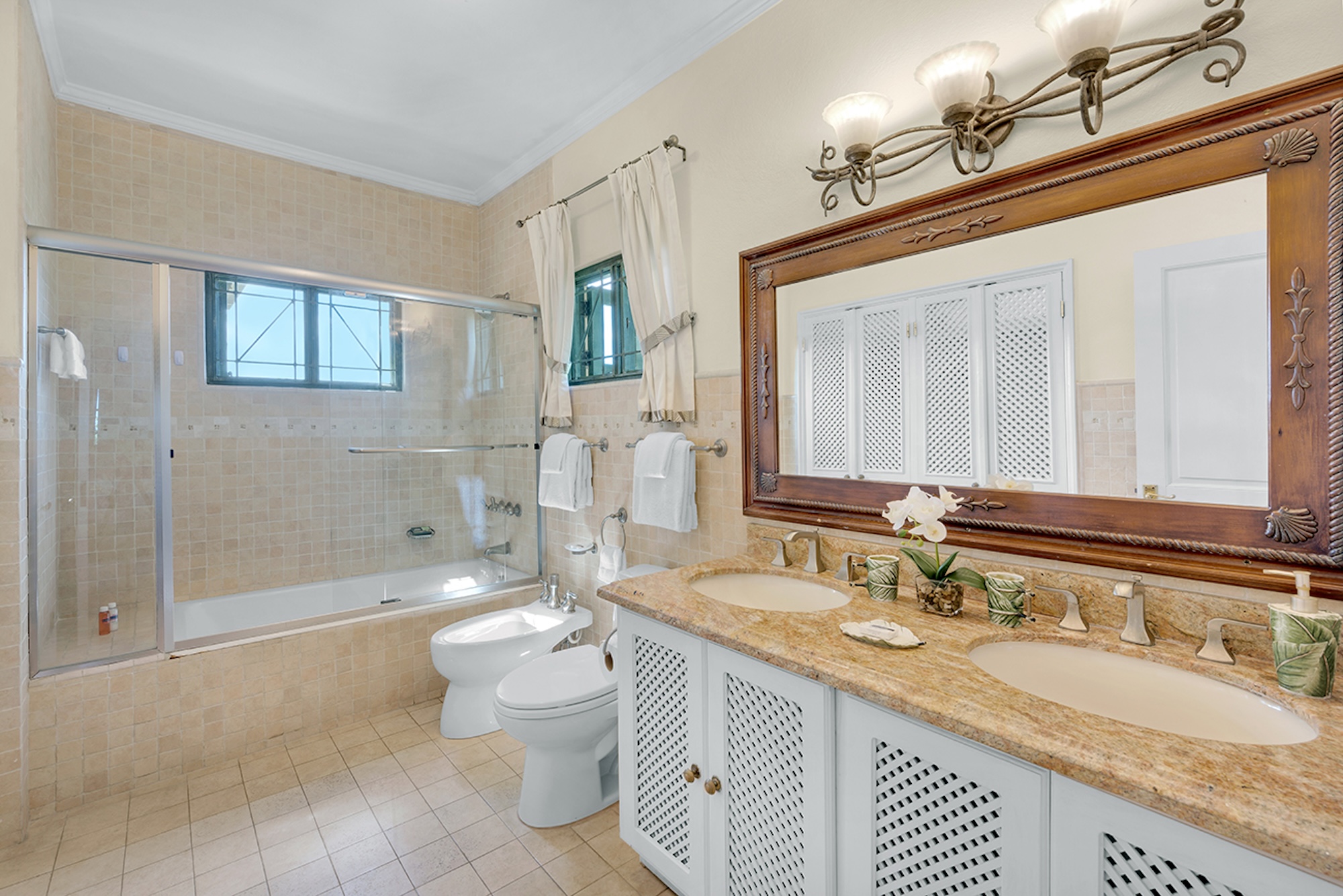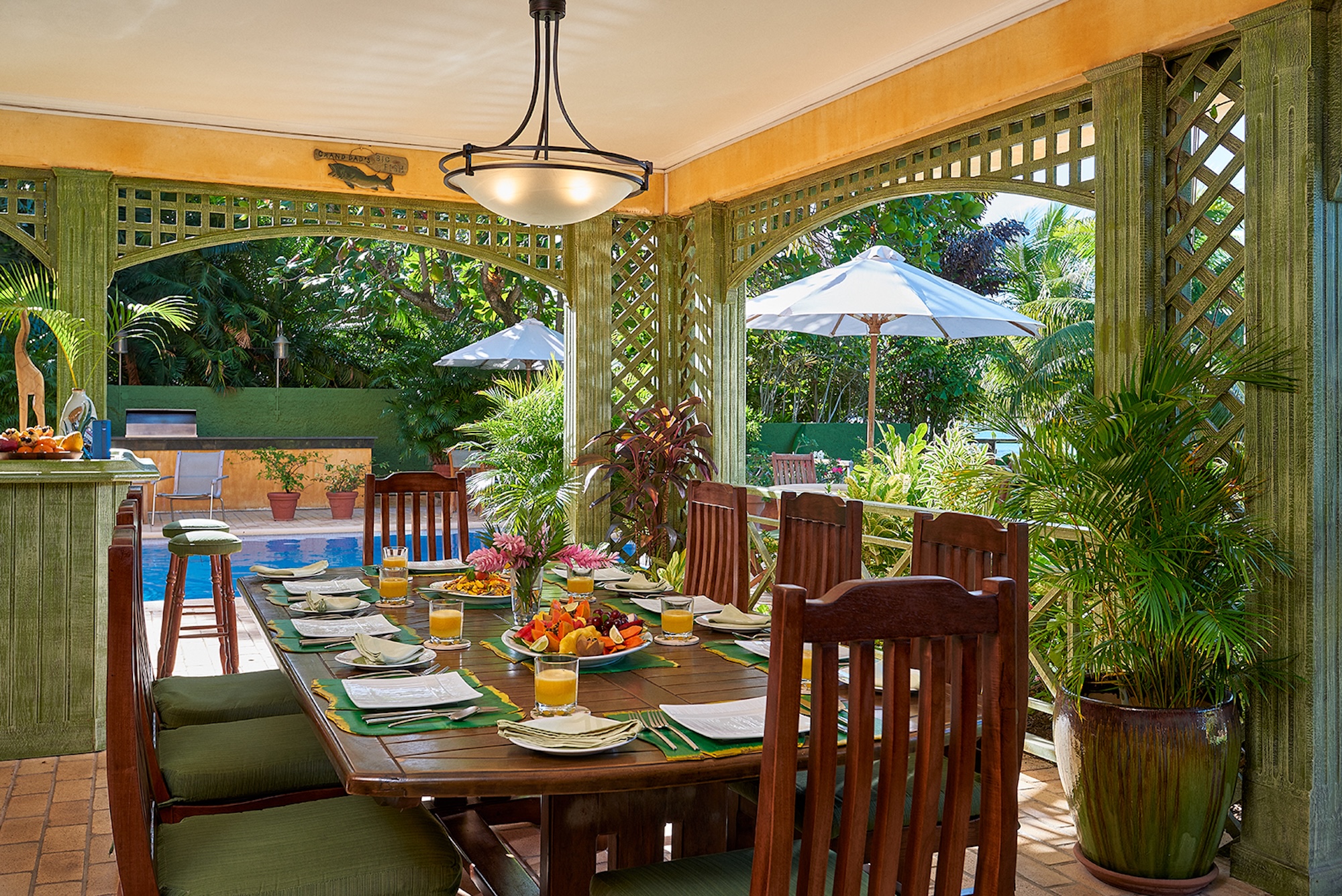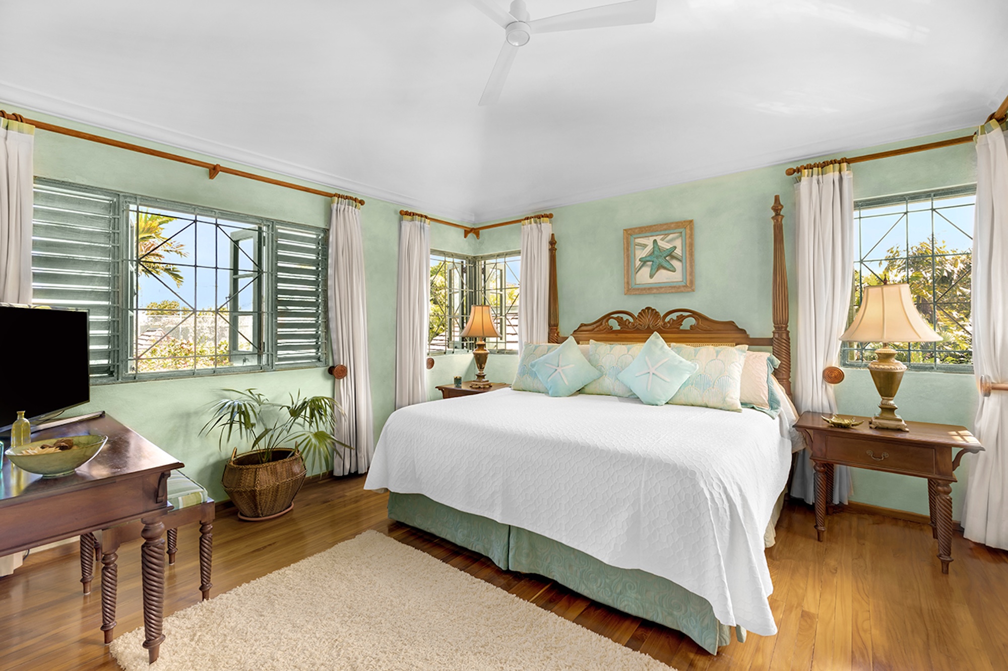 Upstairs, a polished wooden staircase and color-washed walls lead to a second sitting room with television, computer, fax, plush sofas, and a card table. Indoor and alfresco dining areas seat twelve for memorable, home-cooked meals. For something special, the staff can arrange a torchlit beach dinner with chicken, lobster, or freshly caught fish grilled on the barbecue.
