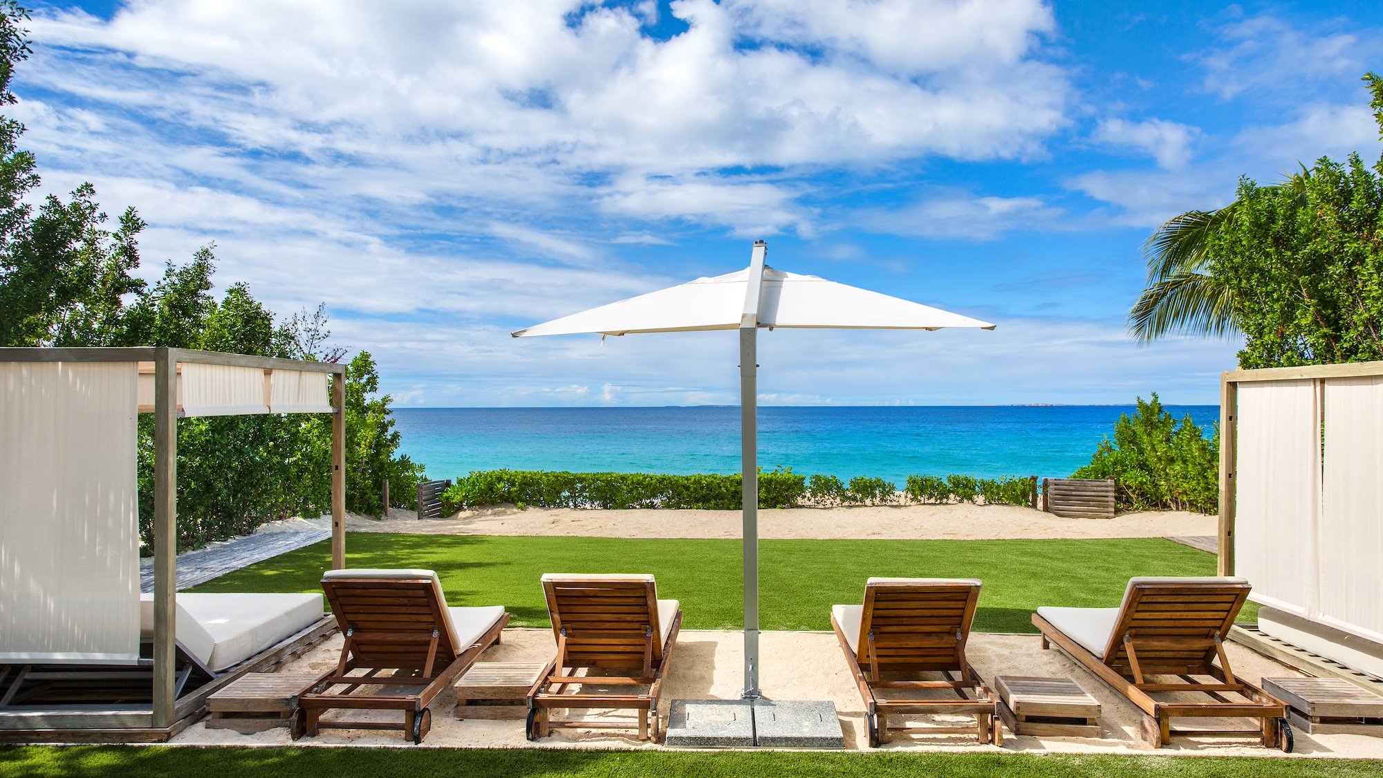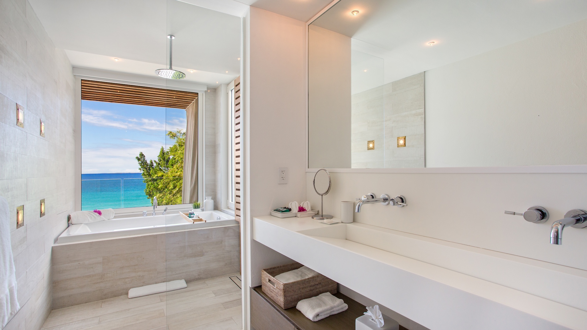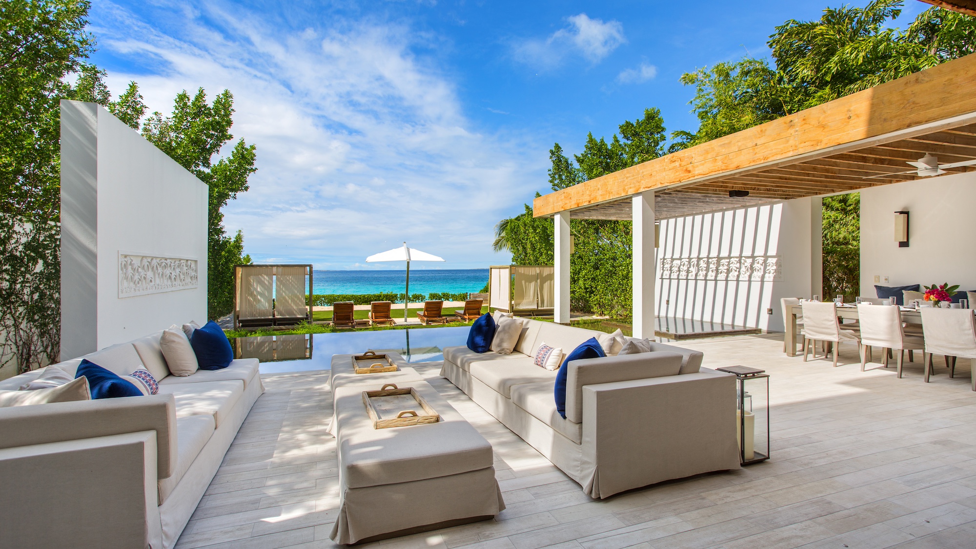 Expansive floor-to-ceiling windows provide stunning views, immersing guests in this exceptional, world-class setting. Enjoy a leisurely stroll to top-notch restaurants and charming beach cafes, or sip a cocktail along a picturesque mile-long beach flanked by 5-star resorts at both ends. Relax on outdoor canopy beds, cool off in the private infinity pool, or unwind in the beachside hot tub.