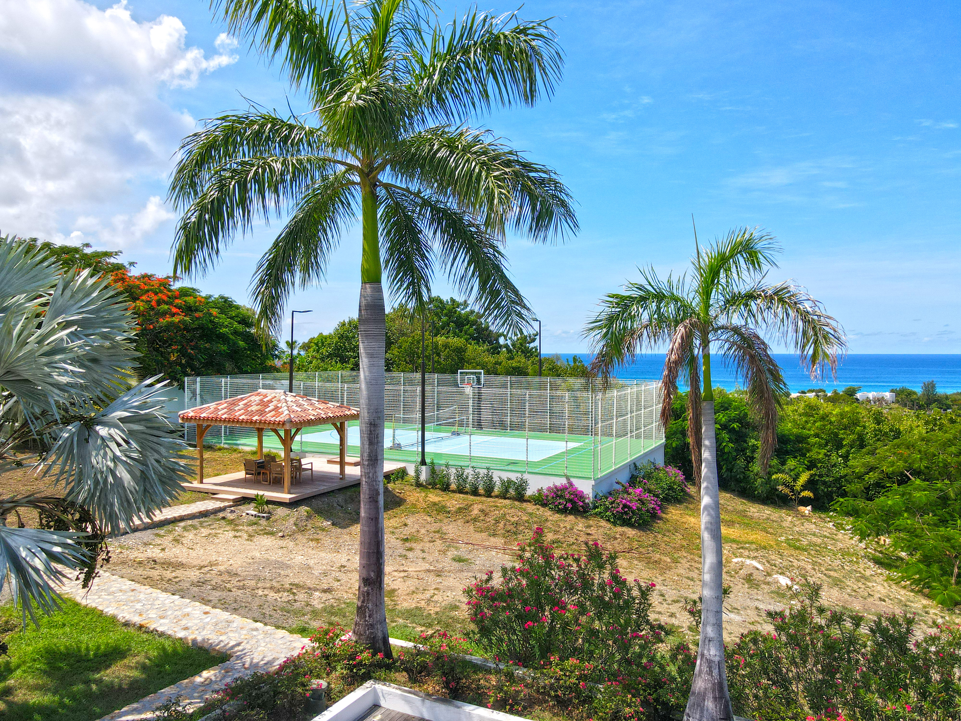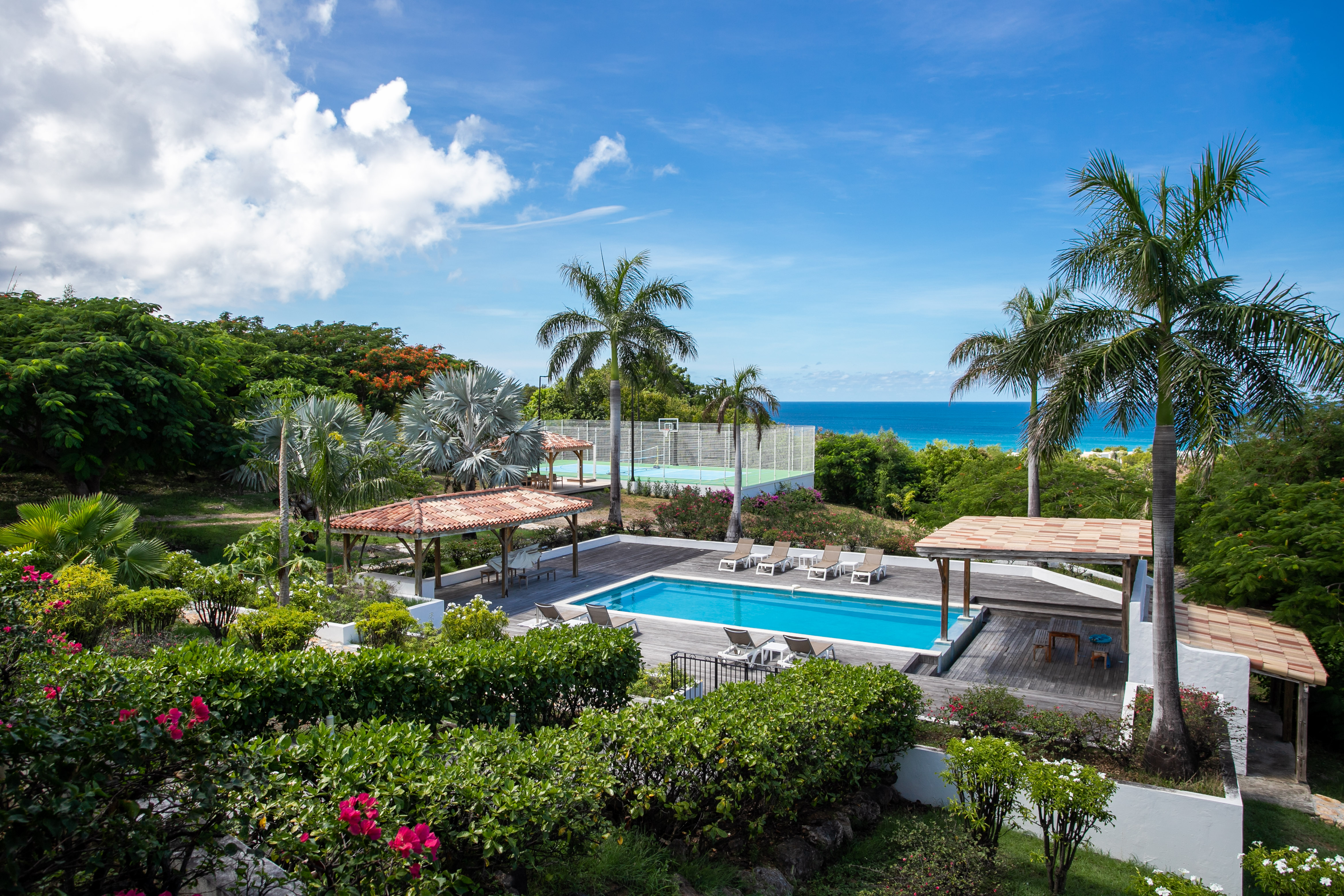 Nestled in the upscale Terres Basses neighbourhood of St. Martin, Villa La Hacienda exudes an elegant Spanish-Caribbean charm, thoughtfully designed to embrace breathtaking views and maximize outdoor living. The home welcomes you with a covered courtyard entrance featuring Old World wooden doors, tiled floors, and lush exotic plants, leading to a stunning tropical panorama. Framed by regal palms and vibrant pink bougainvillea, the view unfolds in hues of blue, from the sapphire sea to the endless sky—beautiful by day and mesmerizing at sunset. Lush, meticulously designed gardens surround the villa and its terraces, while multi-level Epi wood decks provide abundant spaces for dining, lounging, and basking in the sun. Whether seeking solitude or sharing time with loved ones, this villa offers the perfect setting.