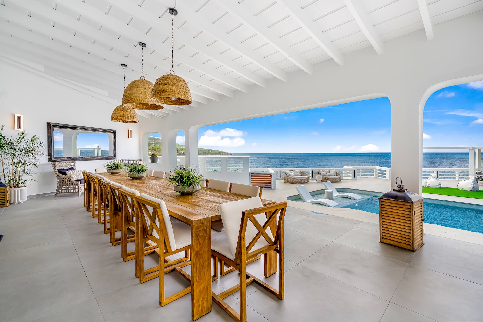 Indulge in style and opulence at our exquisite six-bedroom villa nestled on St. Maarten’s Pelican peninsula, on the enchanting Dutch side. With breathtaking views of the Caribbean and the Atlantic, as well as the neighboring Caribbean islands of St. Eustatius and Saba, this luxurious retreat is surrounded by majestic mountains and pristine ocean vistas.