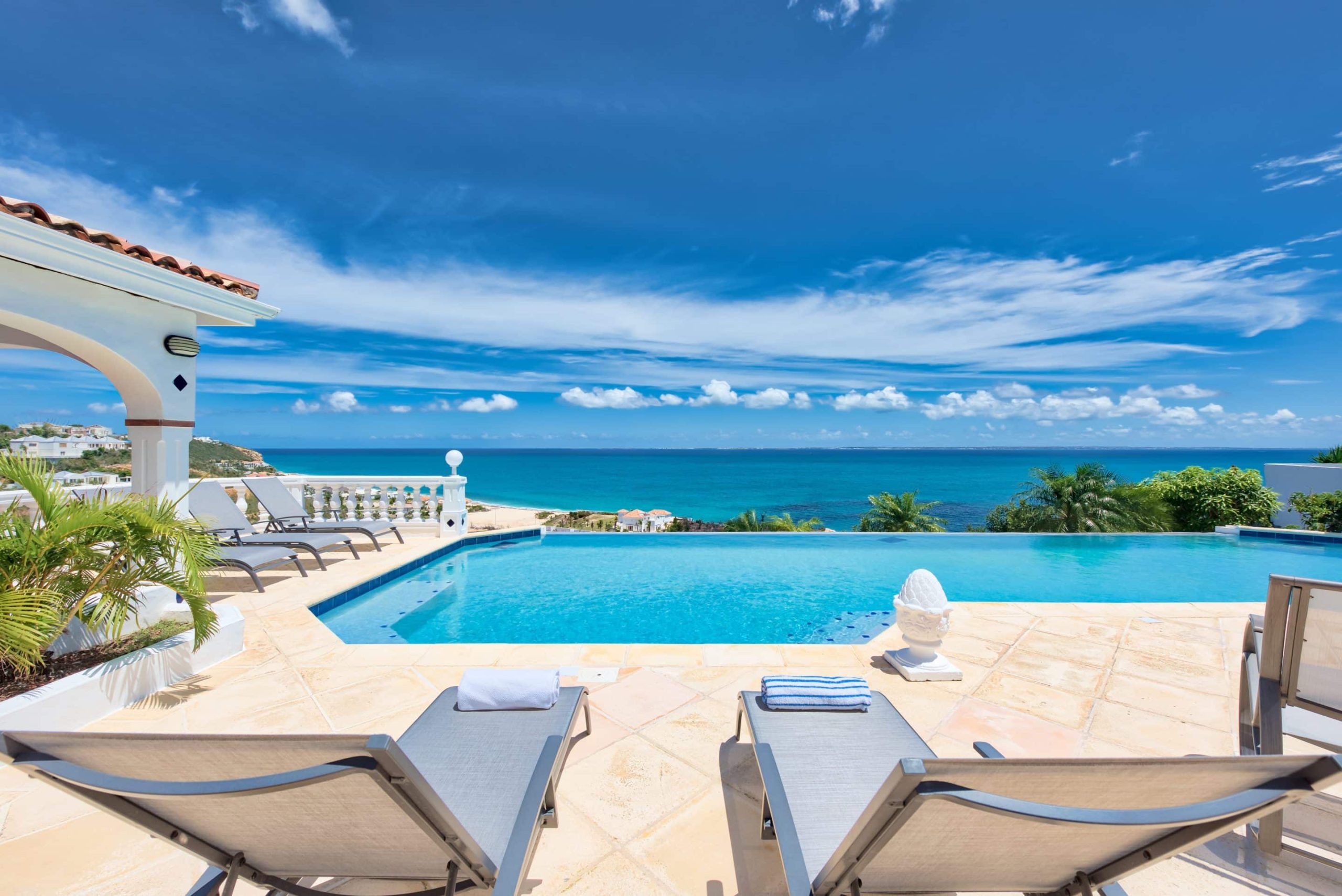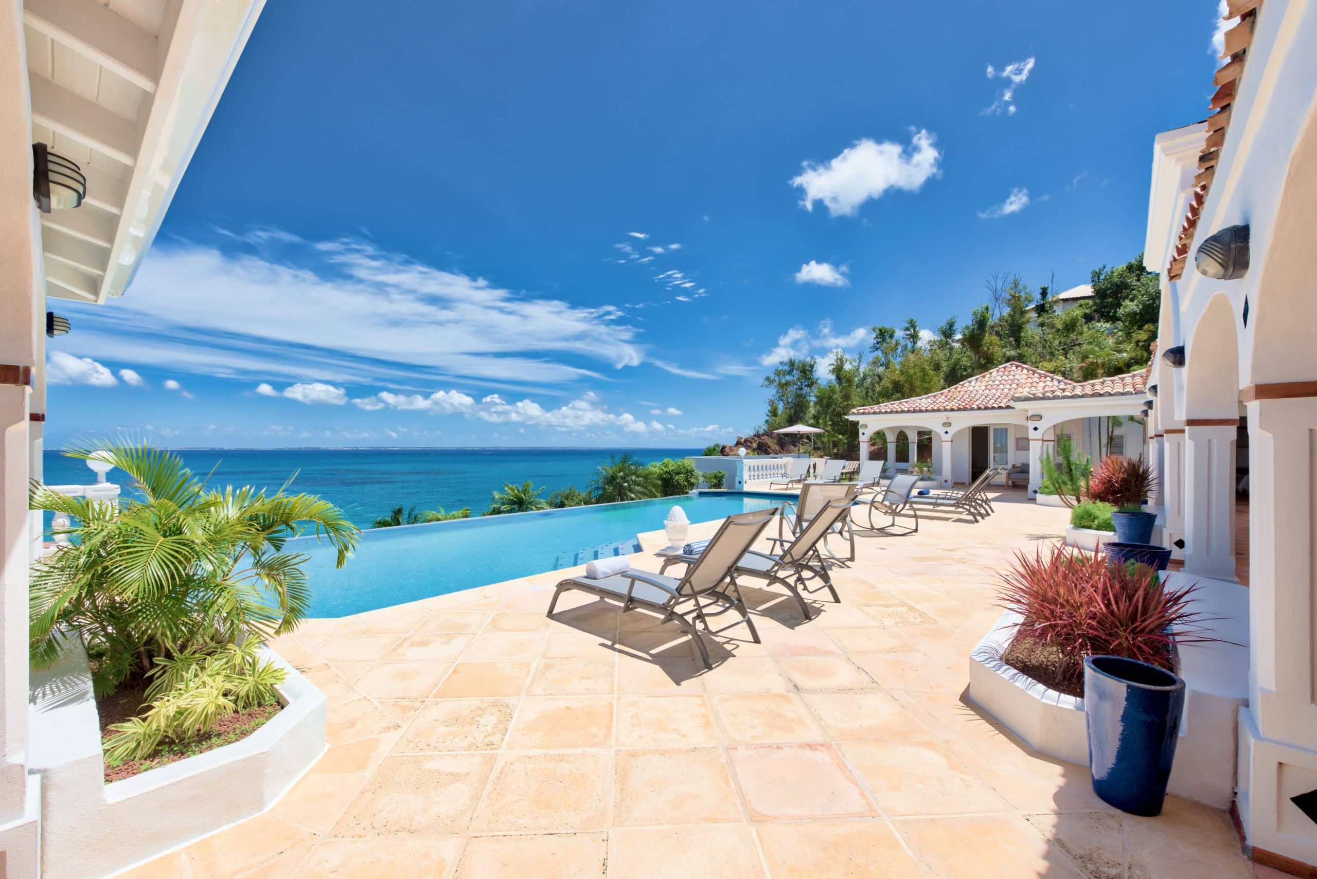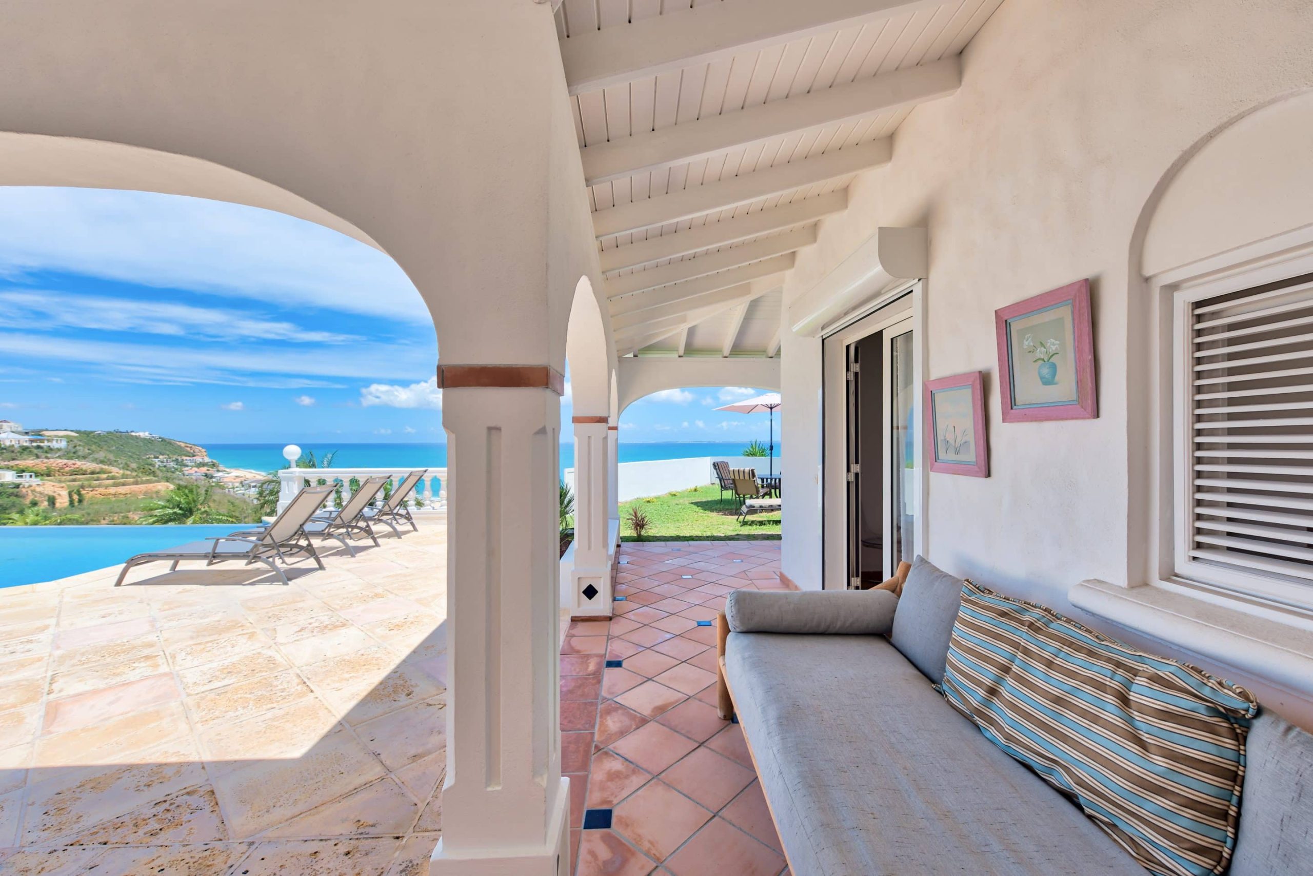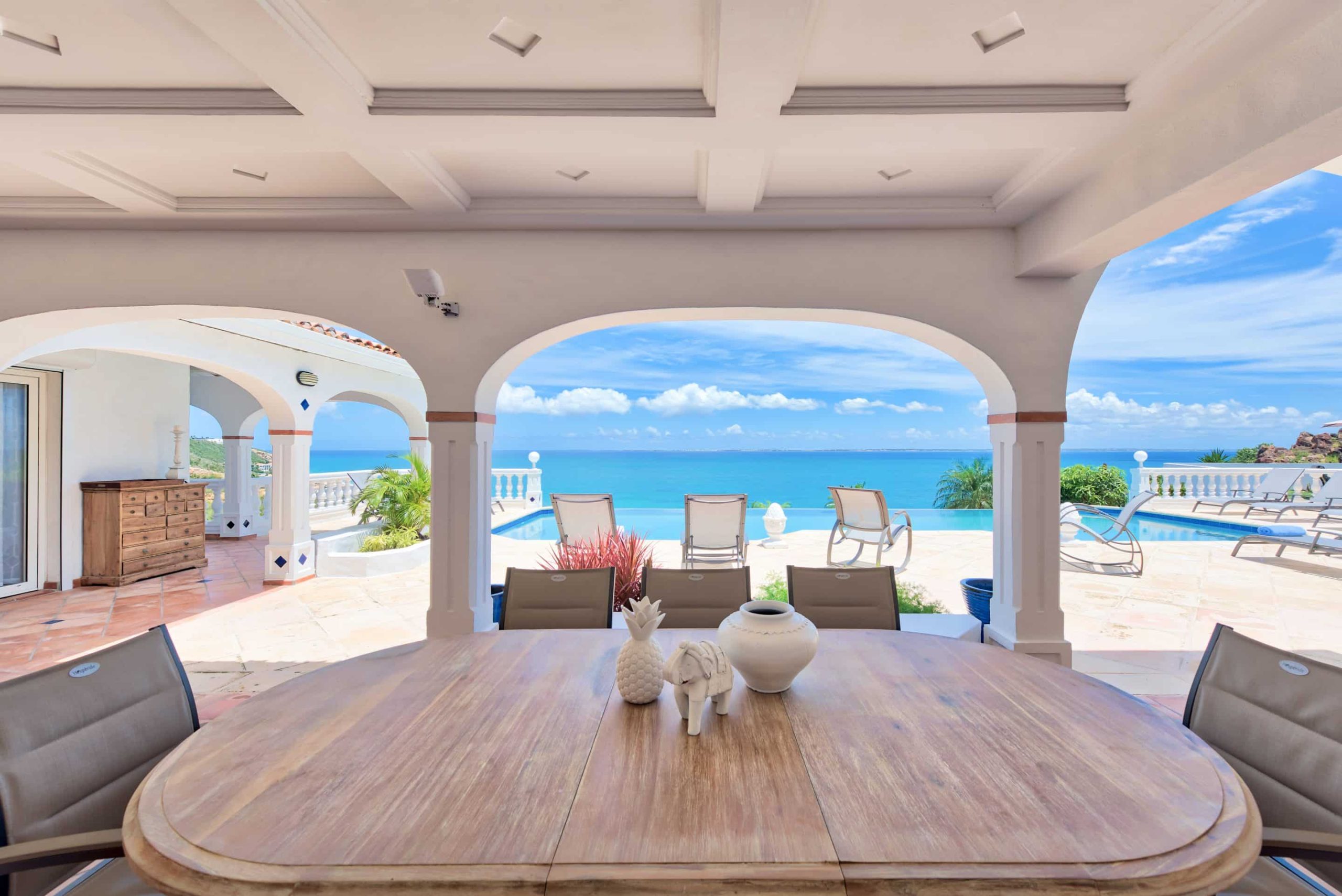 The lovely Villa Mezel has a large airy living area opening onto an expansive covered terrace and an infinity pool with breathtaking views towards Baie Rouge and the island of Anguilla.