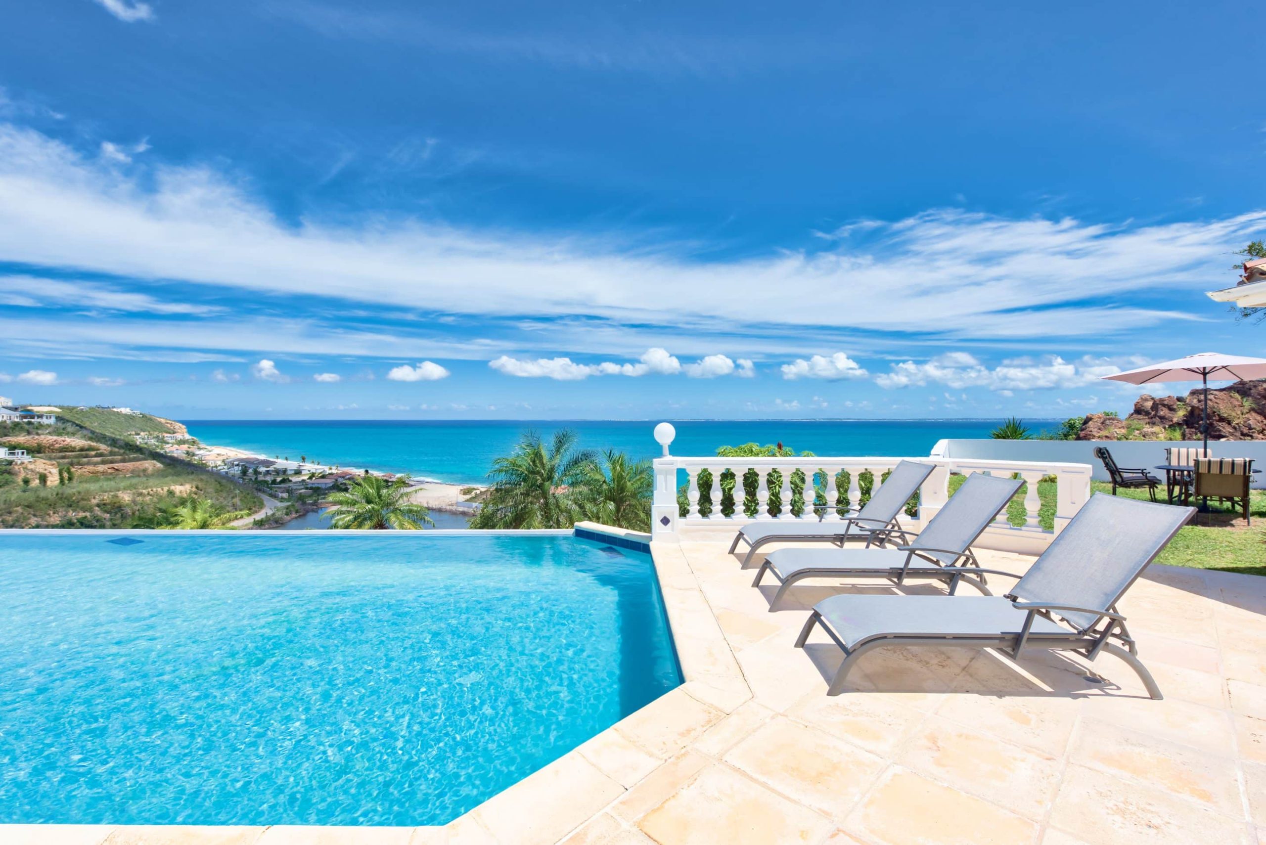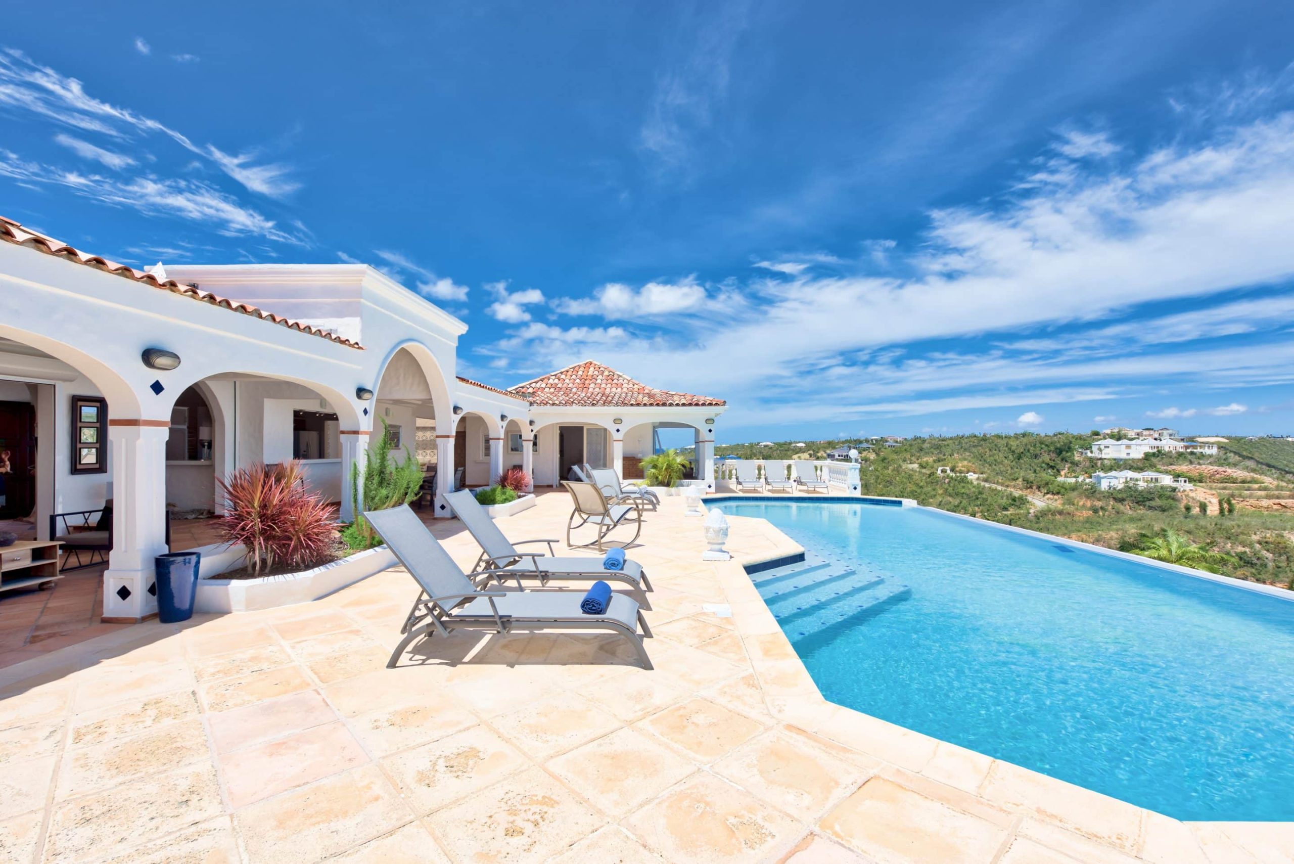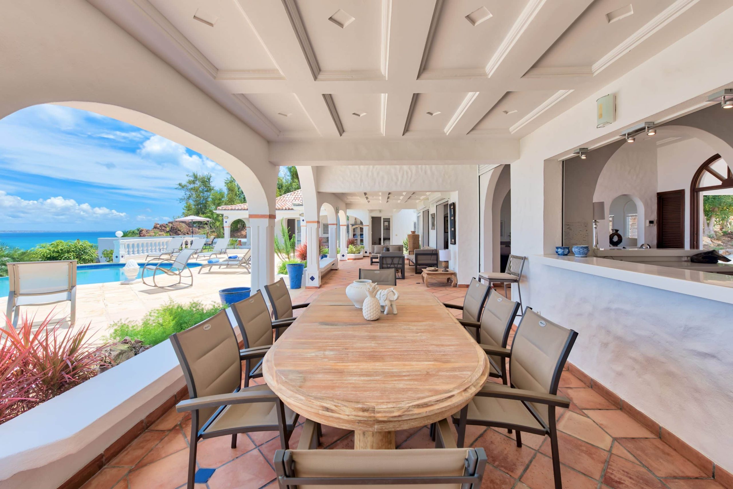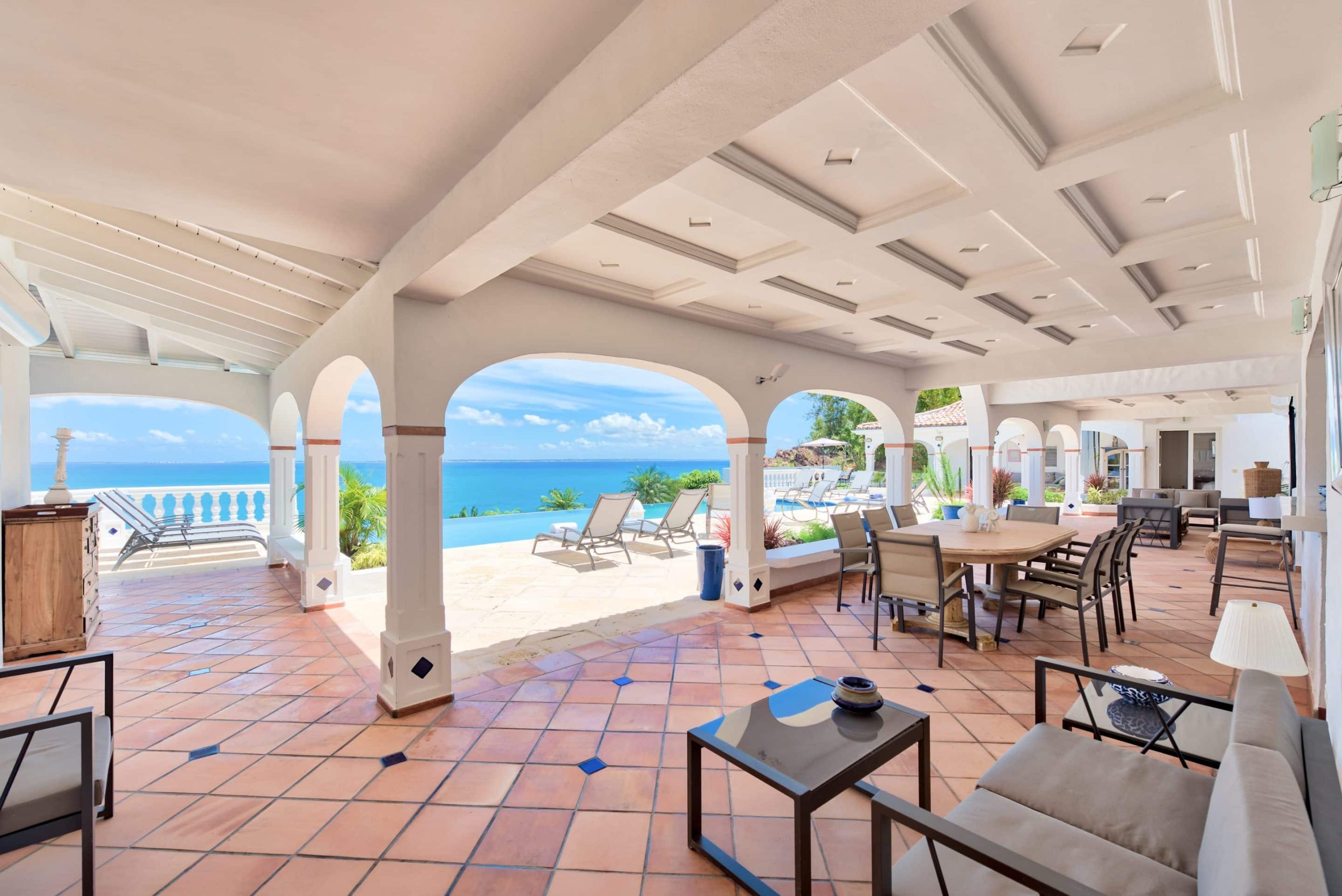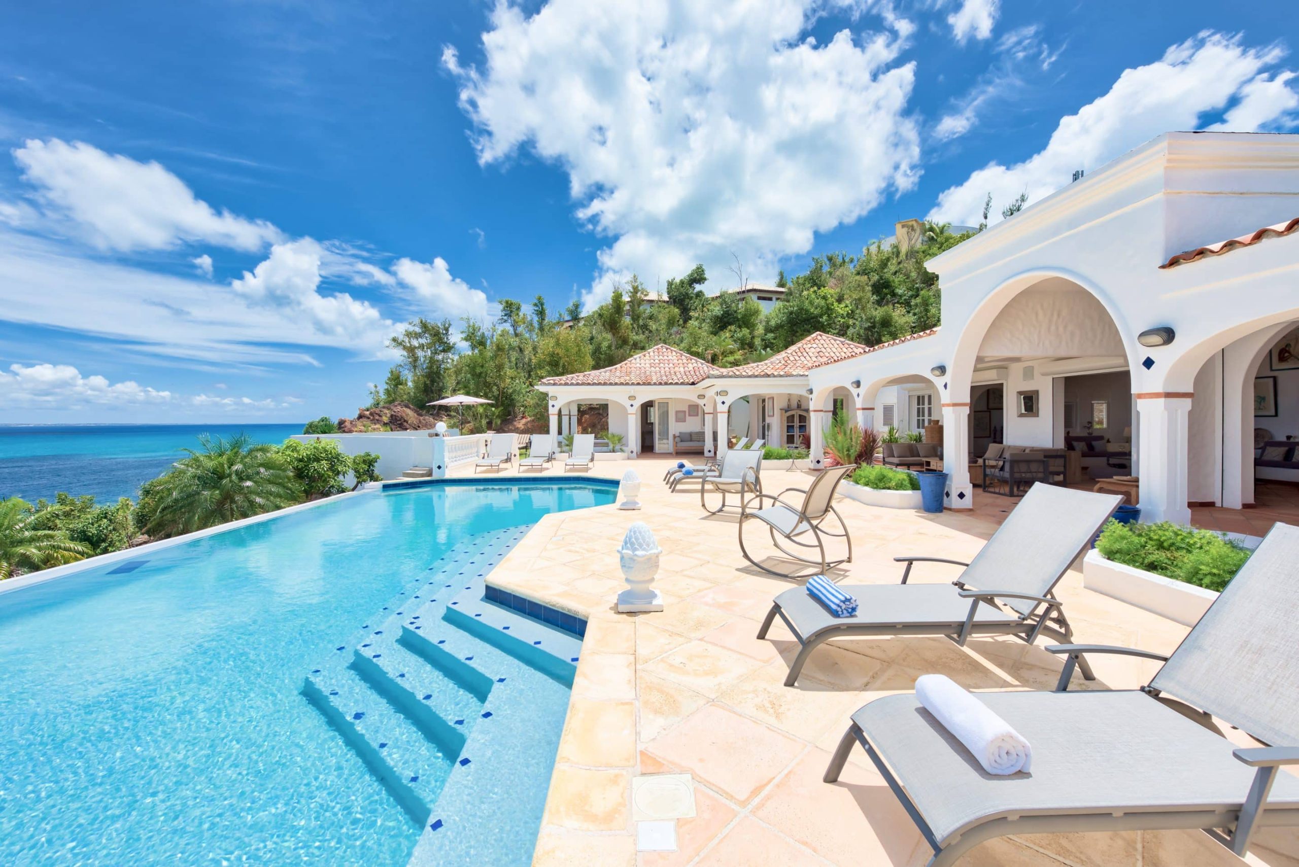 The lovely Villa Mezel has a large airy living area opening onto an expansive covered terrace and an infinity pool with breathtaking views towards Baie Rouge and the island of Anguilla.