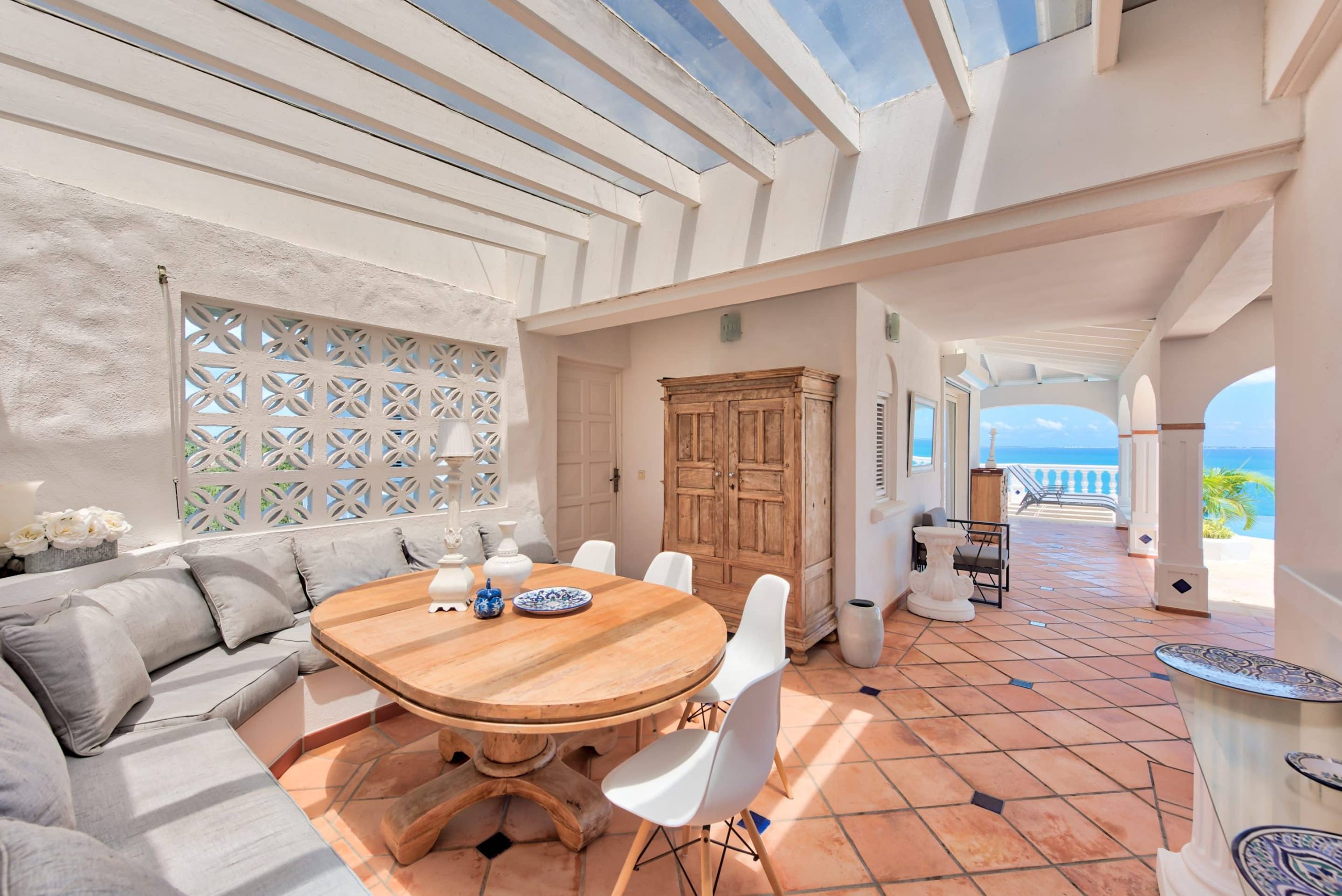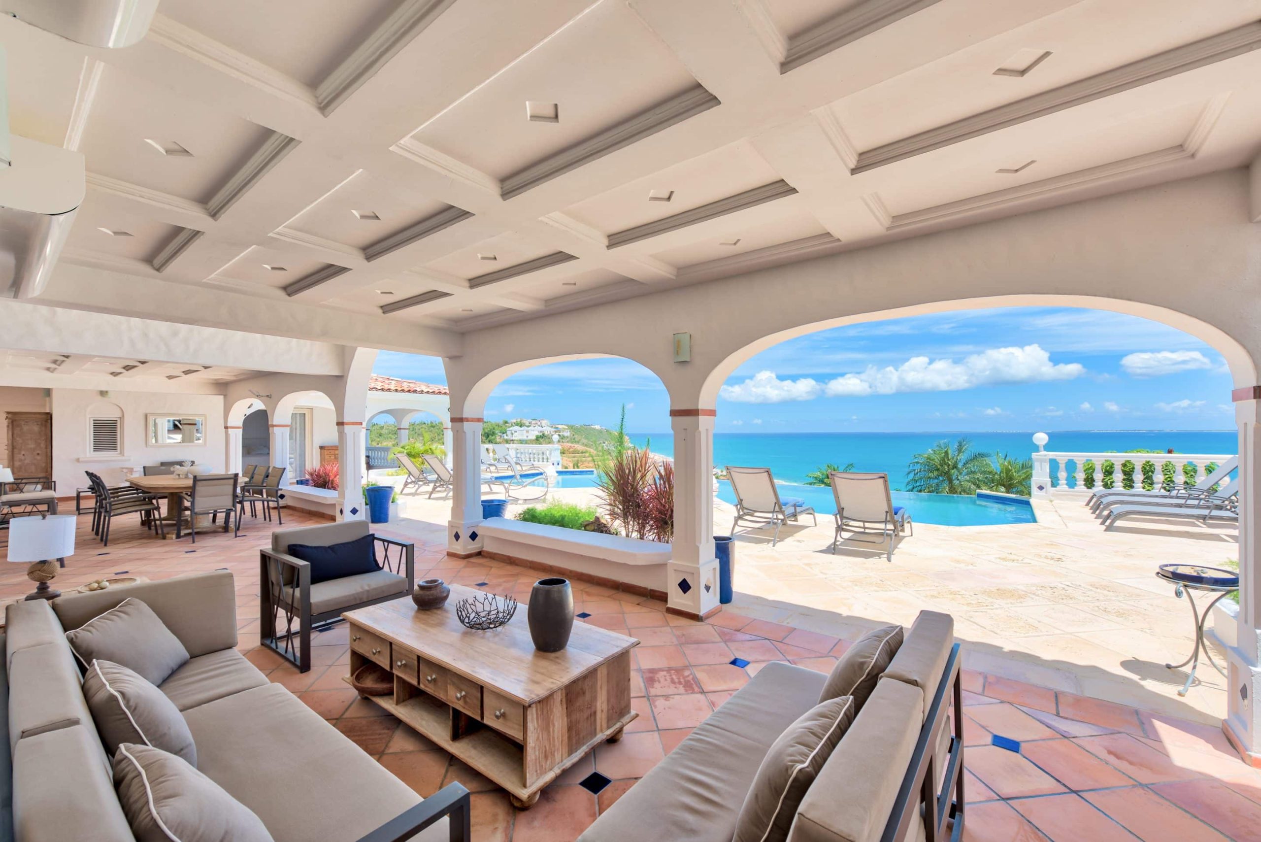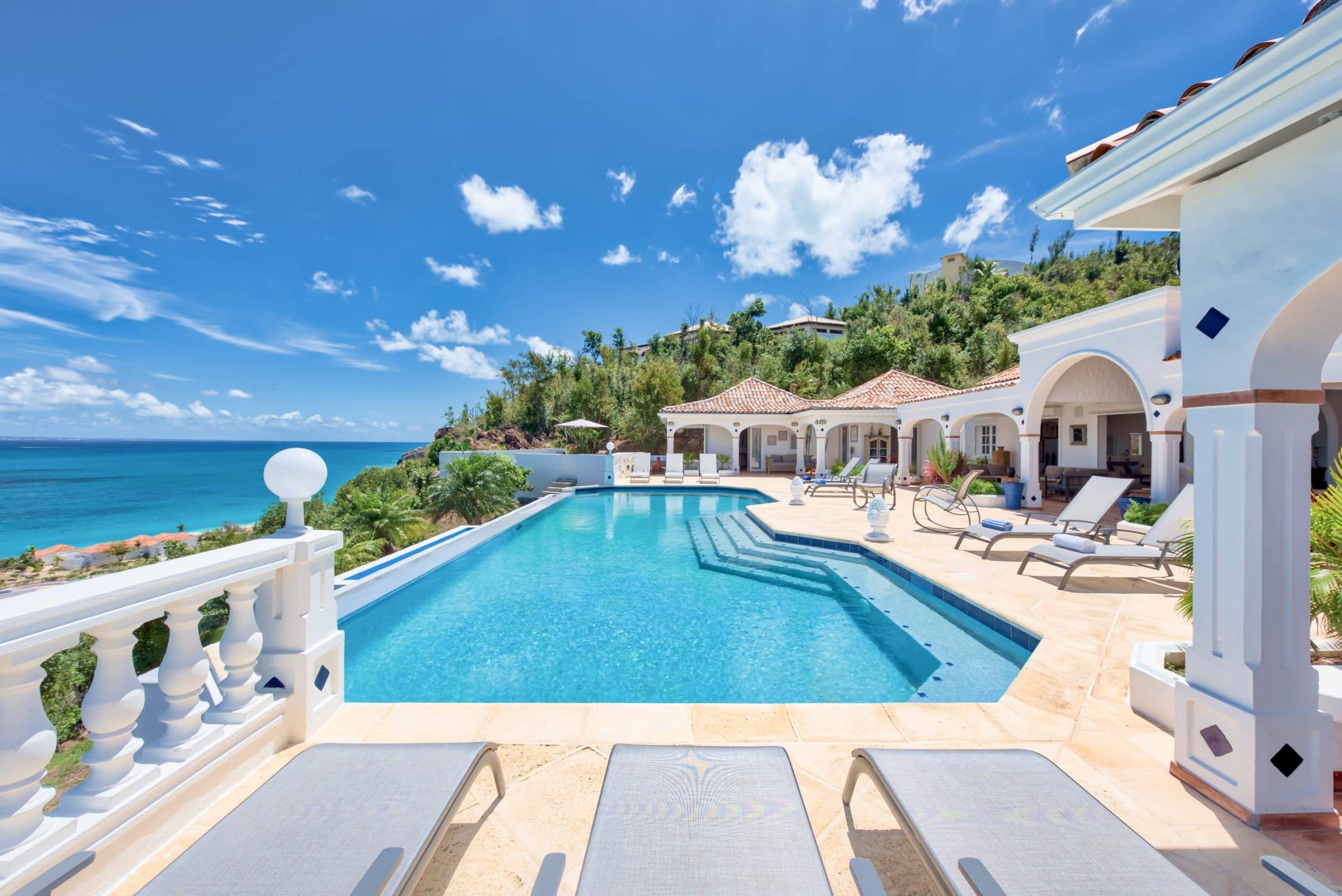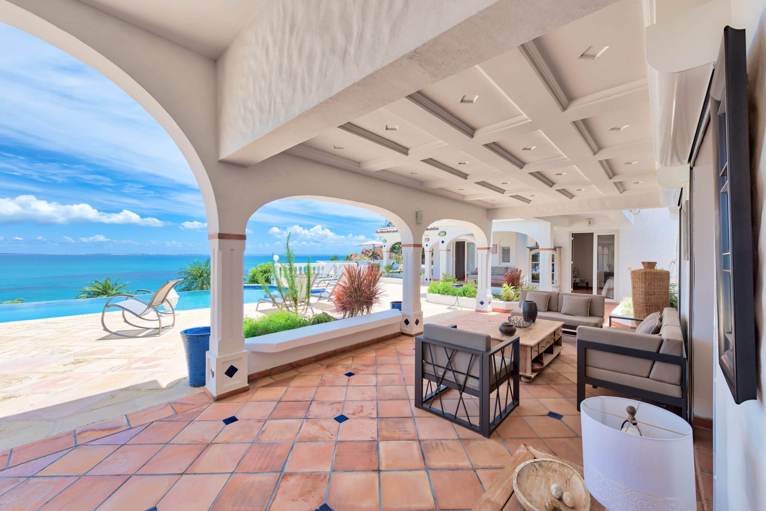 The lovely Villa Mezel has a large airy living area opening onto an expansive covered terrace and an infinity pool with breathtaking views towards Baie Rouge and the island of Anguilla.