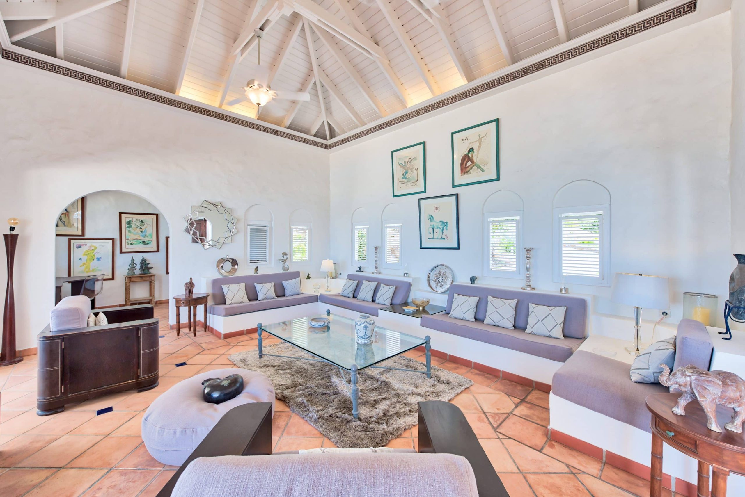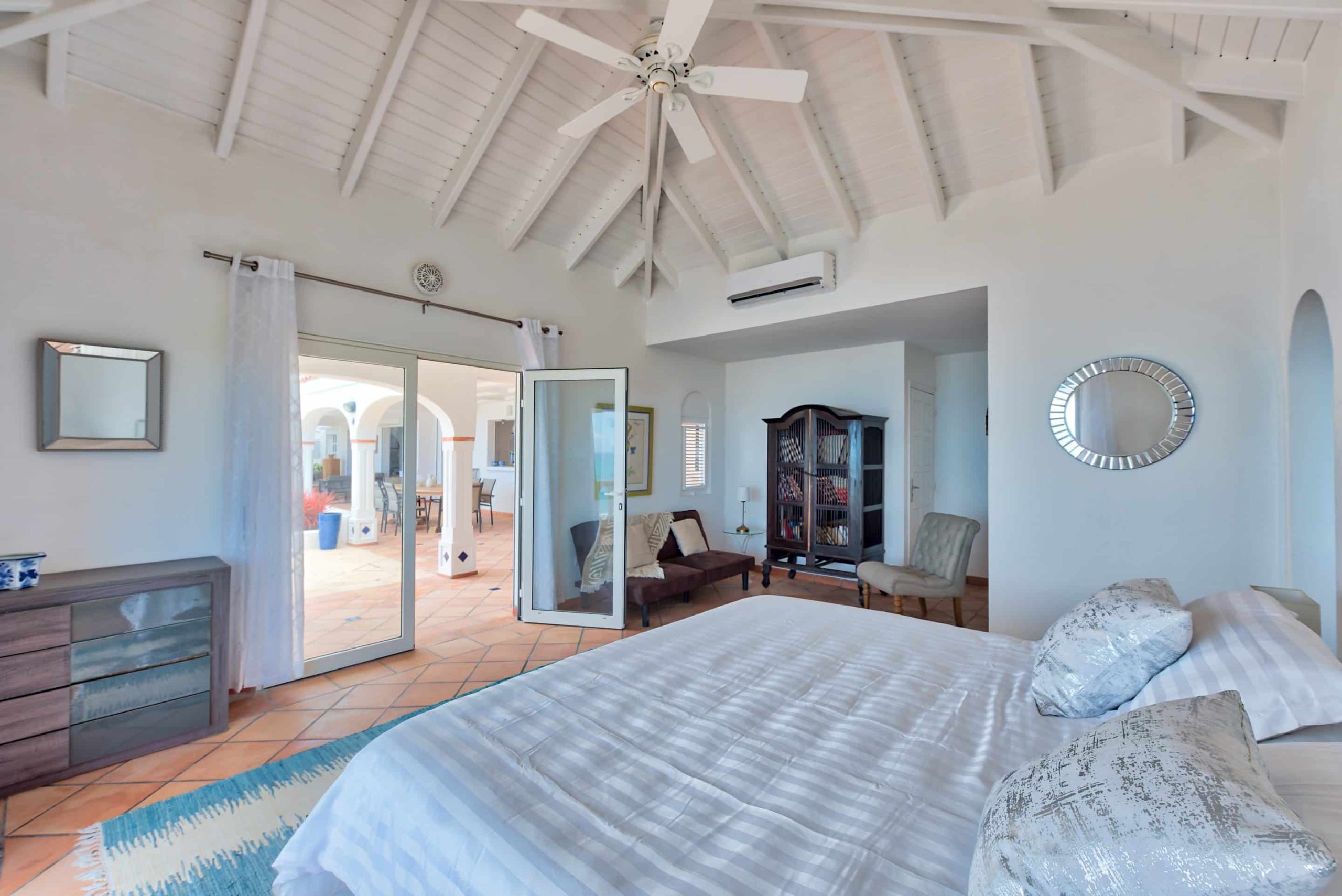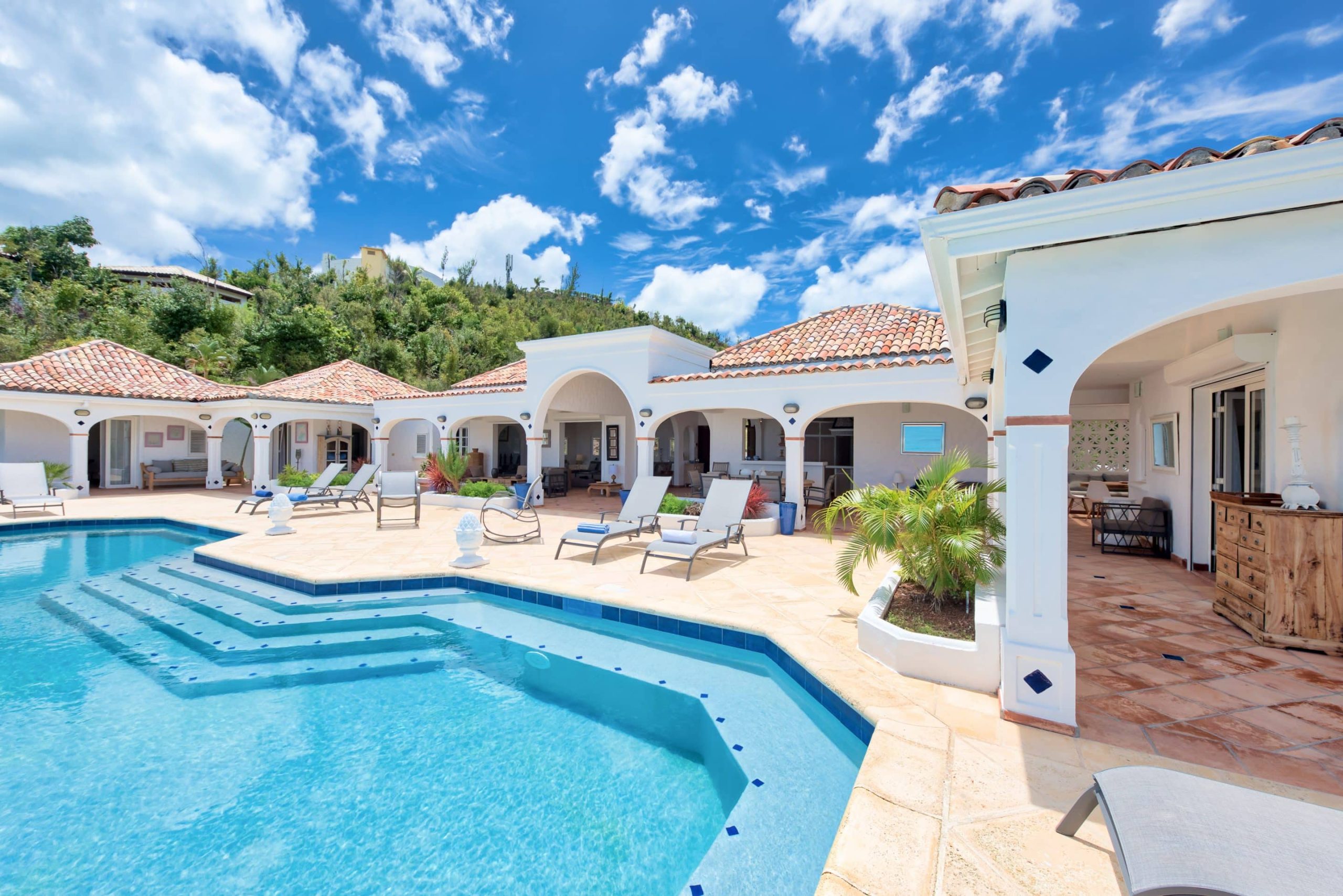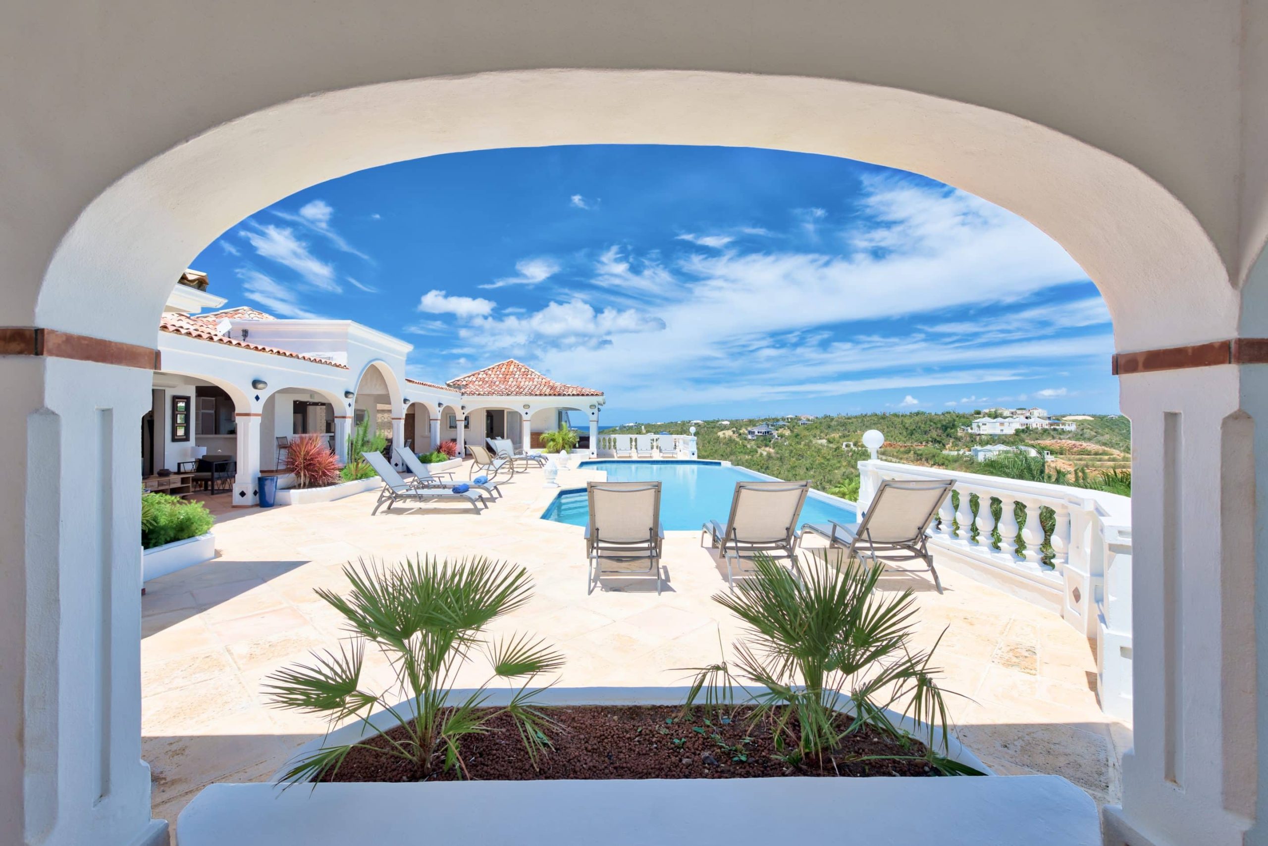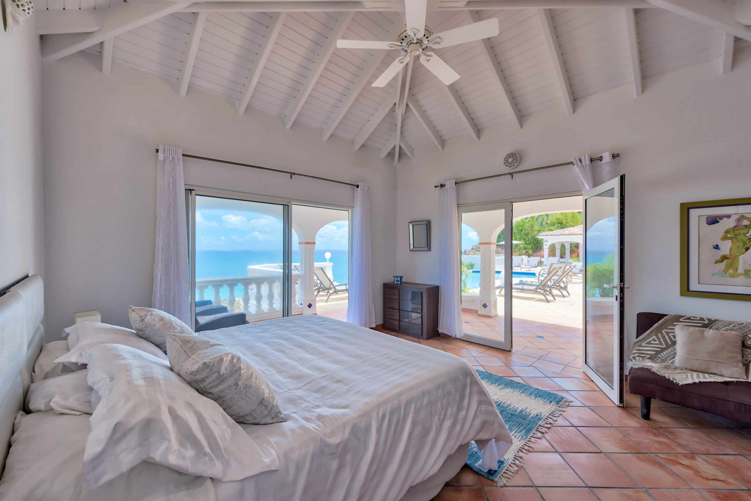 The lovely Villa Mezel has a large airy living area opening onto an expansive covered terrace and an infinity pool with breathtaking views towards Baie Rouge and the island of Anguilla.