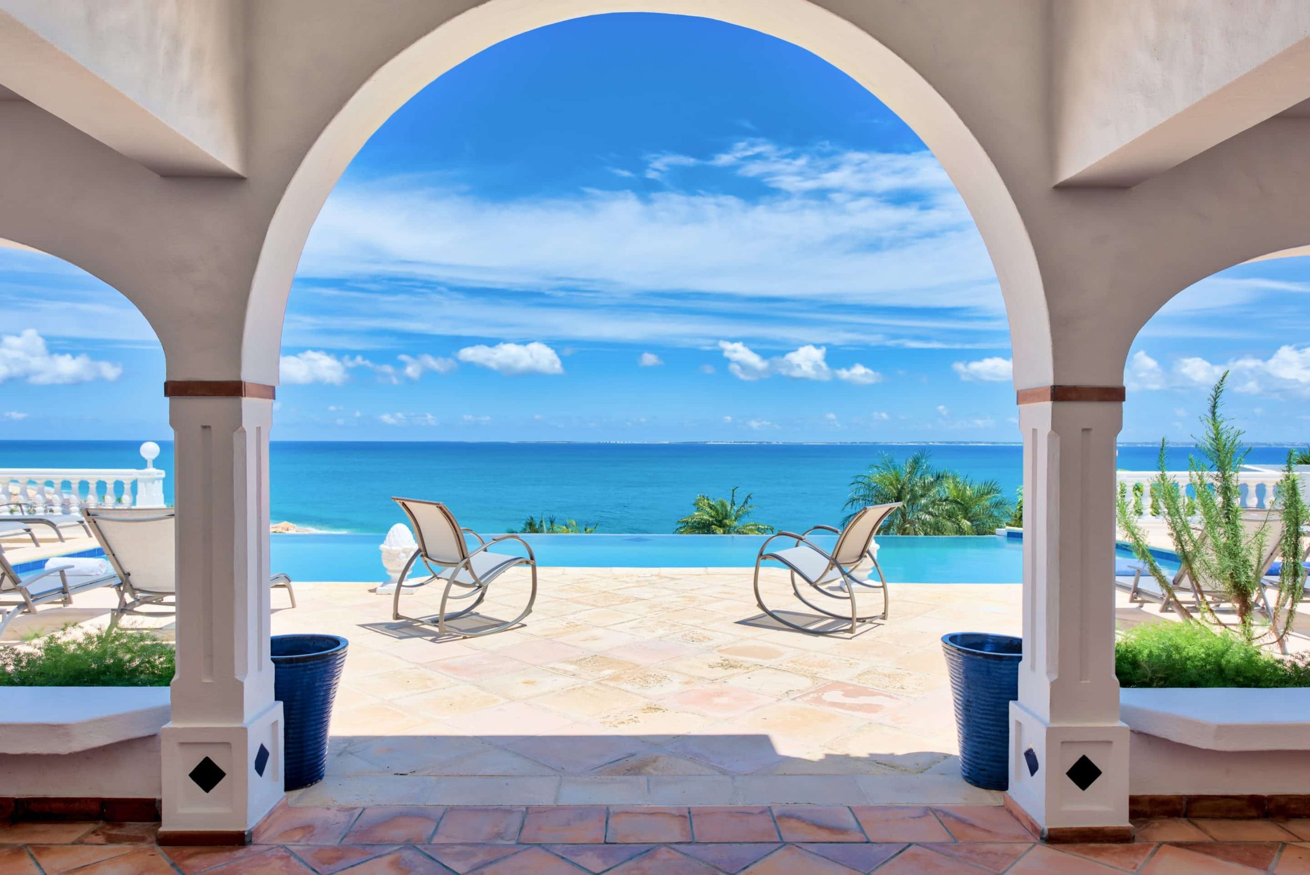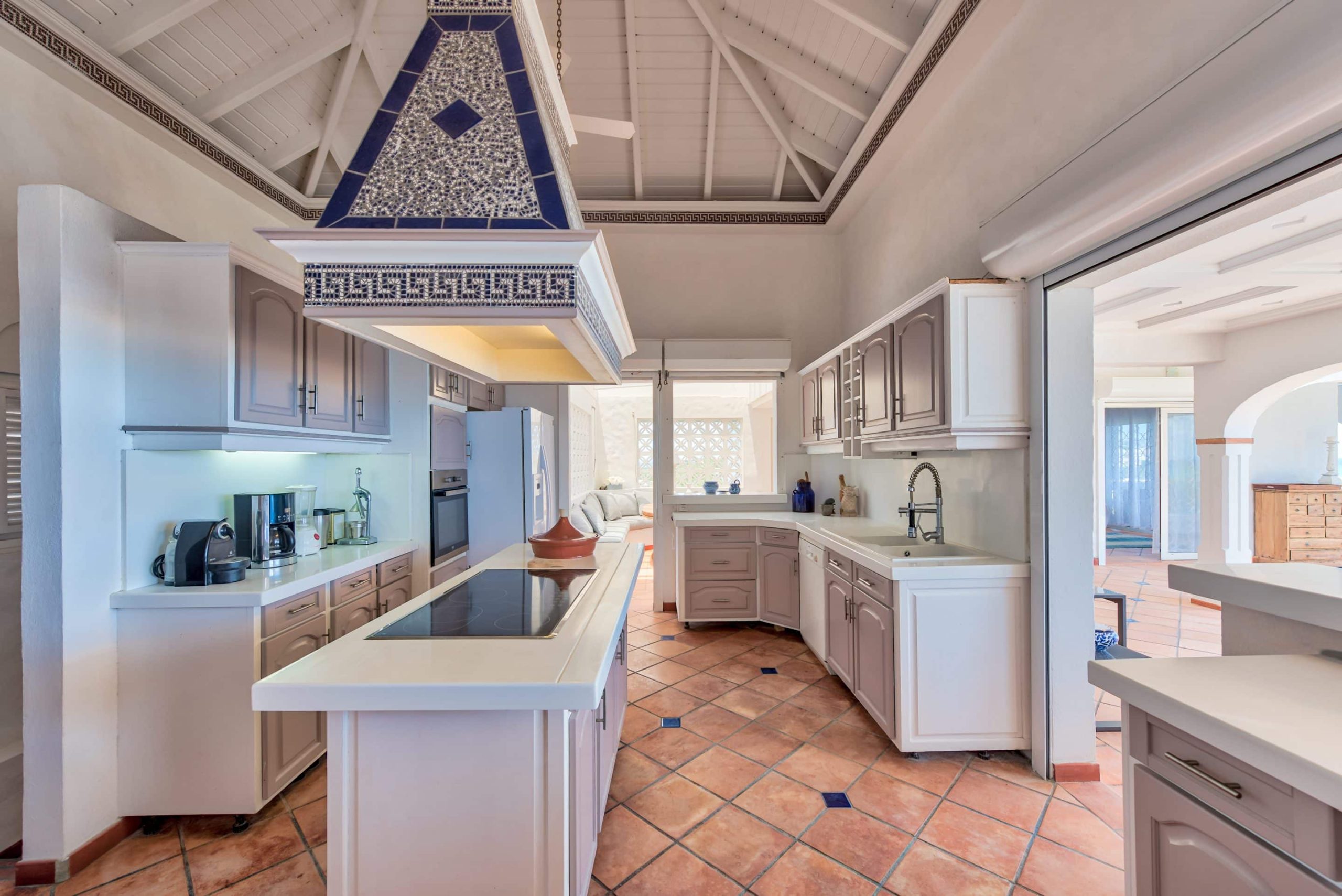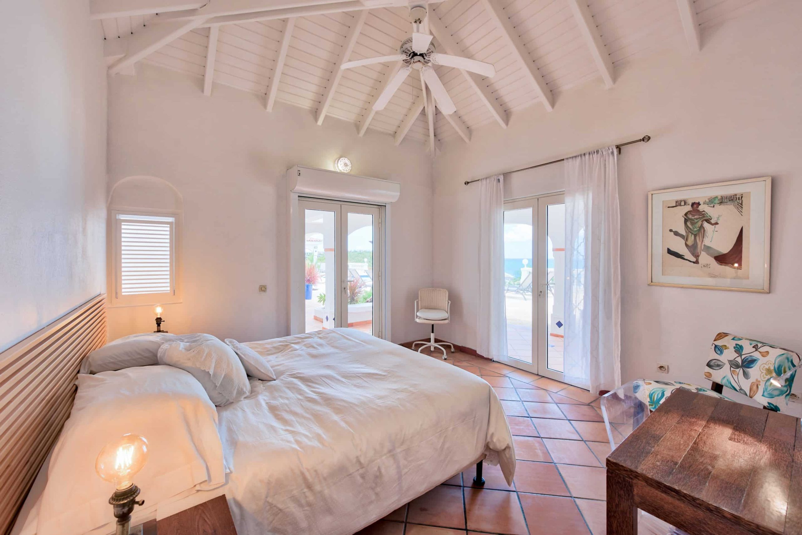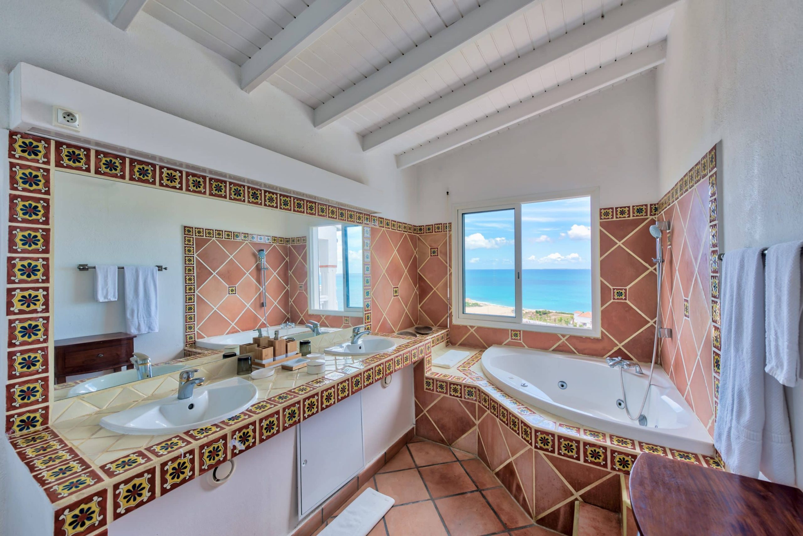 The lovely Villa Mezel has a large airy living area opening onto an expansive covered terrace and an infinity pool with breathtaking views towards Baie Rouge and the island of Anguilla.