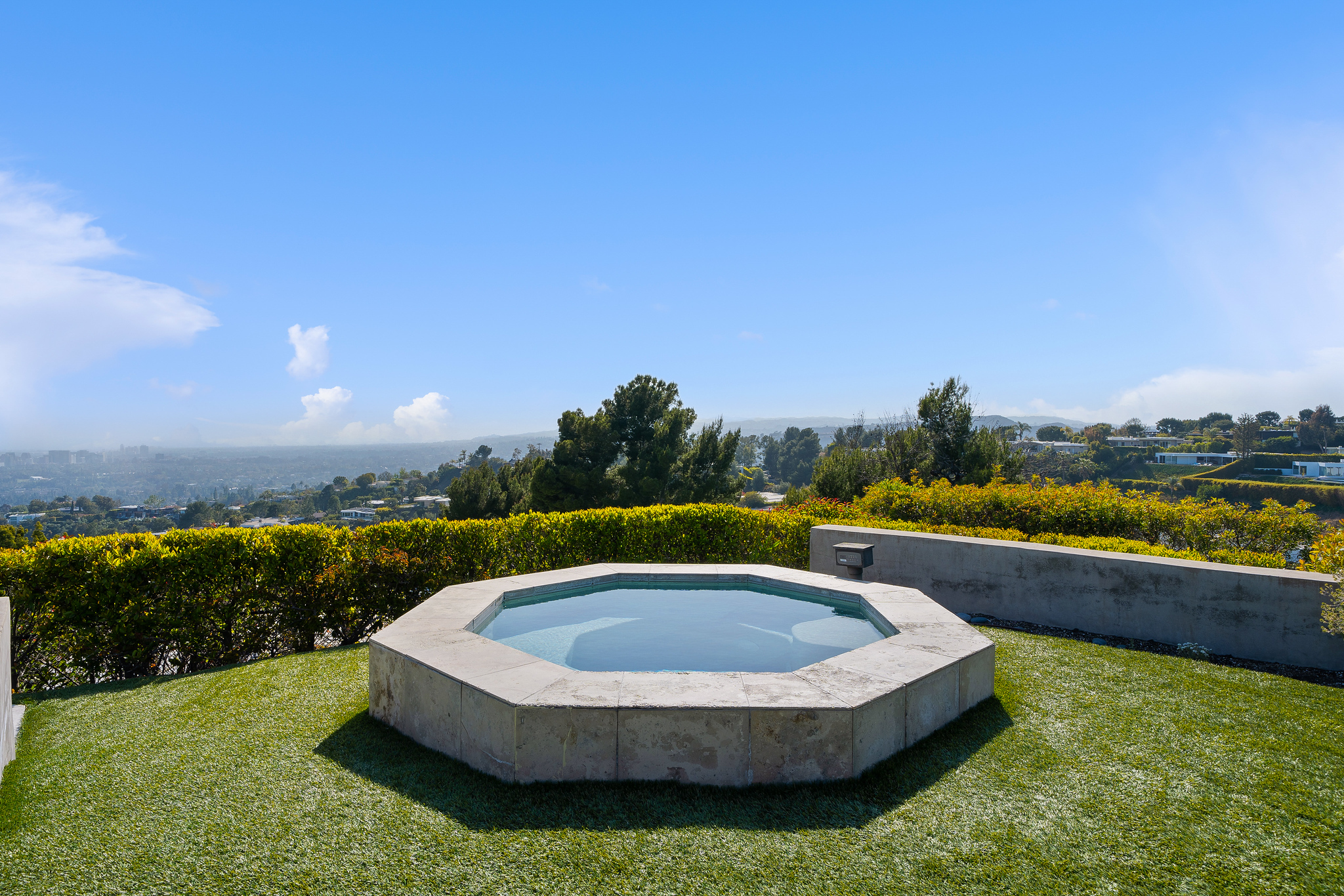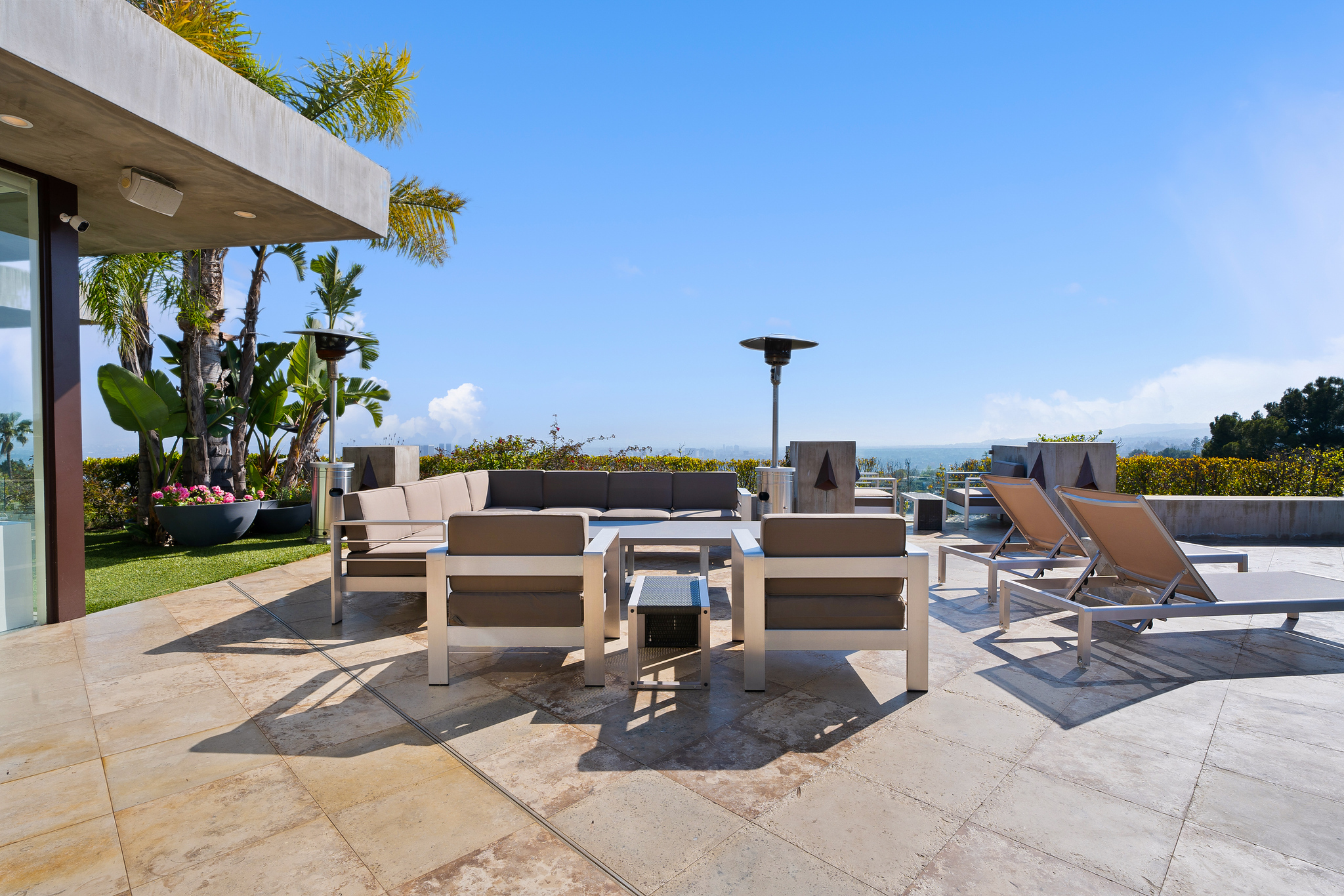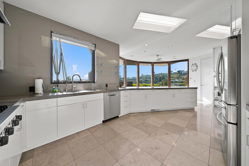 Nestled at the end of a cul-de-sac atop a cliff, this exquisitely appointed mid-century modern residence offers a private and secure retreat. Beyond the gated courtyard and double-door glass entry, you’ll find an expansive living and dining area with 12-foot ceilings, a fireplace, and gleaming polished stone floors. A vast expanse of glass doors reveals breathtaking city and ocean vistas, seamlessly connecting the interior to the lush terrace and garden below. Enjoy the solar-heated pool and spa, surrounded by endless views, as well as outdoor seating enclaves with a fireplace and a fully equipped outdoor kitchen.