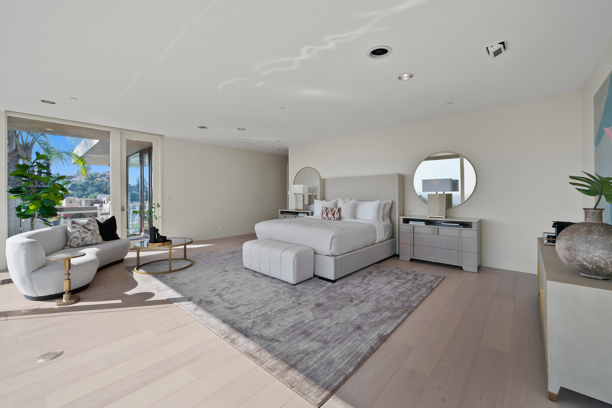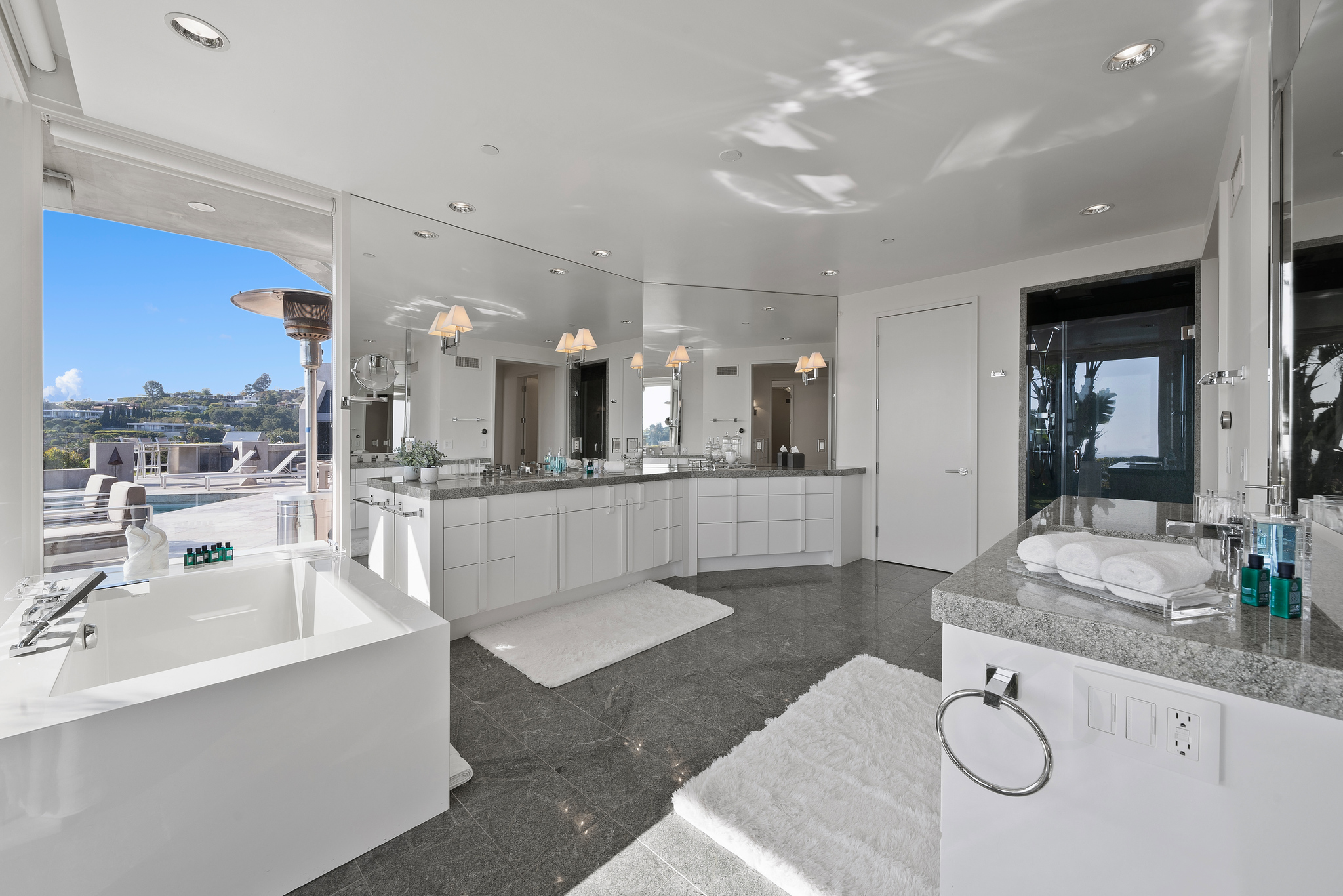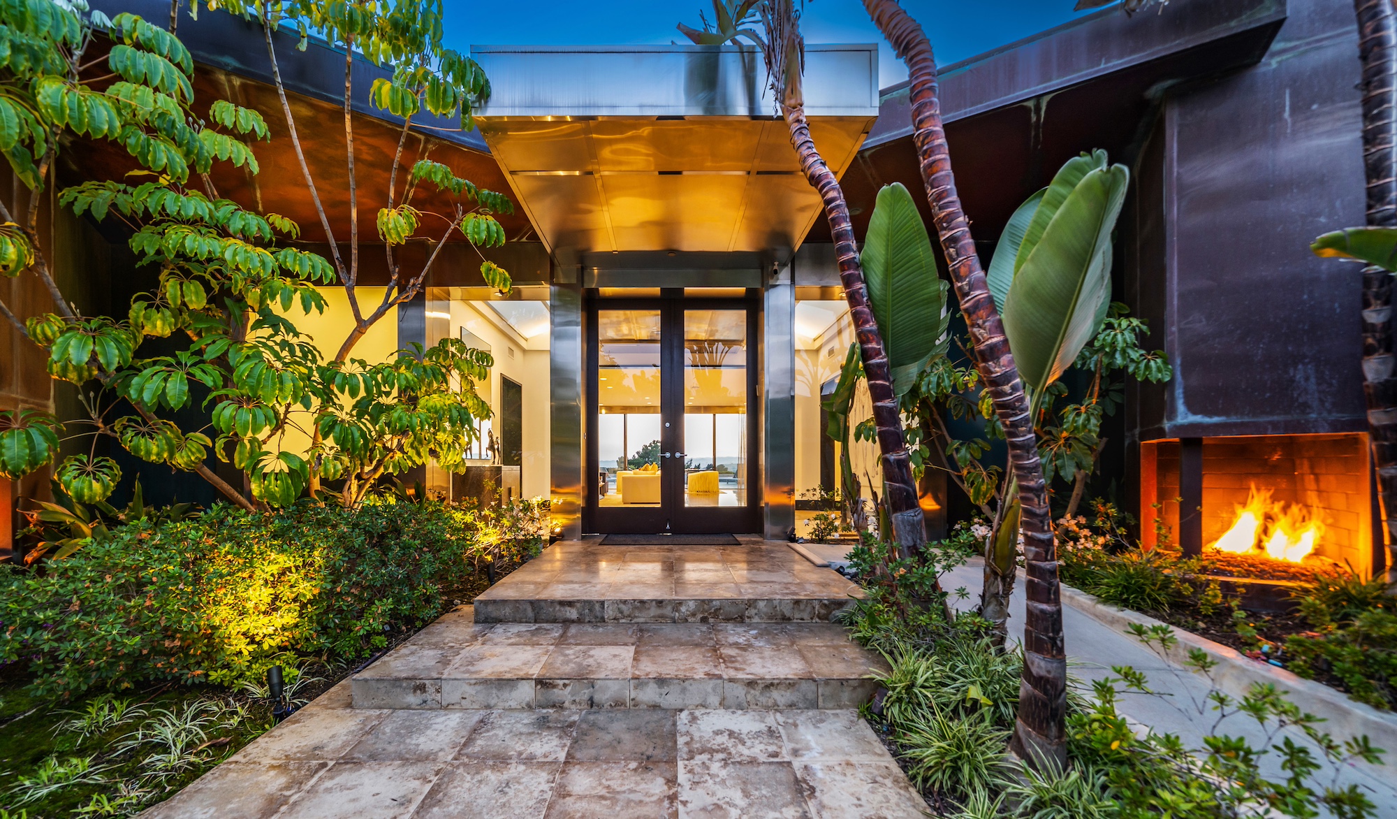 Nestled at the end of a cul-de-sac atop a cliff, this exquisitely appointed mid-century modern residence offers a private and secure retreat. Beyond the gated courtyard and double-door glass entry, you’ll find an expansive living and dining area with 12-foot ceilings, a fireplace, and gleaming polished stone floors. A vast expanse of glass doors reveals breathtaking city and ocean vistas, seamlessly connecting the interior to the lush terrace and garden below. Enjoy the solar-heated pool and spa, surrounded by endless views, as well as outdoor seating enclaves with a fireplace and a fully equipped outdoor kitchen.