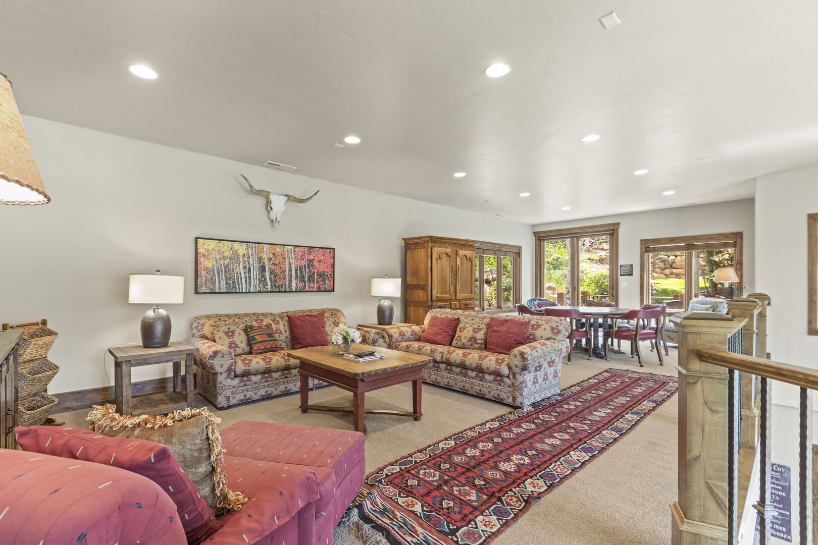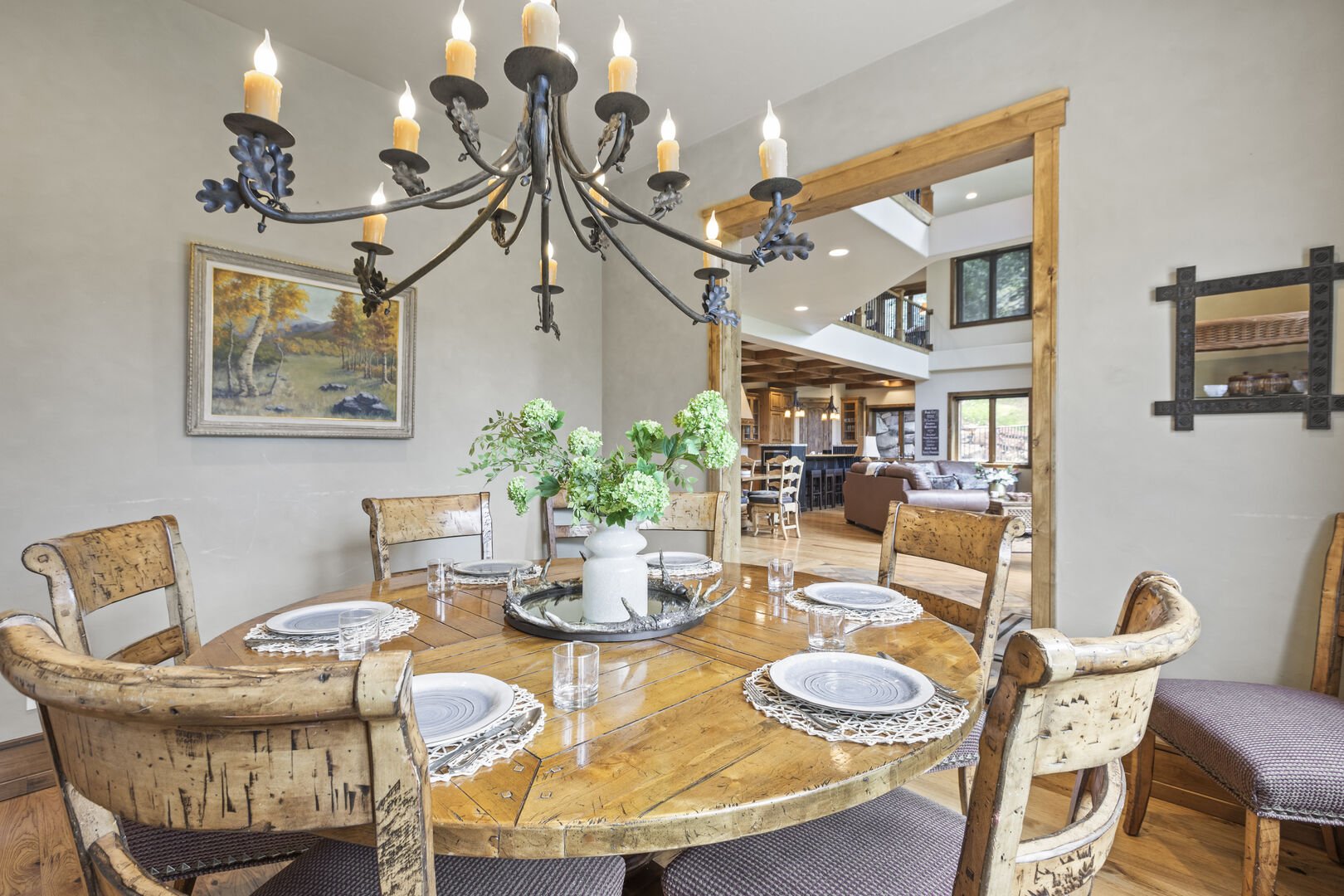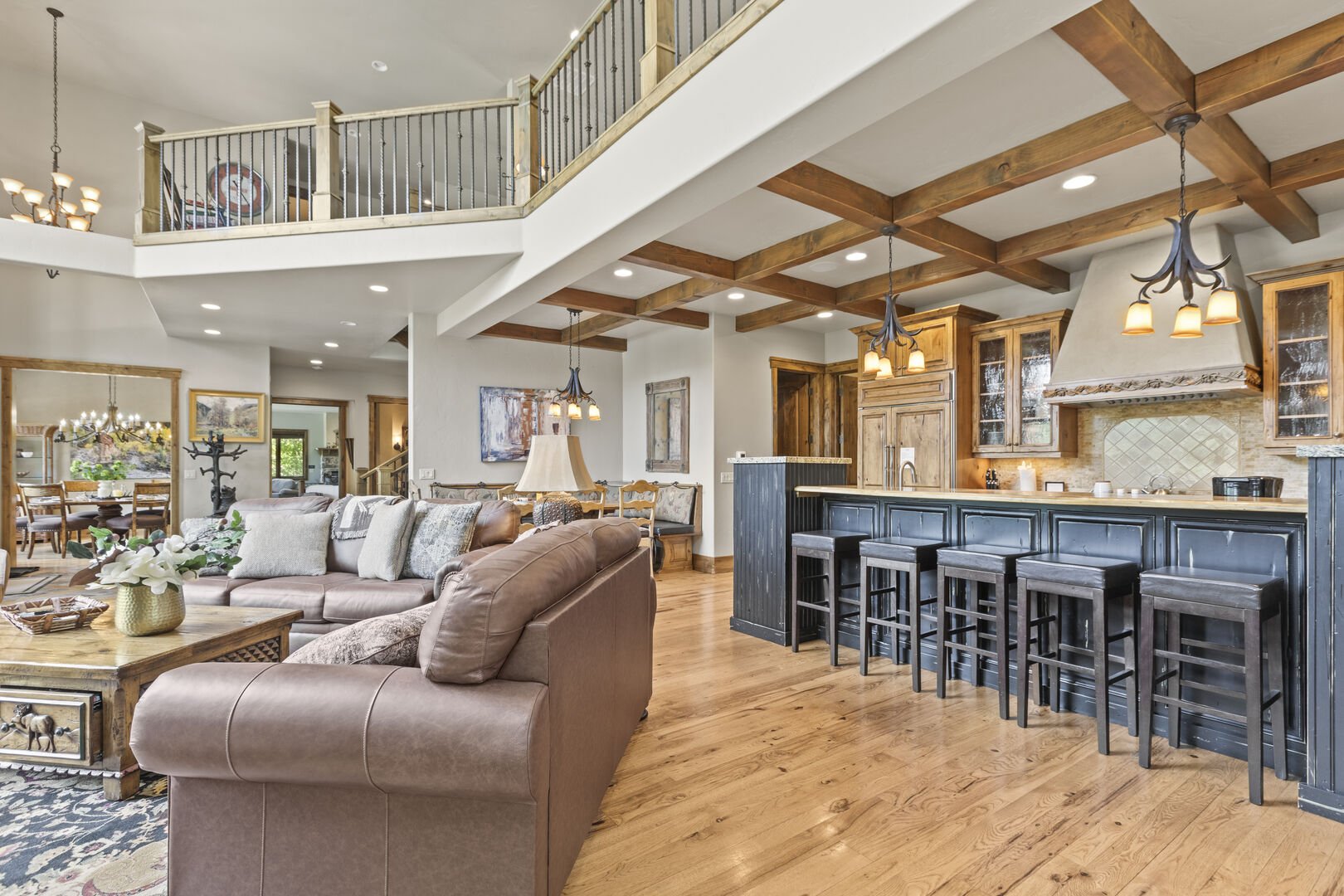 The lodge’s furnishings and finishes pay homage to the nostalgic western aesthetic—rustic hardwoods, expansive windows framing the mountains, soaring vaulted ceilings, and classic mountain décor. From the moment you step inside, you’re welcomed by a stunning flagstone fireplace, deep leather seating, beautiful wood details, and artwork inspired by the region’s natural beauty.