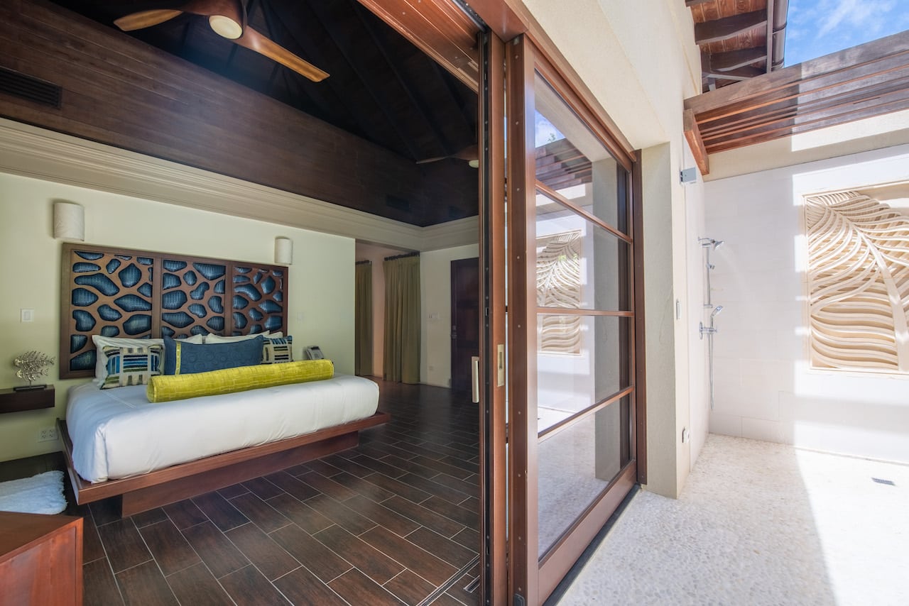 Diamond – This master suite is located on the ground floor of the Main House with a private entrance and convenient access to the great room, swimming pool and beach. A heated plunge pool with expansive ocean views is enjoyed from the private lounging terrace and the spacious bathroom also features an outdoor shower