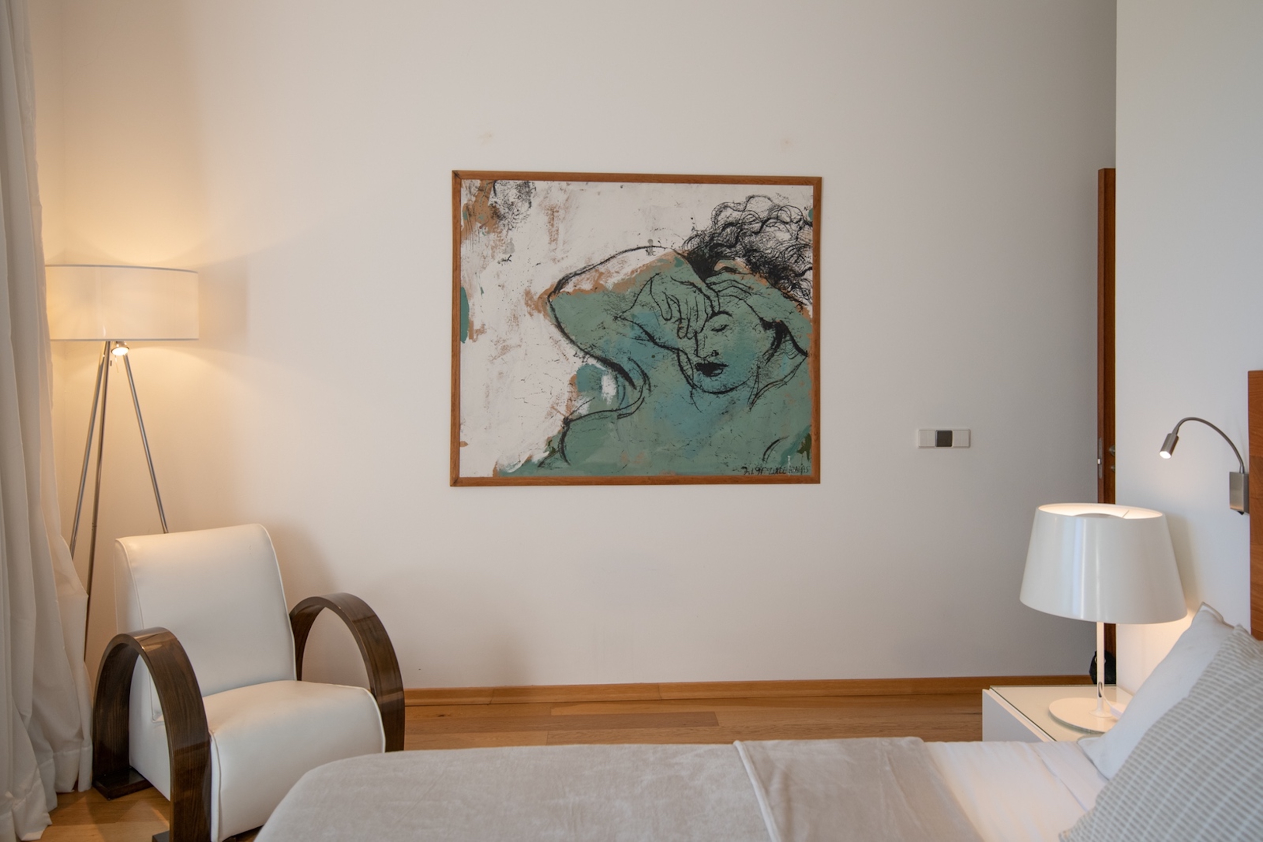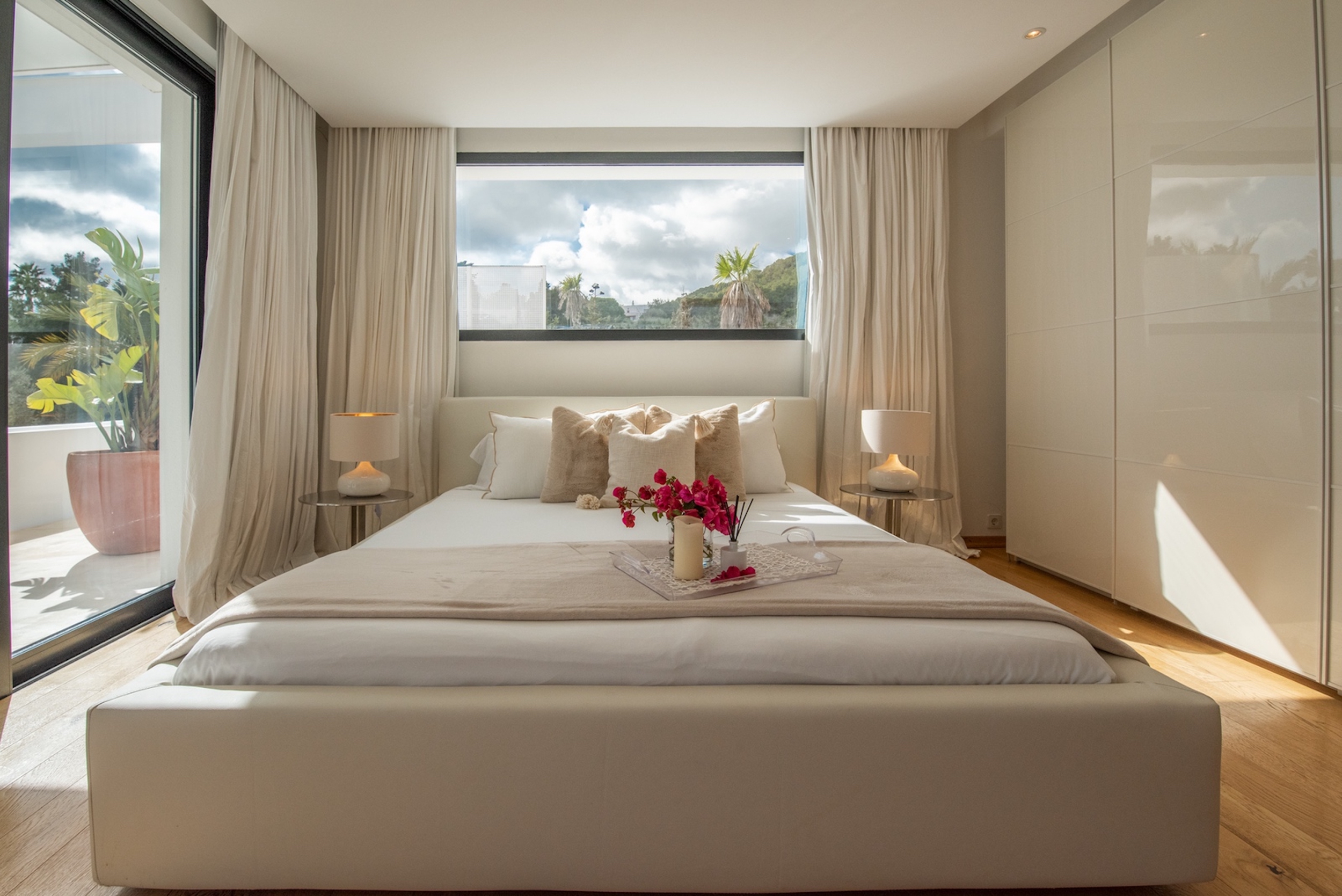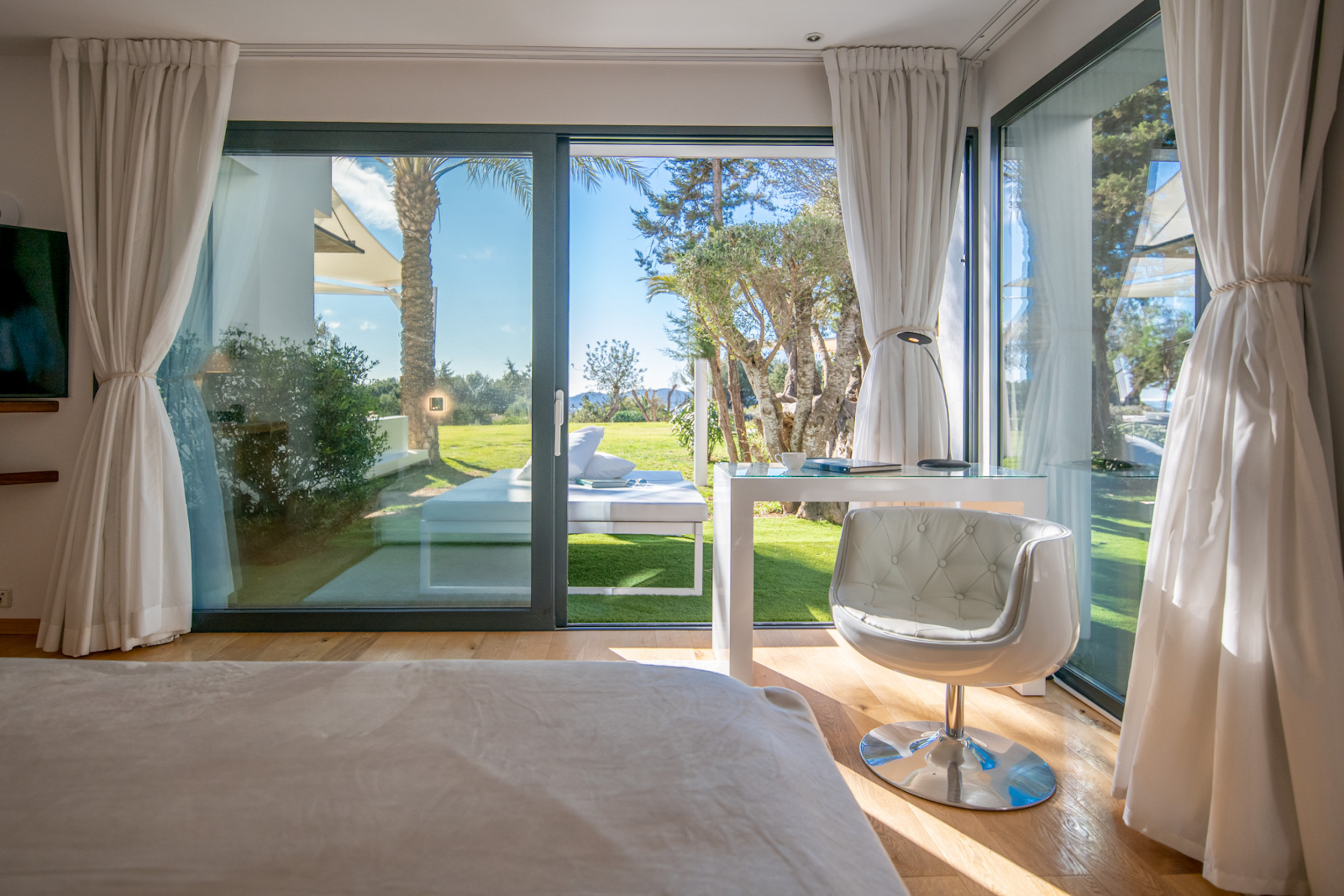 The immaculate interiors of this modern Oasis feature light-filled living rooms and spacious bedrooms with private terrace areas. Sliding glass doors open the bright, sleek kitchen to an al-fresco dining table overlooking a garden of Mediterranean shrubs. Or, if you prefer to sit inside, pull up a chair at the sunny breakfast table or glossy breakfast bar. The main living space, with gleaming tiled floors, white walls and vast cream sofas, opens onto a further terrace with lounge seating and beautiful sea views.