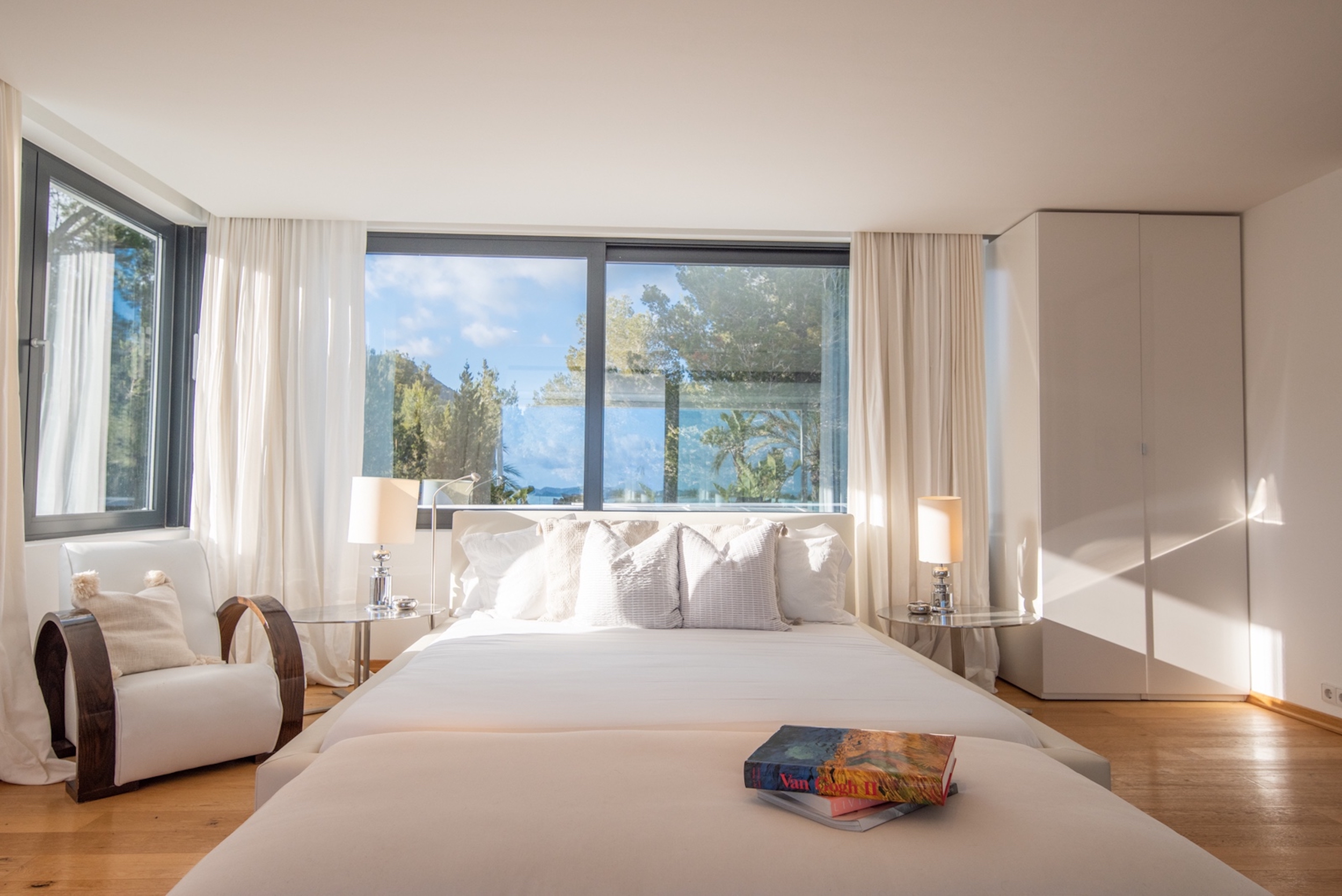 This spacious villa combines modern Ibizan chic with cracking views towards the sparkling Balearic Sea, Las Salinas salt flats, and Ibiza Town. Here, you’re close to the beautiful beaches of Salinas and Cala Jondal, as well as the renowned beach bars of Ibiza’s south coast.