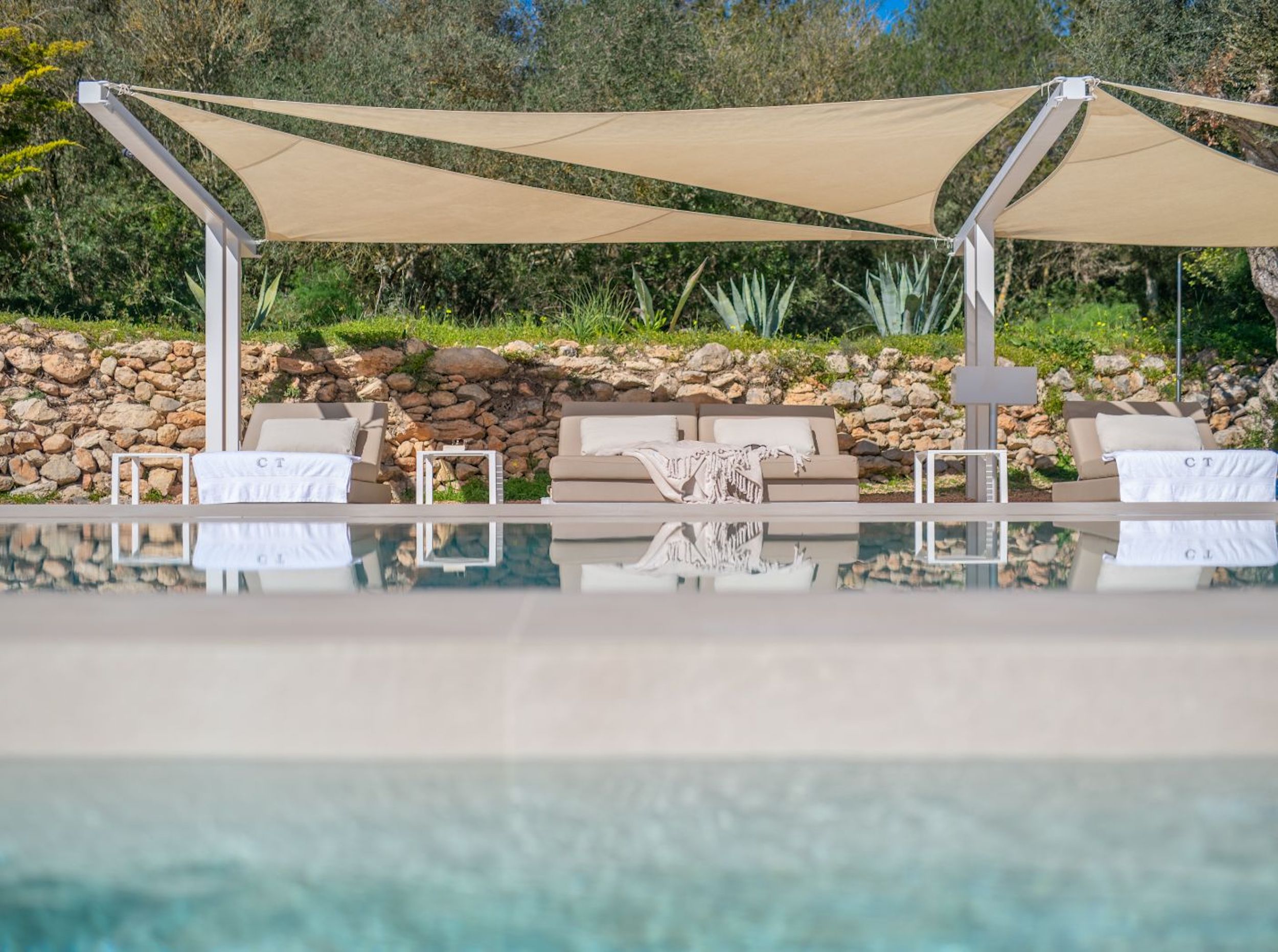 Beside the pool, an ancient olive tree and a white gazebo provide suitable shade for a poolside chill-out area. This is a great place to relax – by day or by night – on the white sofa seating.