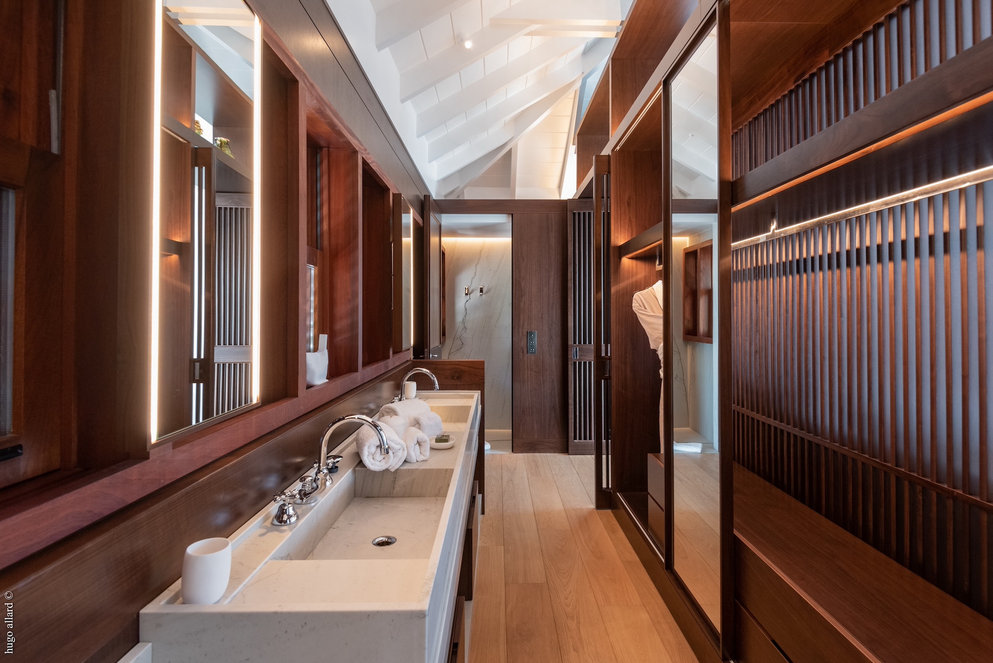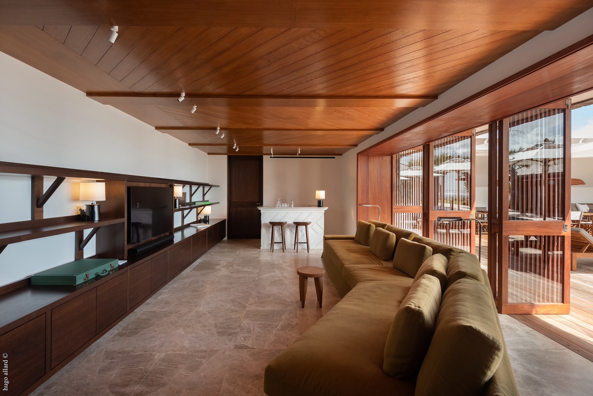 The four bedrooms, each spacious and refined, come complete with their own meticulously crafted bathrooms featuring high-quality materials. Flanking either side of the pool are the first two bedrooms. Ascend the stairs from the second living room to reach the master bedroom. The fourth bedroom is tucked away at the end of a small path accessible from the terrace.