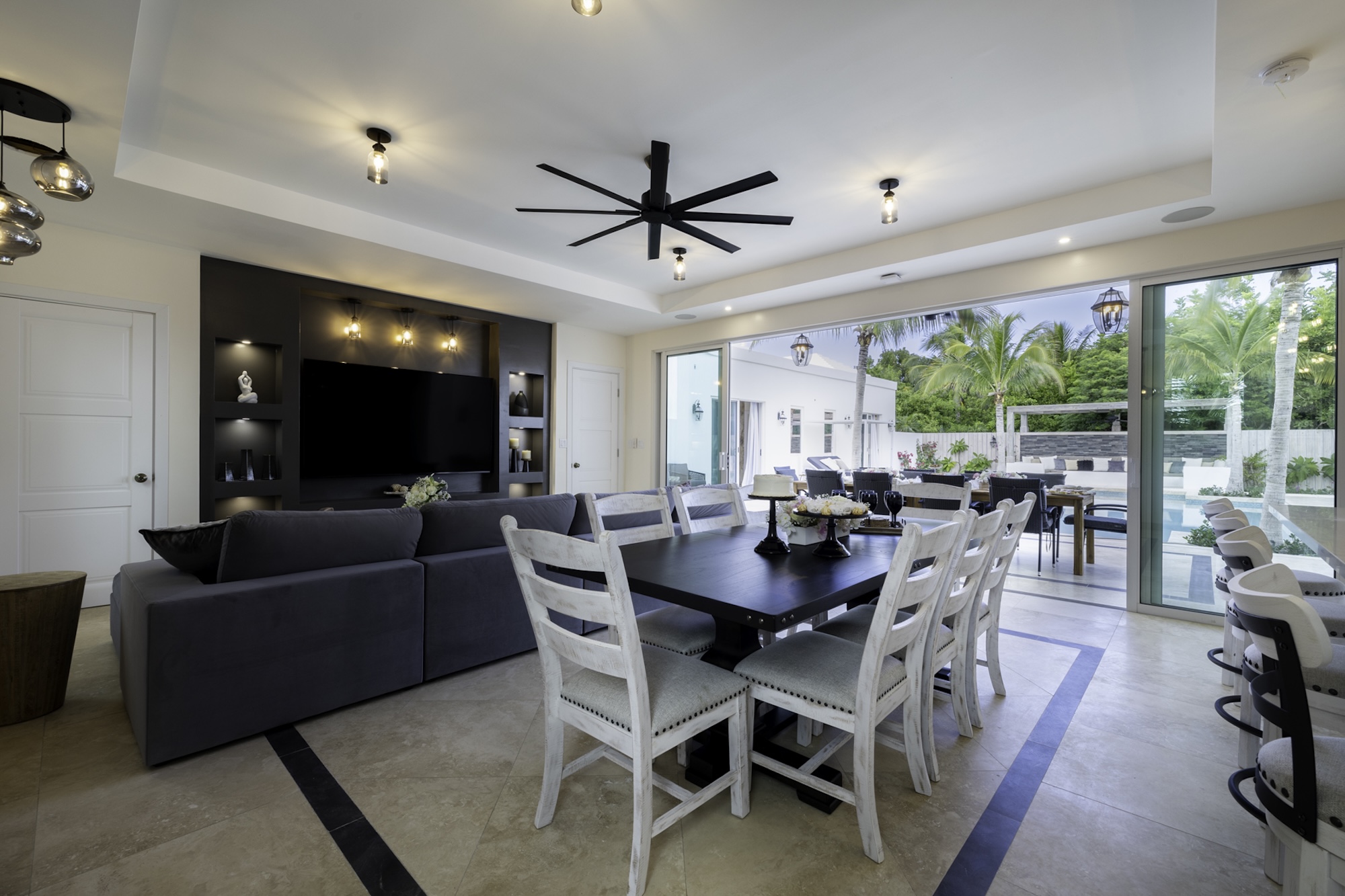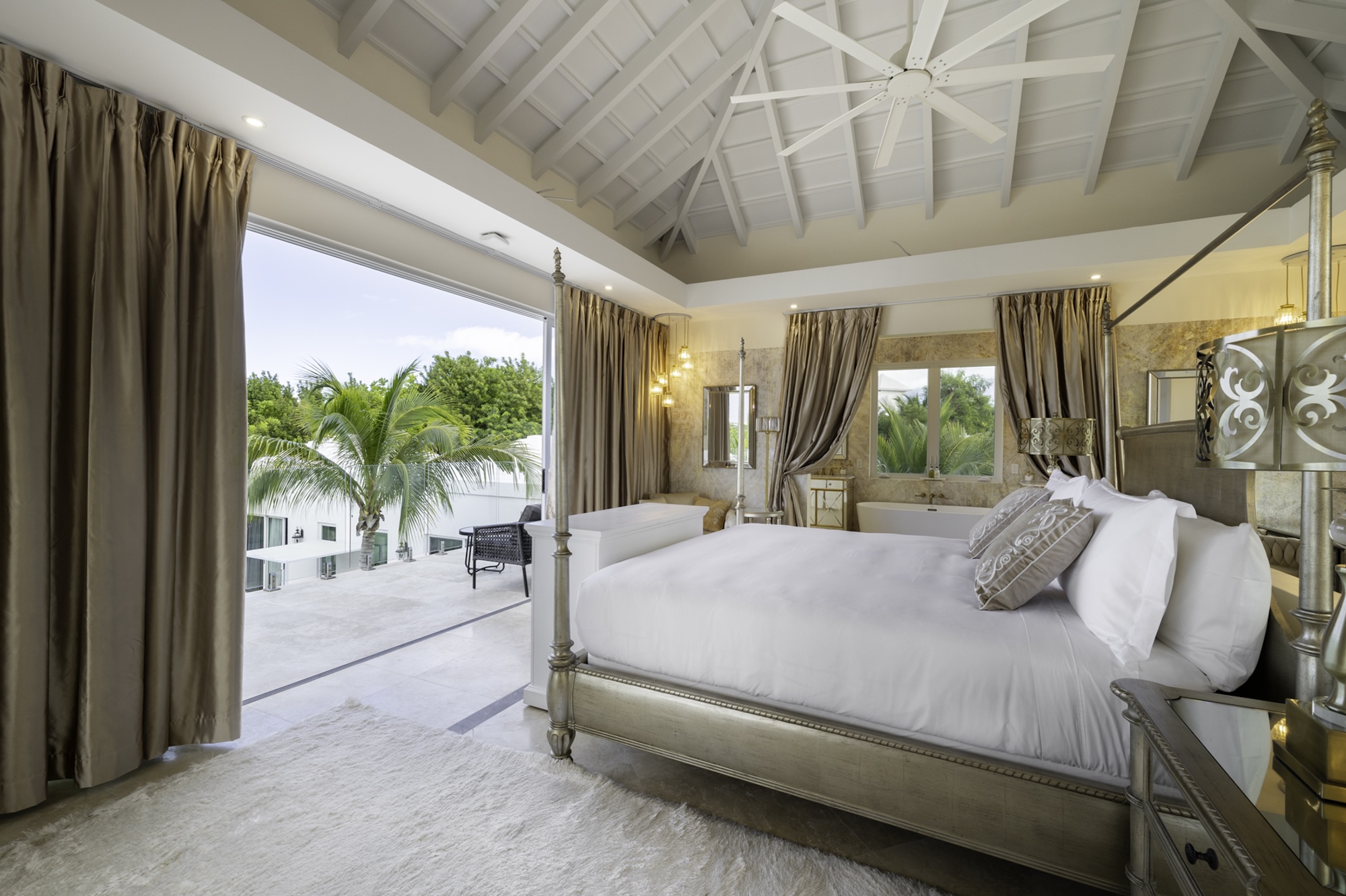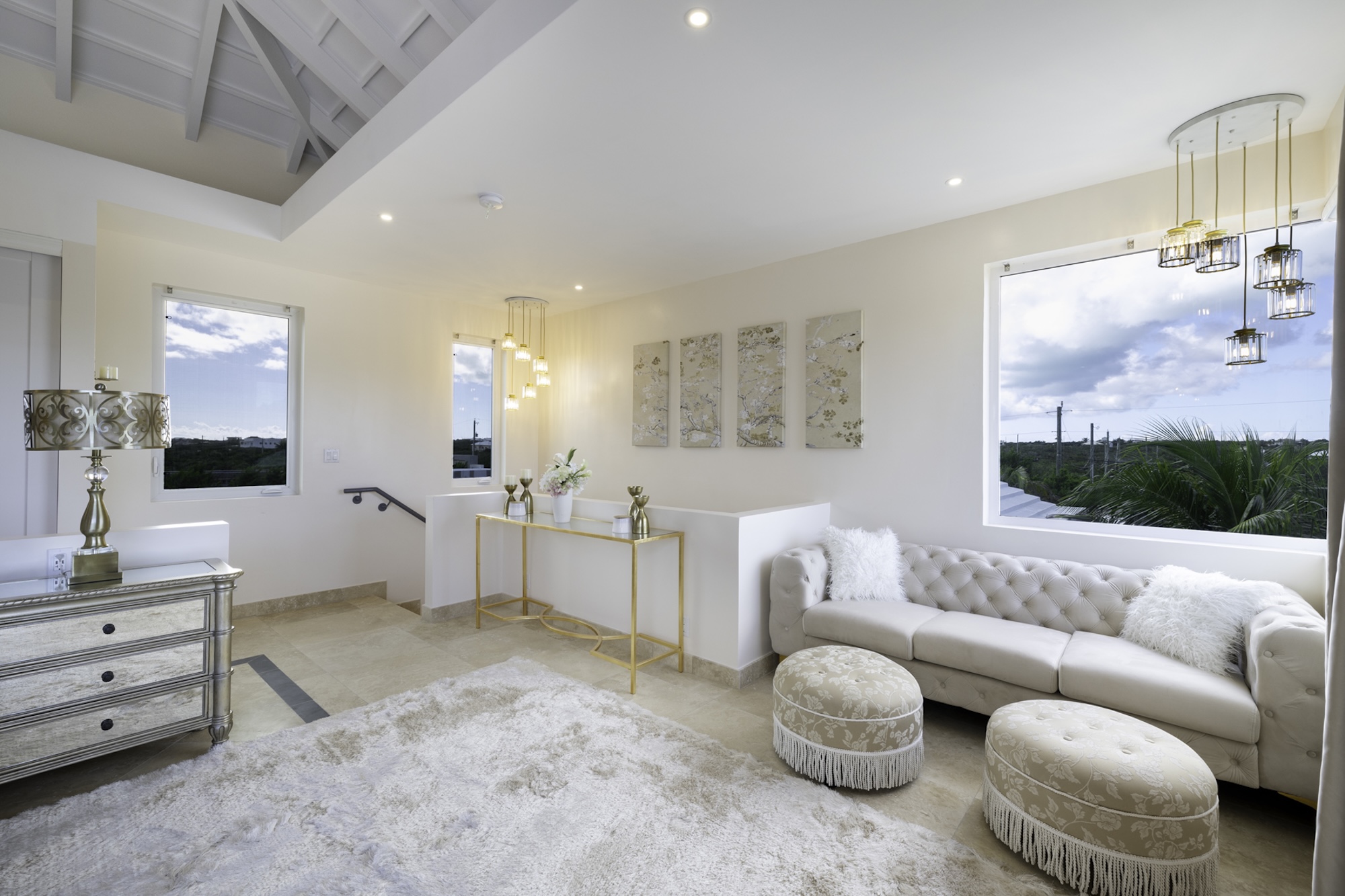 Pearl West offers uninterrupted views of the Caicos Banks, blending contemporary design with Caribbean barefoot luxury. This 12,000-square-foot villa seamlessly integrates indoor and outdoor living with lush landscaping, expansive decks, and tranquil lagoons. High vaulted ceilings and overhead fans create an airy, breezy ambiance.