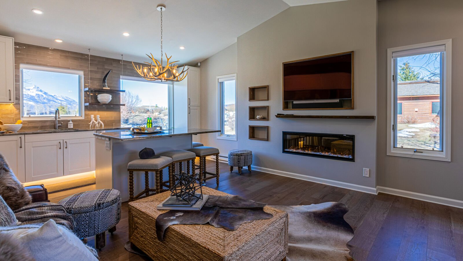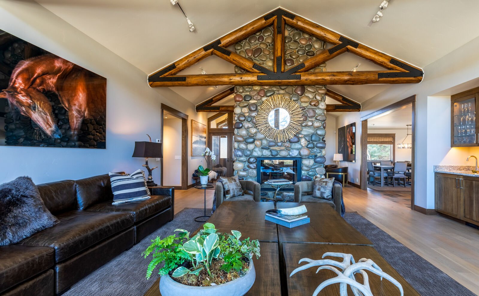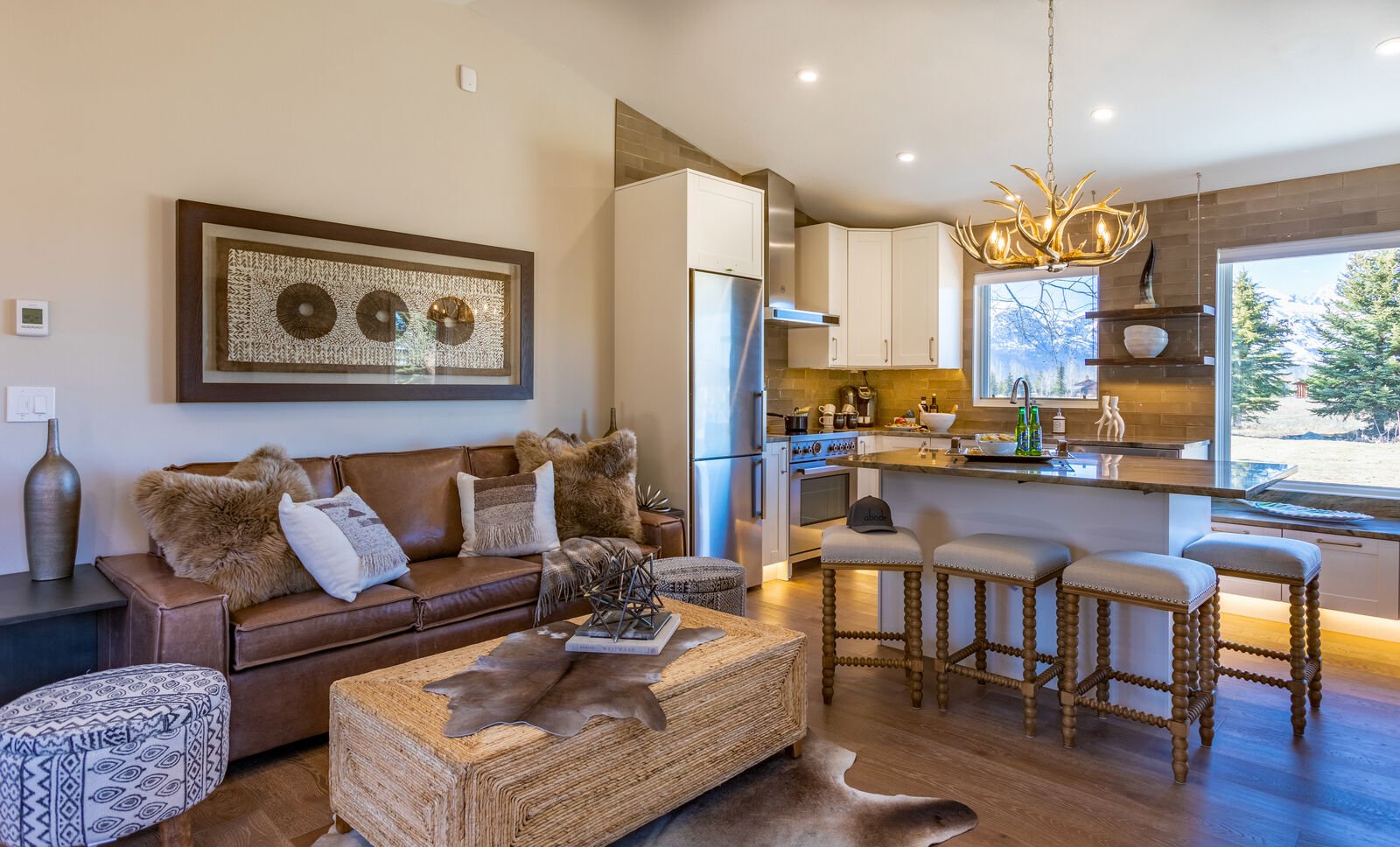 One of the most immersive ways to appreciate the area’s natural beauty is through its abundant wildlife. From the comfort of the living room or the expansive backyard, guests can witness the awe-inspiring elk migration, often visible year-round as thousands of elk journey into the valley in search of warmth and nourishment. The backyard is a private paradise—featuring a tranquil pond and waterfall, a built-in firepit for starlit storytelling, and a spacious deck with a Weber grill, outdoor dining table, and plush lounge seating.