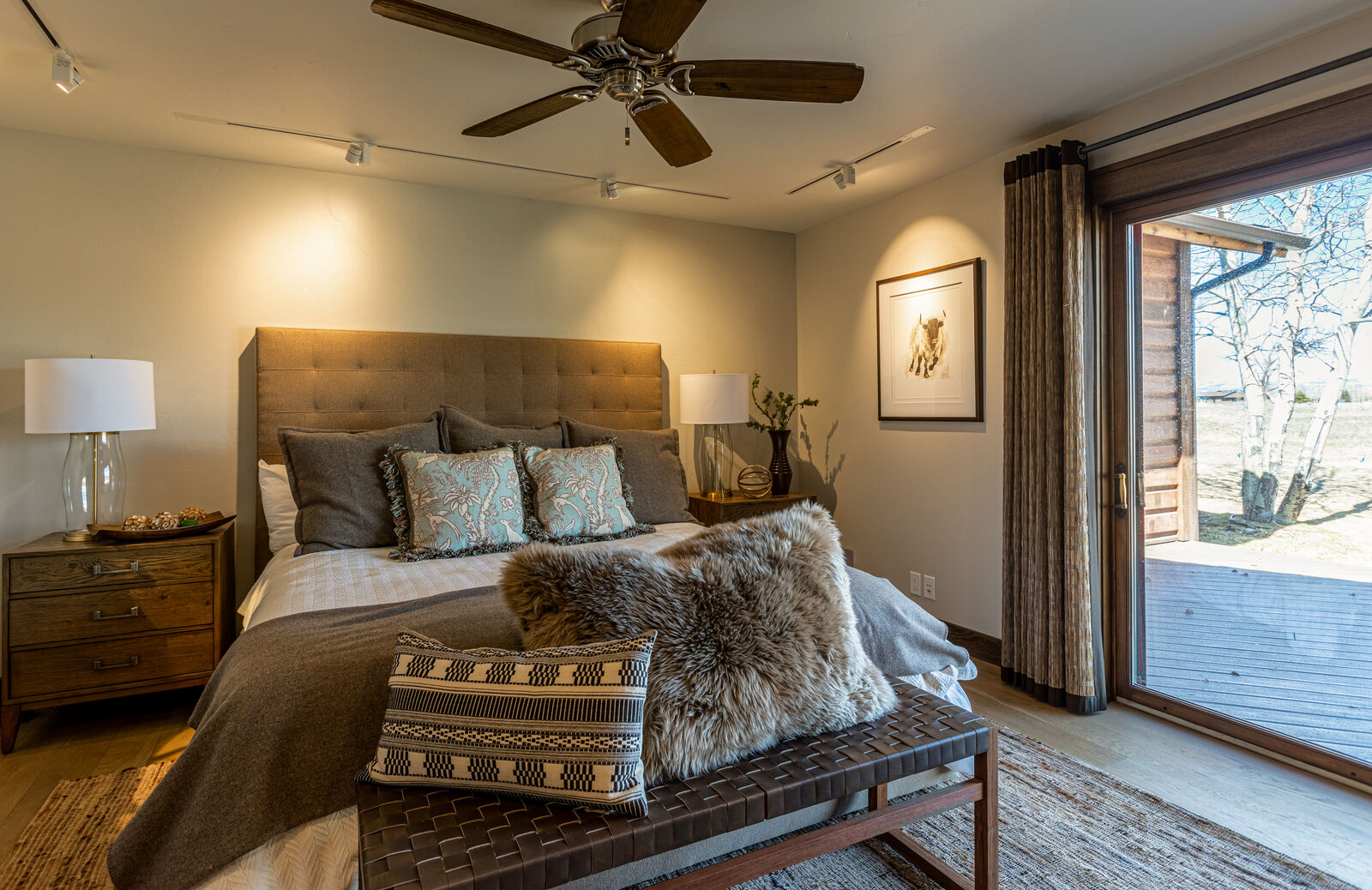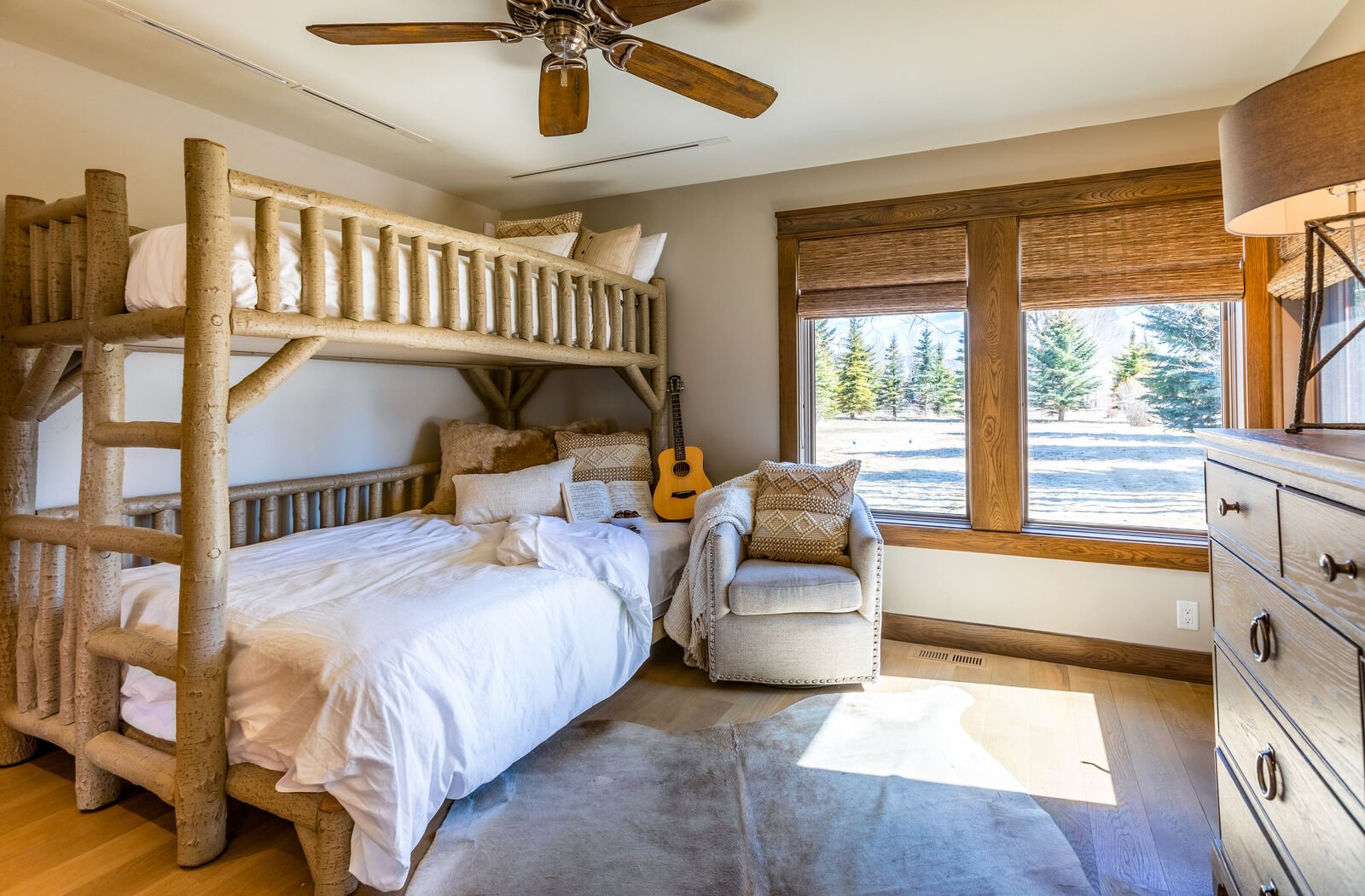 For those seeking a bit more privacy, the detached guest house is a charming self-contained retreat just steps away. It sleeps 5–7 with a king bed in one room and a twin-over-twin bunk plus a separate twin in the second bedroom. A shared bathroom and open-concept living space with a gas fireplace, full kitchen, and sleeper sofa round out the home—complete, of course, with awe-inspiring views of the Tetons.