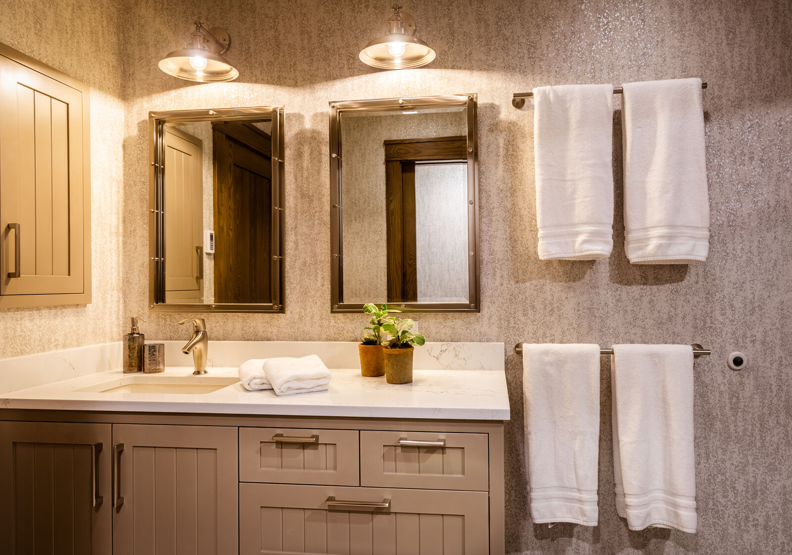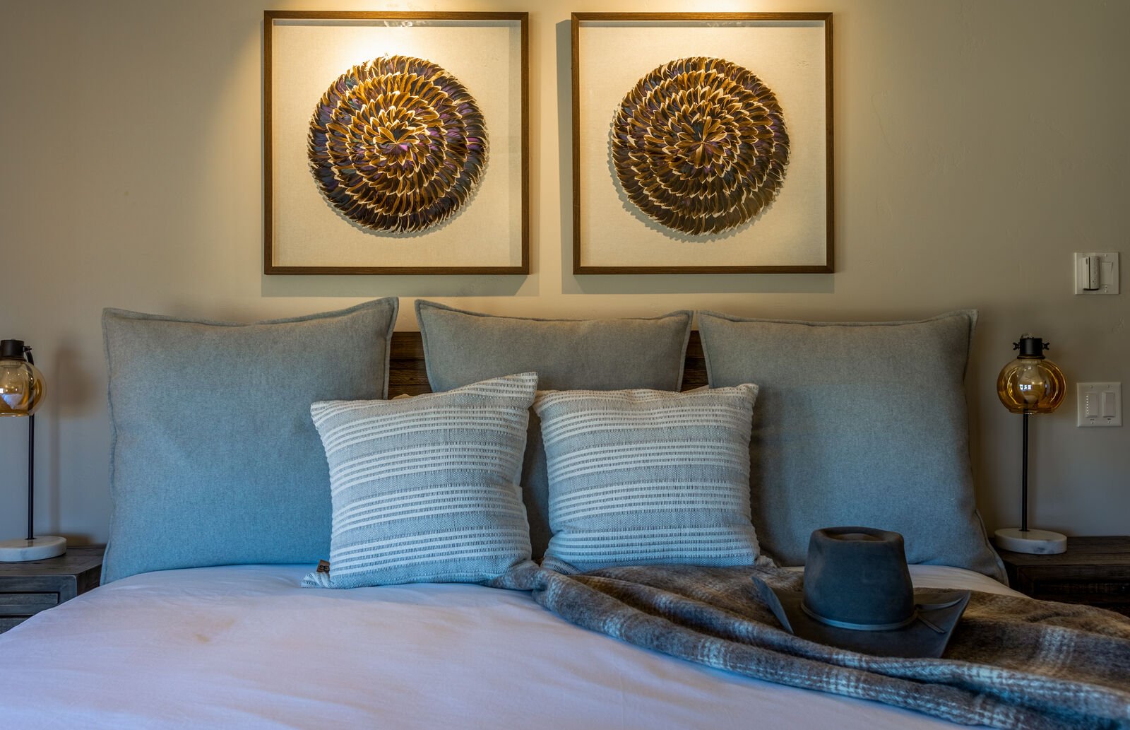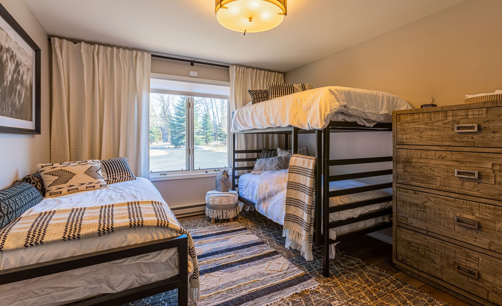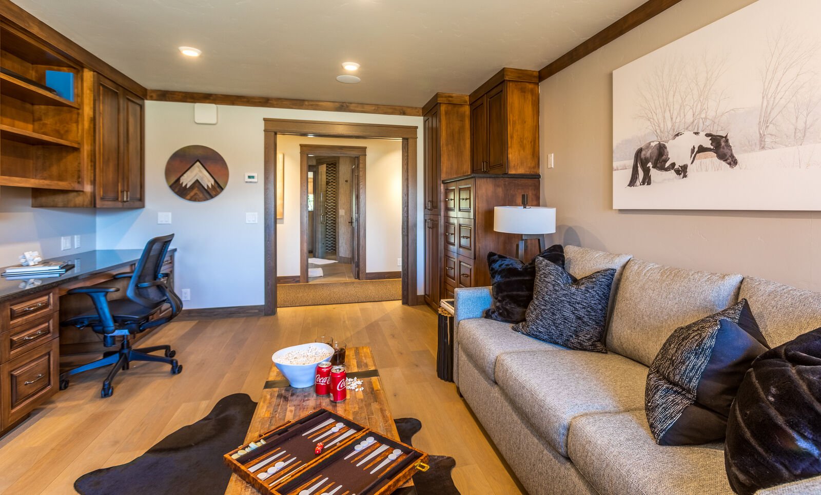 Also located in the main house are three beautifully appointed guest suites. Two feature king beds, TVs, and generous storage, while the third is an inviting bunk room perfect for kids, offering a twin-over-queen bunk, ample dresser space, and a cozy hangout spot. Down the hall, a dedicated remote work office offers two built-in desks with mountain views, a TV, and a queen sleeper sofa—ideal for additional guests or focused productivity.
