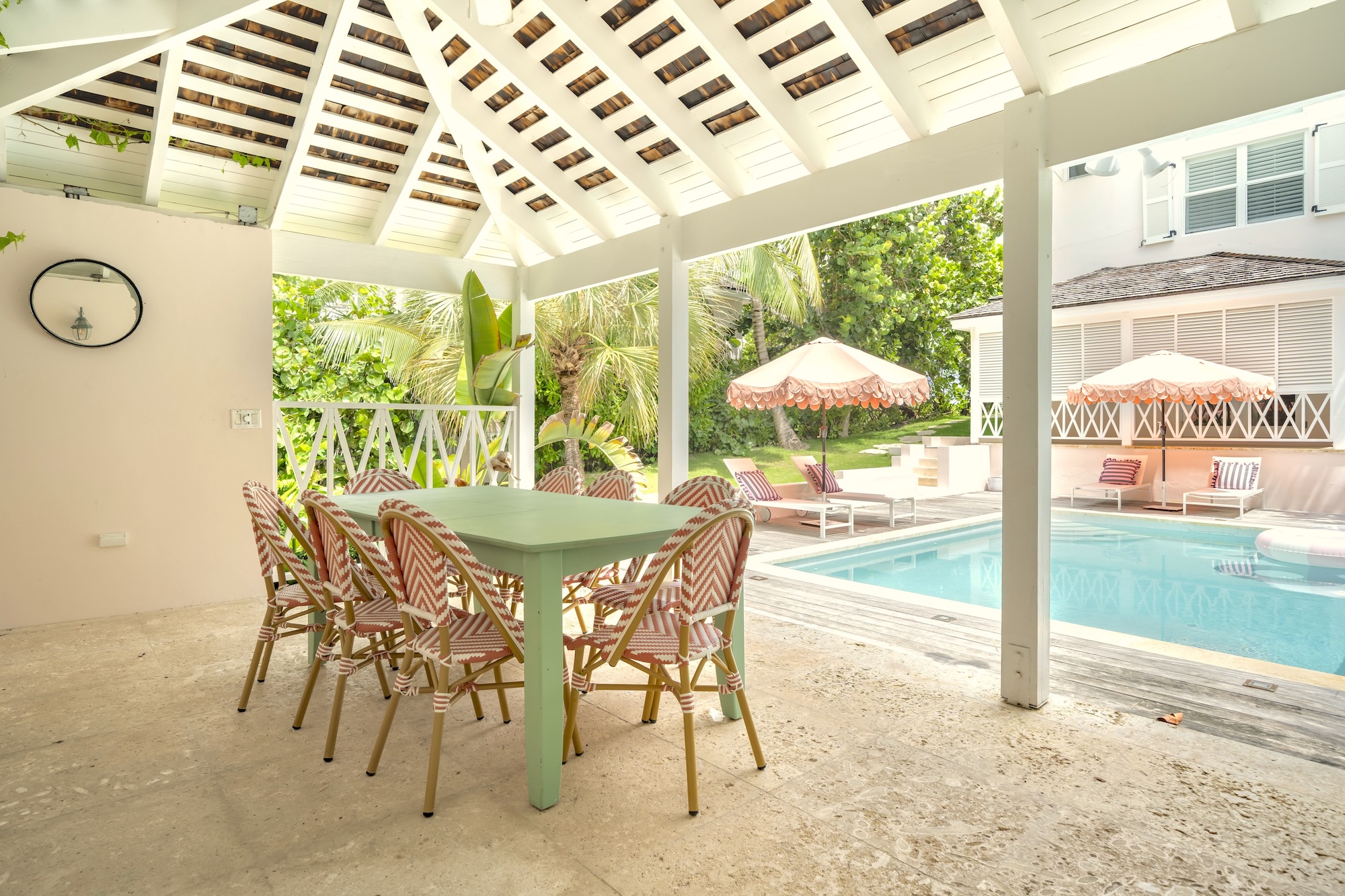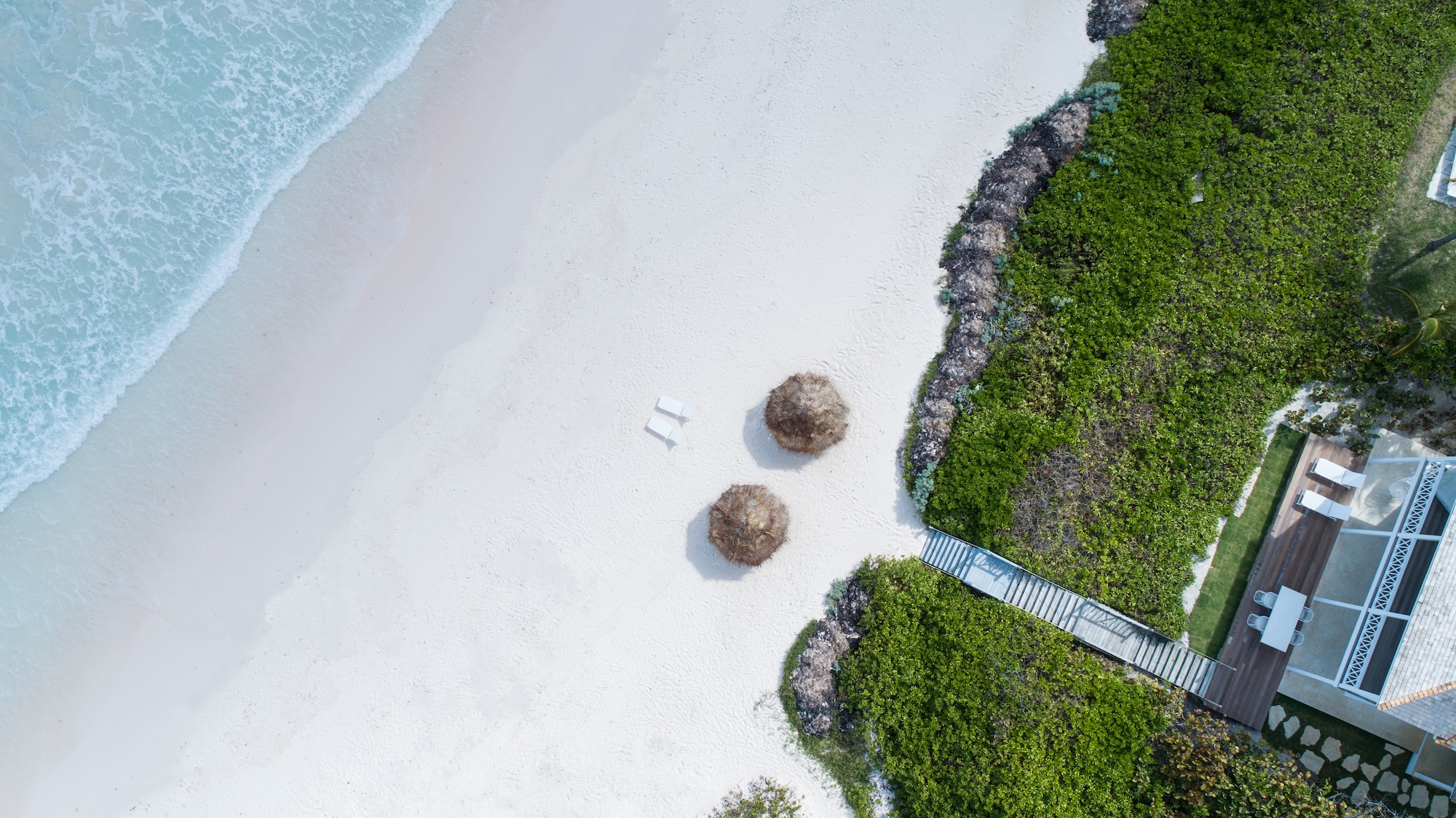 Outdoors, you step directly onto pink sand from the property — two private thatched beach umbrellas and lounge chairs await for peaceful beach days. The private swimming pool is there to unwind, as well as an outdoor cabana for al-fresco dining or sun-soaked lounging. The house is surrounded by lush tropical landscaping, adding to the sense of privacy and seclusion. For the more active, a dedicated office/gym space — fitted with a Peloton bike (bring your cleats), yoga mats and weights — allows you to maintain your fitness routine.