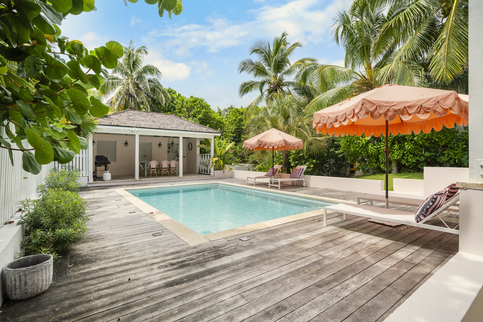 Outdoors, you step directly onto pink sand from the property — two private thatched beach umbrellas and lounge chairs await for peaceful beach days. The private swimming pool is there to unwind, as well as an outdoor cabana for al-fresco dining or sun-soaked lounging. The house is surrounded by lush tropical landscaping, adding to the sense of privacy and seclusion. For the more active, a dedicated office/gym space — fitted with a Peloton bike (bring your cleats), yoga mats and weights — allows you to maintain your fitness routine.