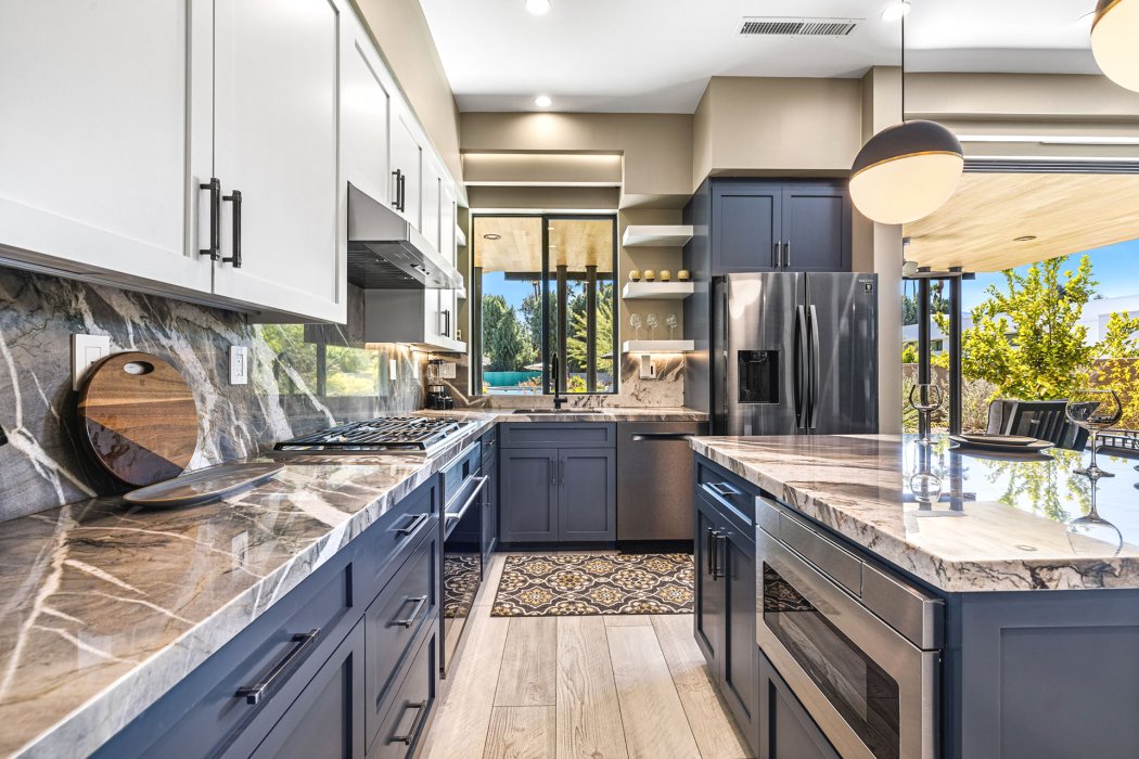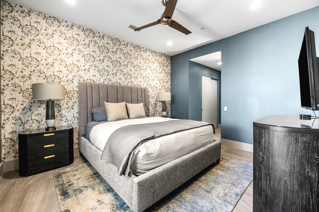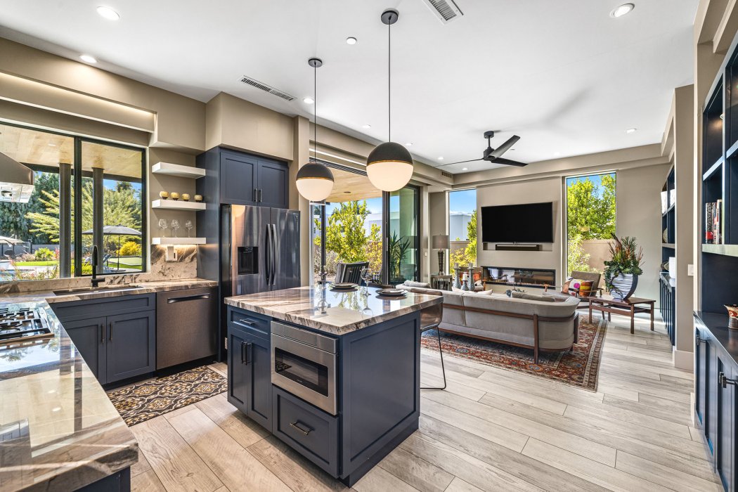 The Guest House offers two bedrooms, a full kitchen, a living area with a fireplace and TV, and the same refined style as the main residence.