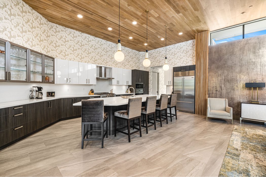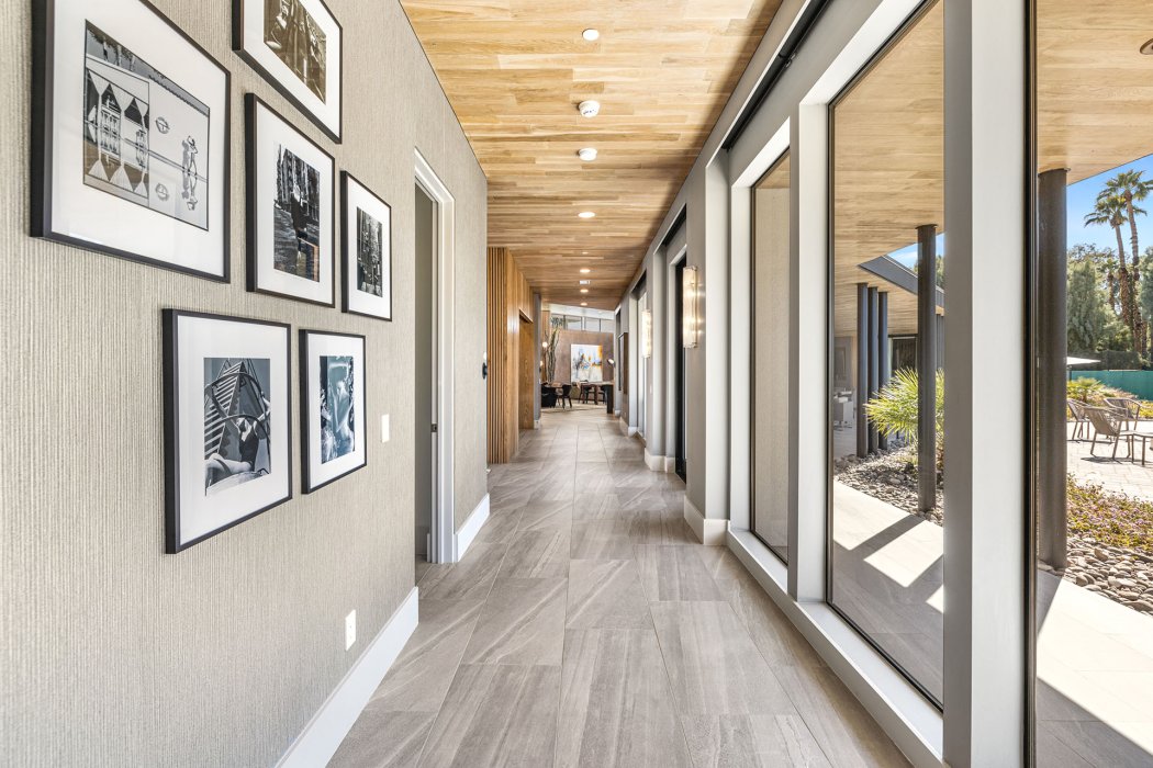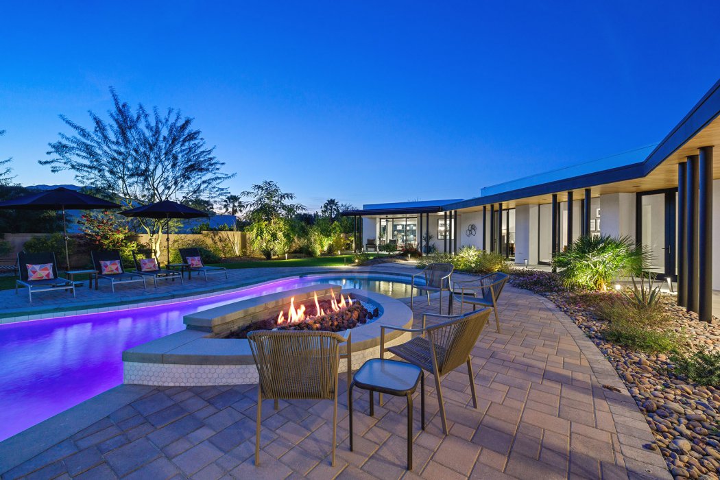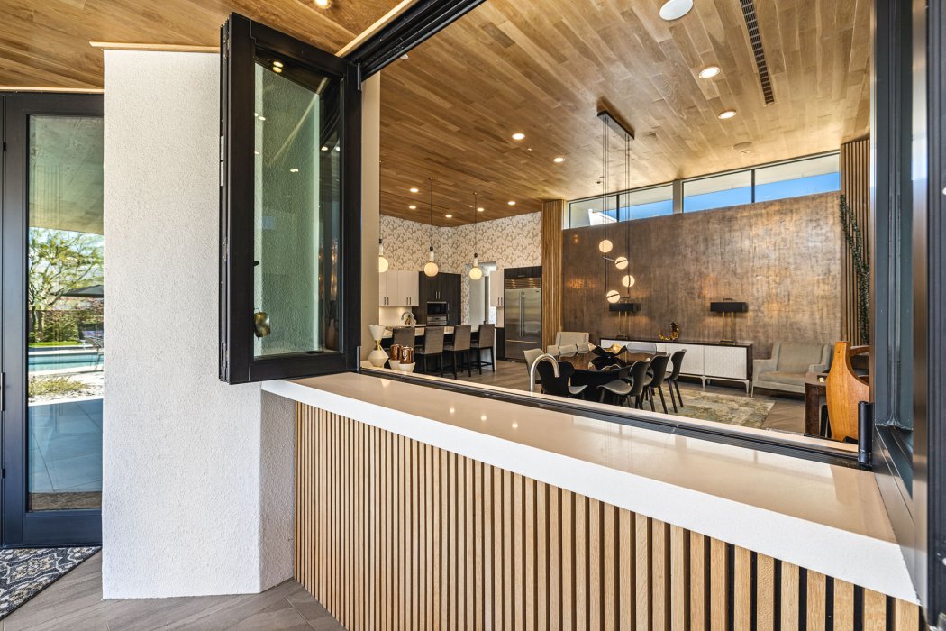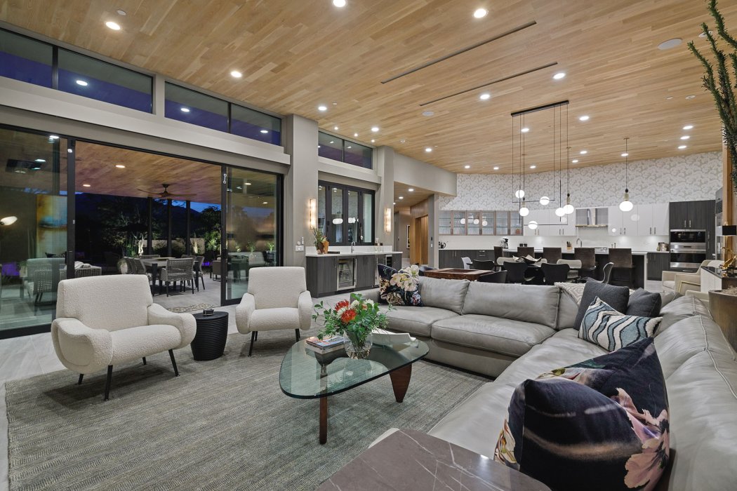 Inside the Main House, five bedrooms pair with floor-to-ceiling glass and clerestory windows that frame the quintessential Palm Springs indoor-outdoor lifestyle. The great room features plush seating, a statement fireplace, and a large flat-screen TV. The gourmet kitchen is outfitted with top-tier appliances, double ovens and dishwashers, ample prep space, and an oversized island with seating for five. An additional dining table seats eight. The indoor-outdoor bar connects to the patio via pass-through windows. A media/office room provides a cozy spot to watch TV or work from the built-in desk.