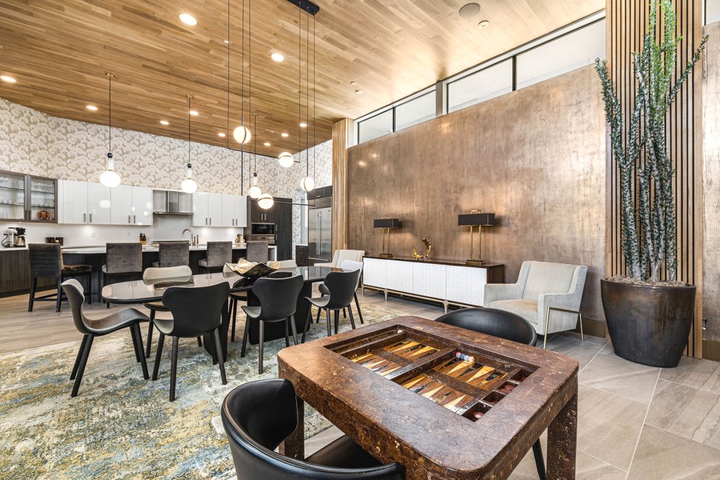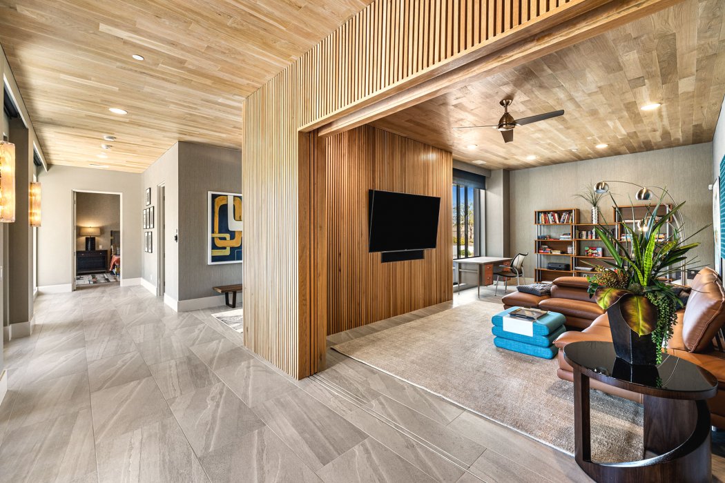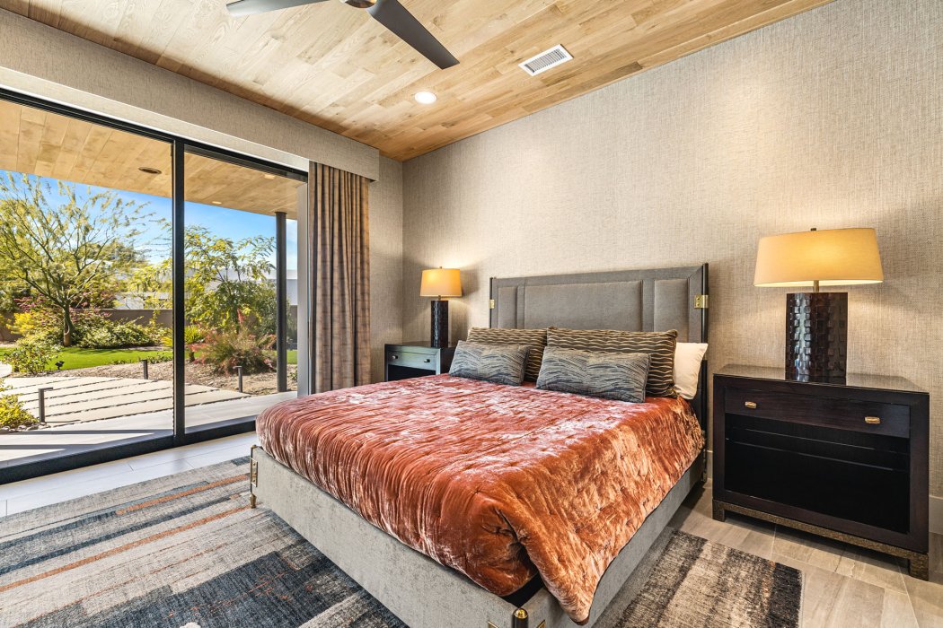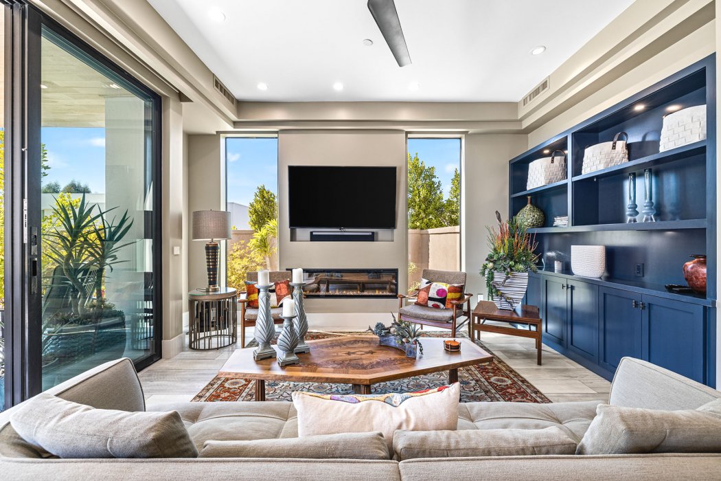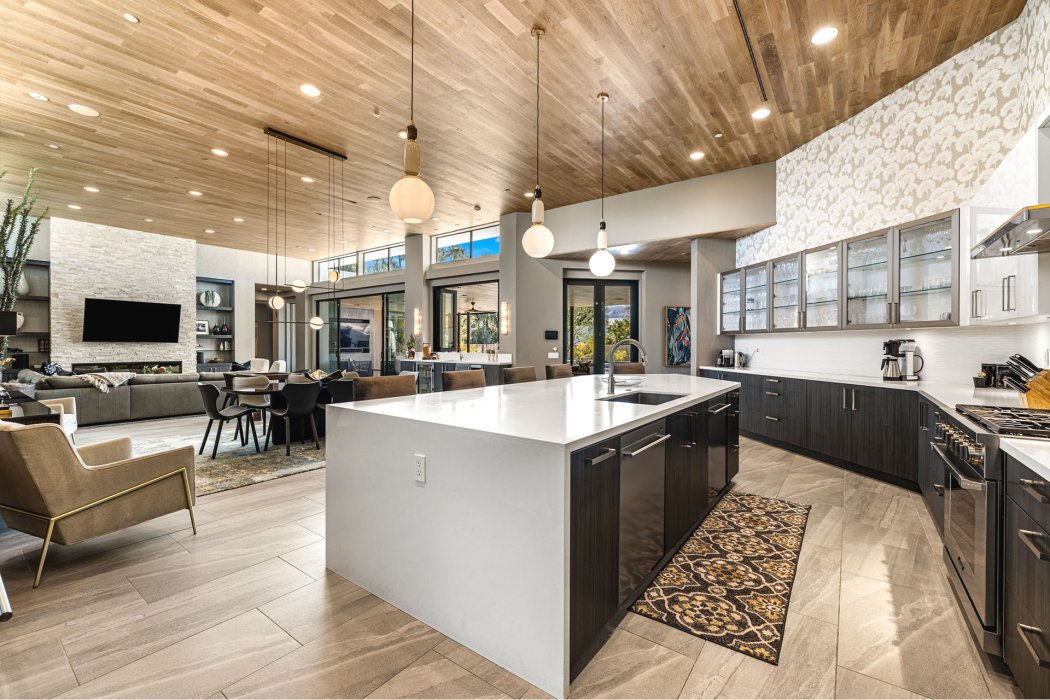 Inside the Main House, five bedrooms pair with floor-to-ceiling glass and clerestory windows that frame the quintessential Palm Springs indoor-outdoor lifestyle. The great room features plush seating, a statement fireplace, and a large flat-screen TV. The gourmet kitchen is outfitted with top-tier appliances, double ovens and dishwashers, ample prep space, and an oversized island with seating for five. An additional dining table seats eight. The indoor-outdoor bar connects to the patio via pass-through windows. A media/office room provides a cozy spot to watch TV or work from the built-in desk.