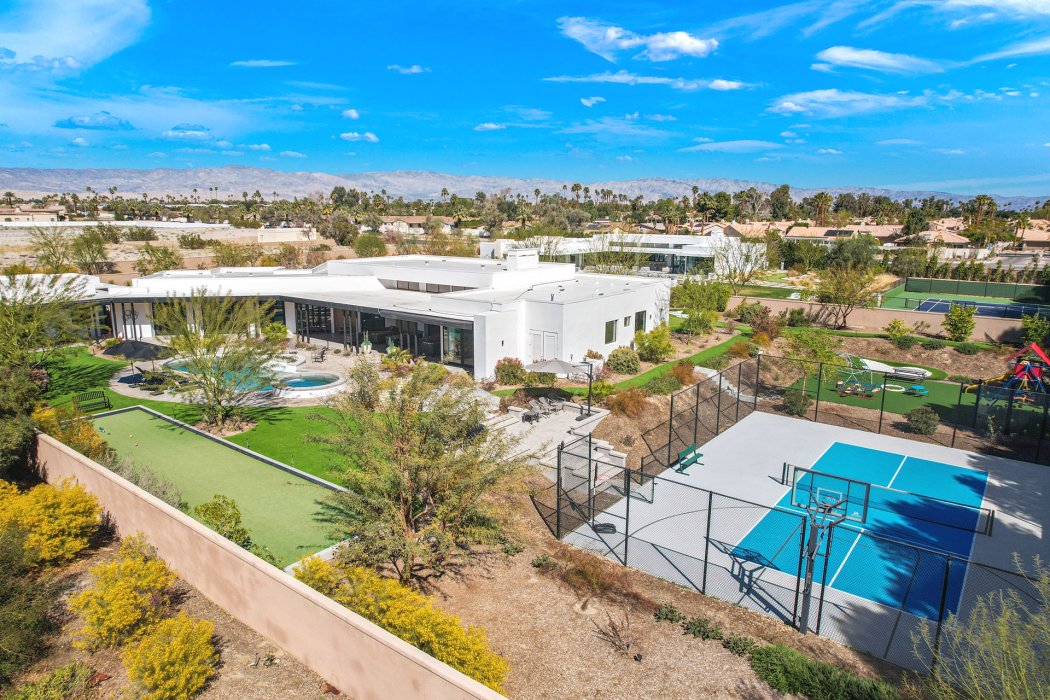 The landscaped backyard showcases sweeping views of the San Jacinto Mountains. Spend your days lounging by the pool, playing a friendly match on the courts, or putting on the 6-hole green. As the sun sets, gather around the fire pit or enjoy the covered outdoor lounge complete with fans, heaters, and a TV. Two dining tables (for 8 and 4 guests) and a built-in BBQ island with bar seating for 3 complete the alfresco setup.