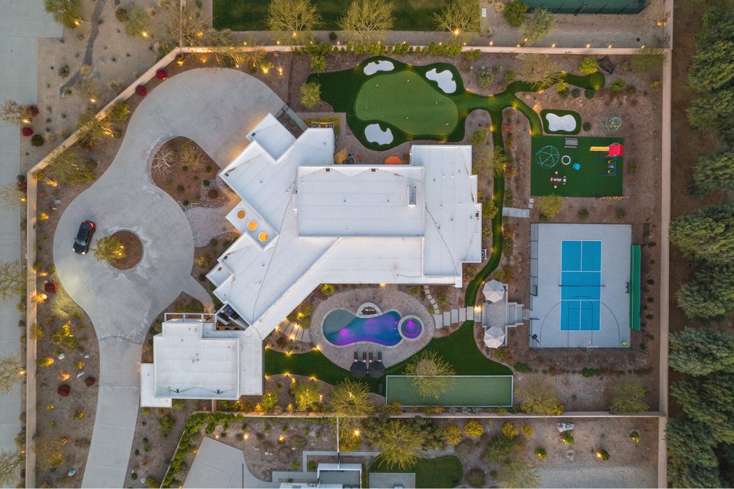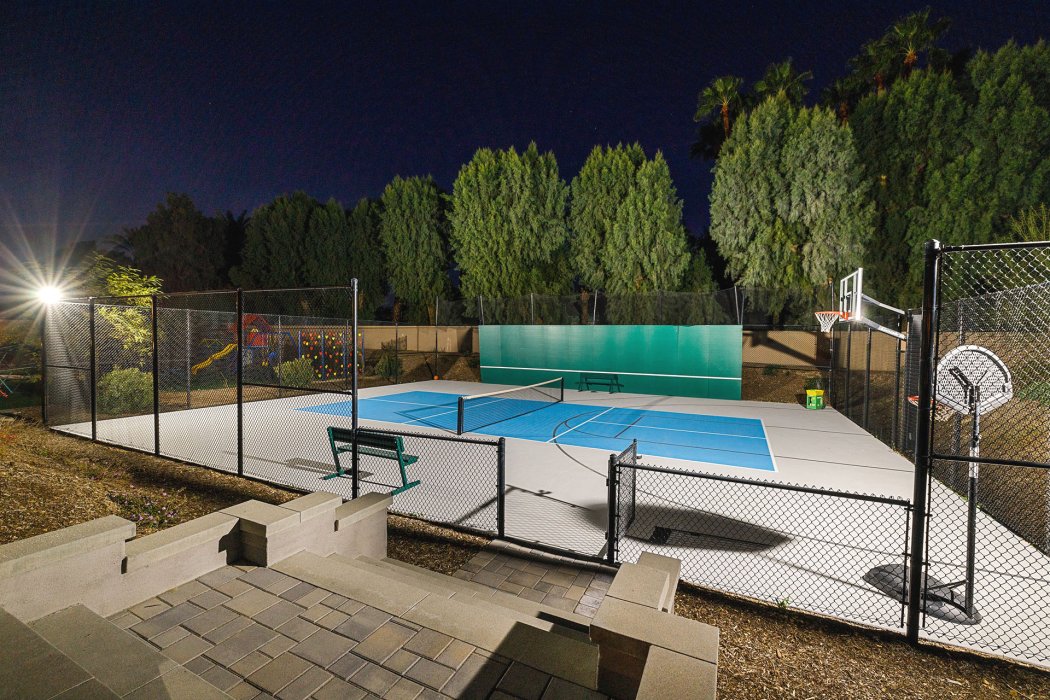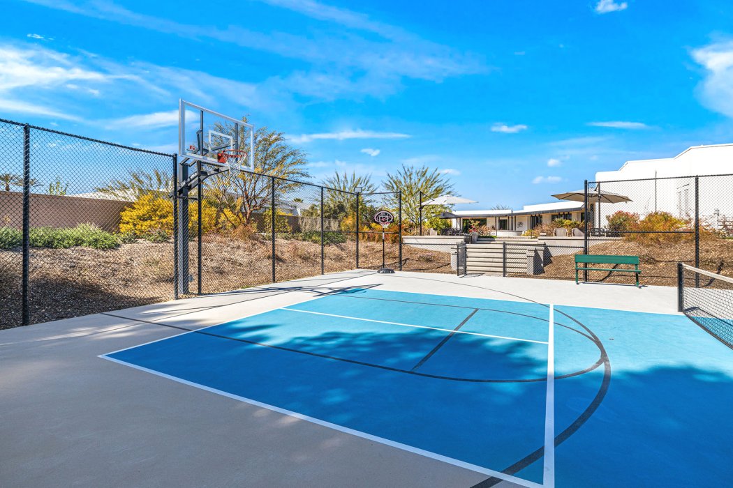 This 7-bedroom, 7.5-bath estate is perfectly designed for relaxation and recreation, offering resort-style amenities both inside and out. The expansive pool with a cascading spa is surrounded by plush loungers, umbrellas, and a cozy fire feature. The covered outdoor living area includes multiple seating and dining zones, ceiling heaters, a bar that opens to the interior, and a TV—ideal for day-to-night entertaining. You’ll also find a pickleball court, half basketball court, bocce ball, putting green, and a playground for kids.