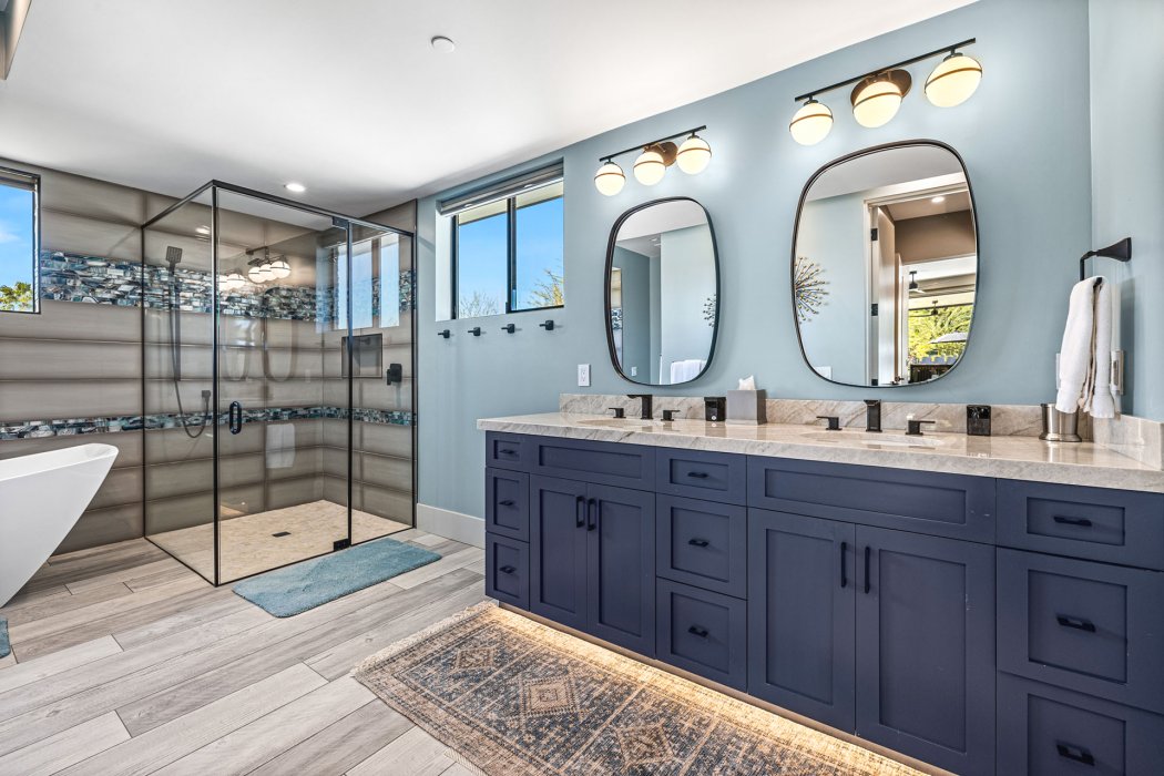The Guest House Primary Suite includes a King bed, TV, and ensuite with soaking tub and shower. The second bedroom has two twin beds and convenient access to a full bathroom with exterior pool access.