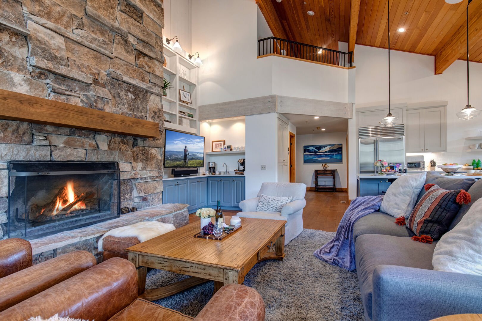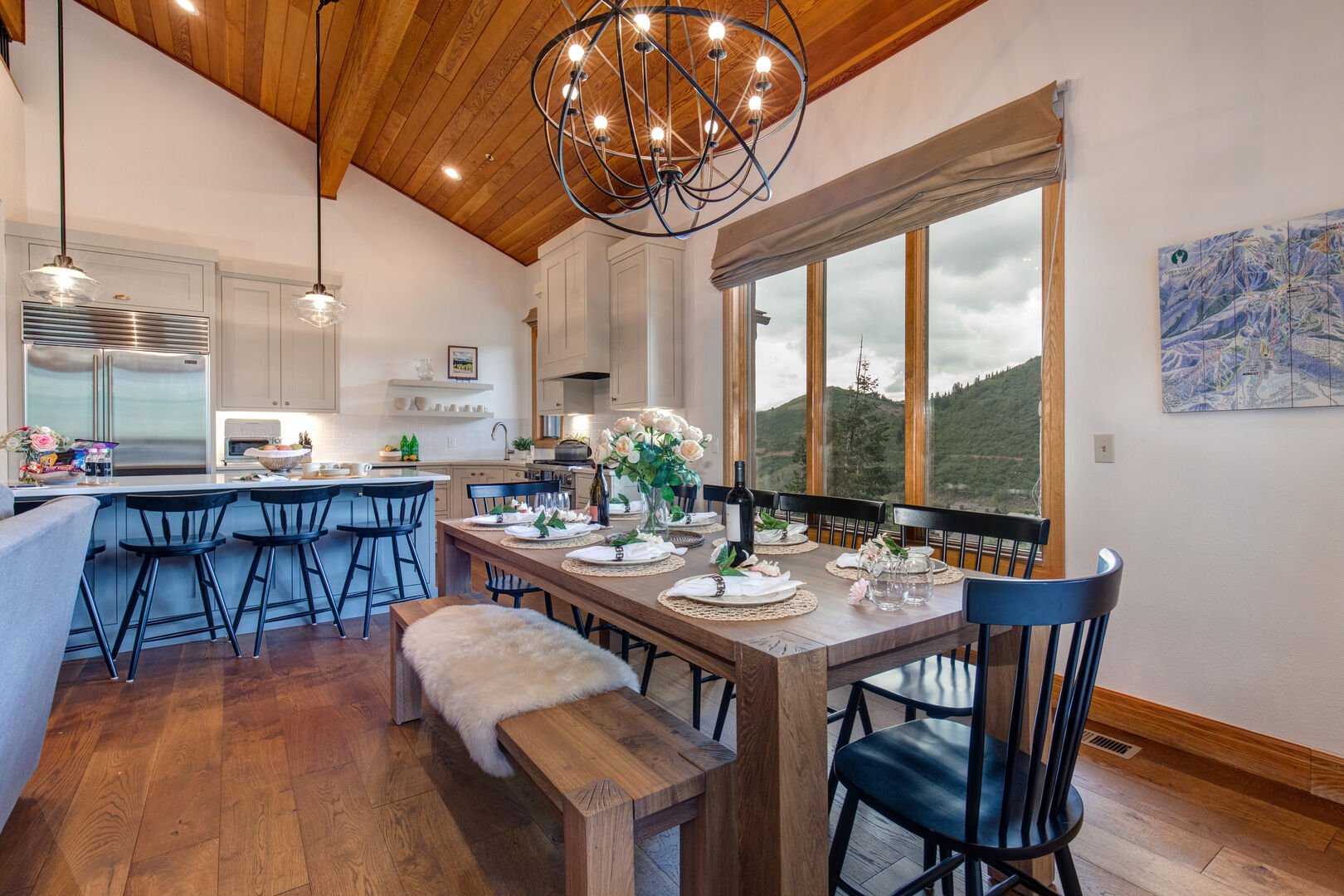 At the heart of the home is the impressive great room, featuring a floor-to-ceiling stone fireplace, plush sofas, and vaulted ceilings—an inviting space to unwind after a day on the slopes. Adjacent is the warm, alpine-style dining area with bench seating, ideal for shared meals and conversation. The fully equipped gourmet kitchen offers everything you need to cook at home, complete with high-end appliances, ample counter space, and a kitchen island with seating for four. Step onto the deck for your morning coffee or enjoy an evening barbecue with a view.