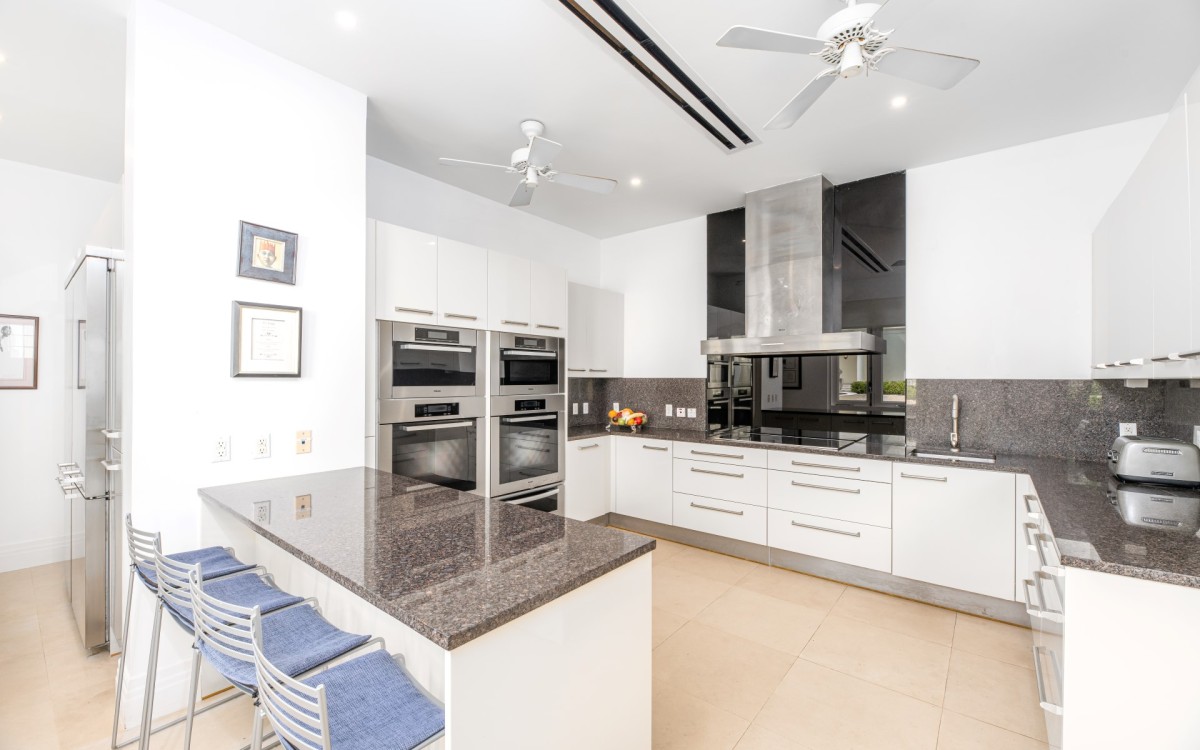 The main house includes five sea-facing bedrooms, three of which are located on the upper level, including a spacious master suite with separate his-and-hers bathrooms. Two additional bedrooms are on the ground floor, one of which is fully wheelchair accessible. An elevator connects the upper level with the wine cellar.
