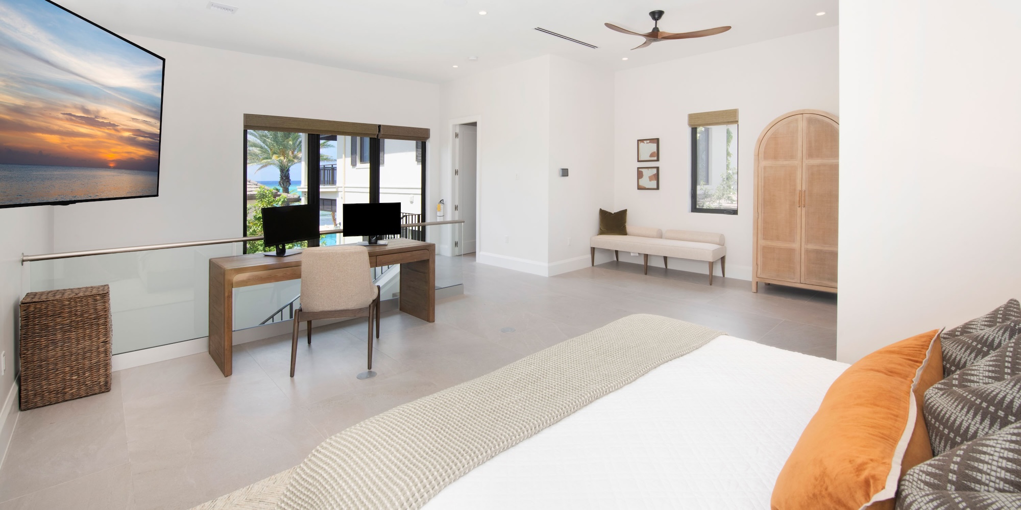 The villa’s outdoor areas are designed to impress. At the heart of it all is an expansive pool deck featuring an 80,000-gallon pool with a sunken lounge, swim-up bar, and heated spa overlooking a private backyard beach. Towering palms, a covered veranda, and a unique birdcage-style tiki lounge provide plenty of shaded lounging spots for relaxing in style.