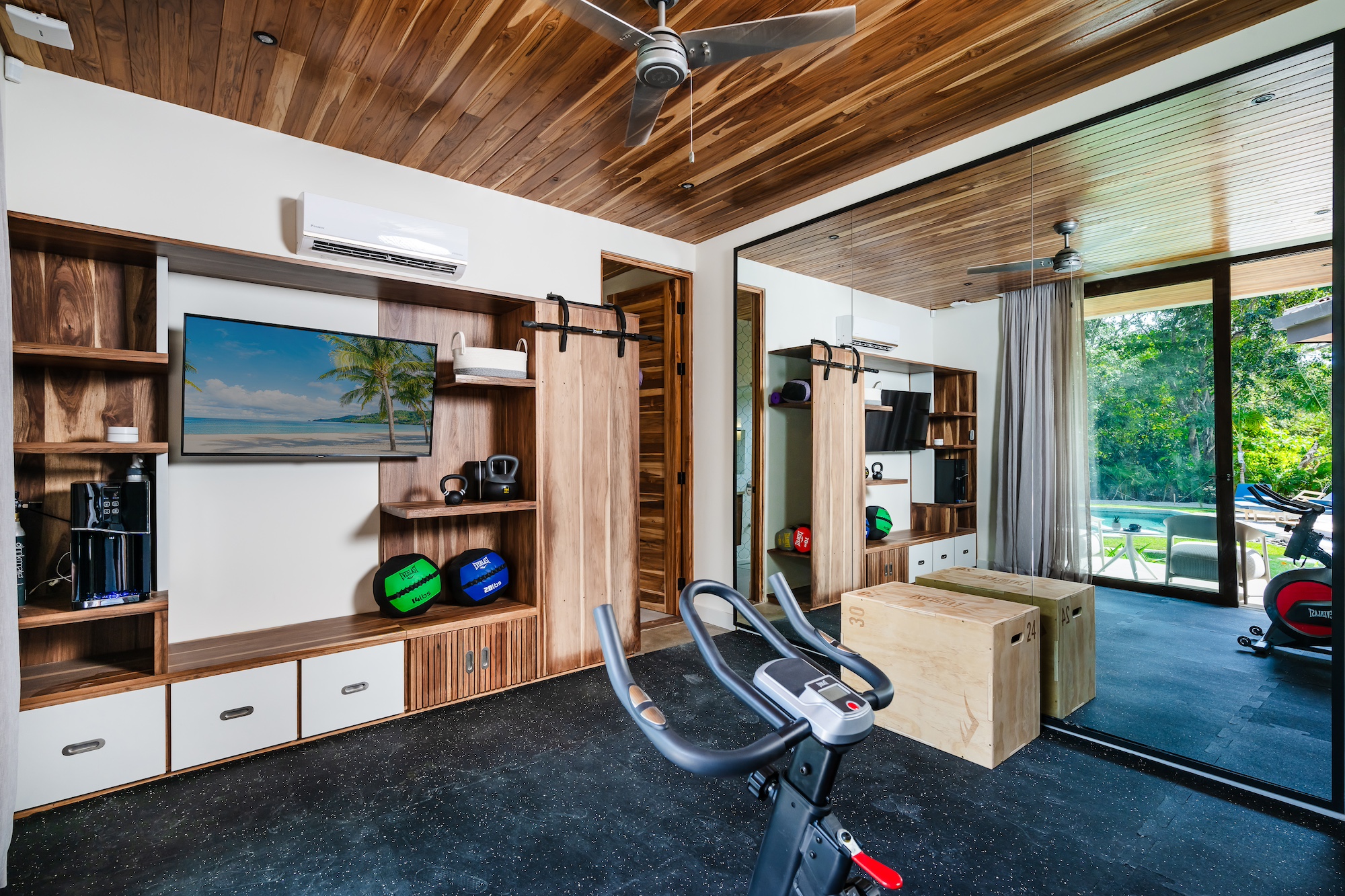 If you wish to stay active, the fitness room awaits – it is far more than a typical gym corner. Picture yourself cycling on a stationary bike while catching up on your favorite TV shows or enjoying the pool view. Furthermore, the fitness room includes a private mini terrace. Equipped with yoga mats, weights, and more, this room has everything you need. After your workout, refresh yourself in the attached bathroom.