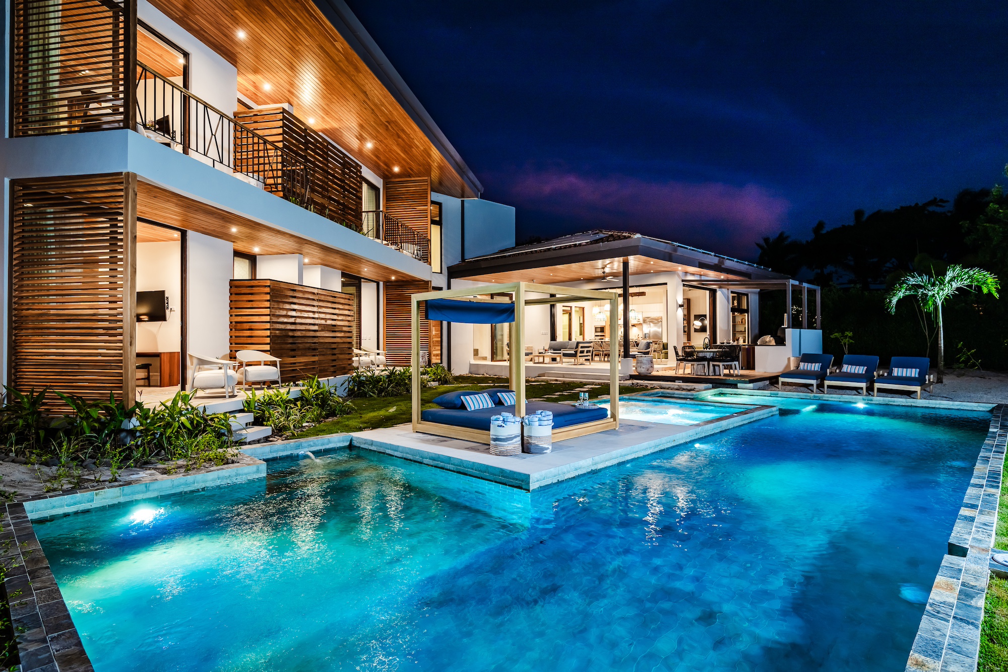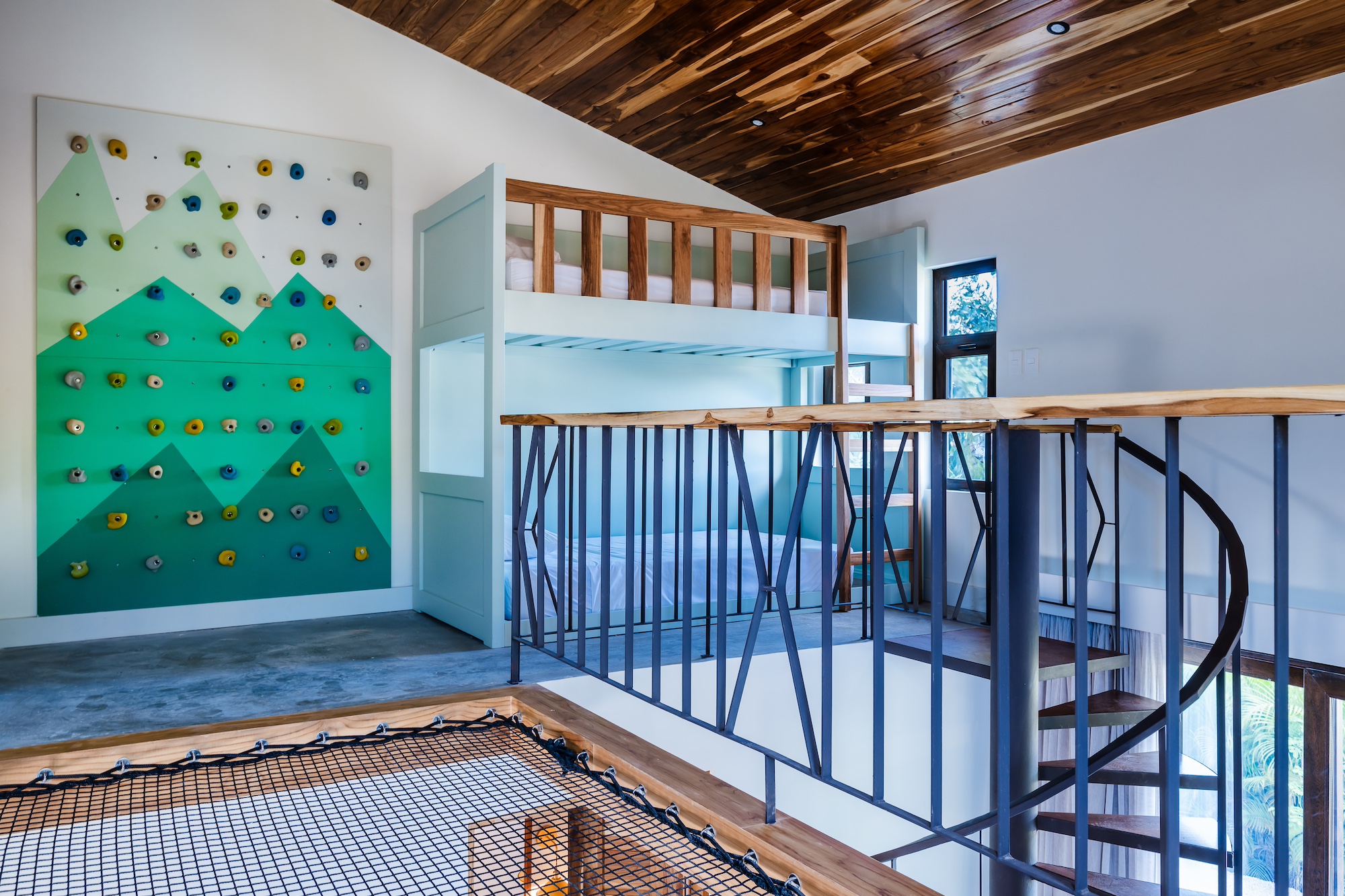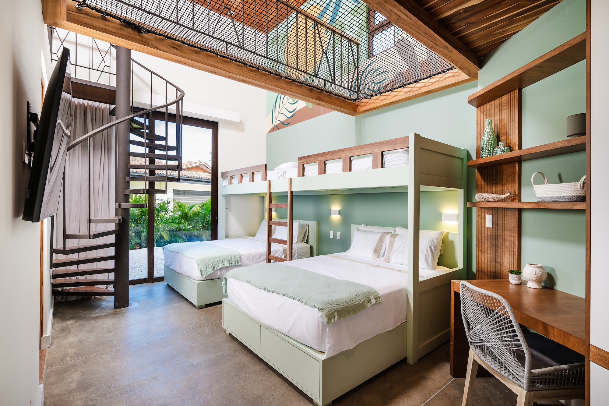 The excellence does not end there. Each master bedroom offers a stunning pool view and includes its own balcony or mini terrace. Imagine waking up, sliding open the door, and being greeted by a serene paradise right outside your room. For the younger guests, the children’s bedroom is essentially a playroom: featuring three bunk beds, a mini climbing wall, and a mezzanine, it is designed for the ultimate sleepover adventures.