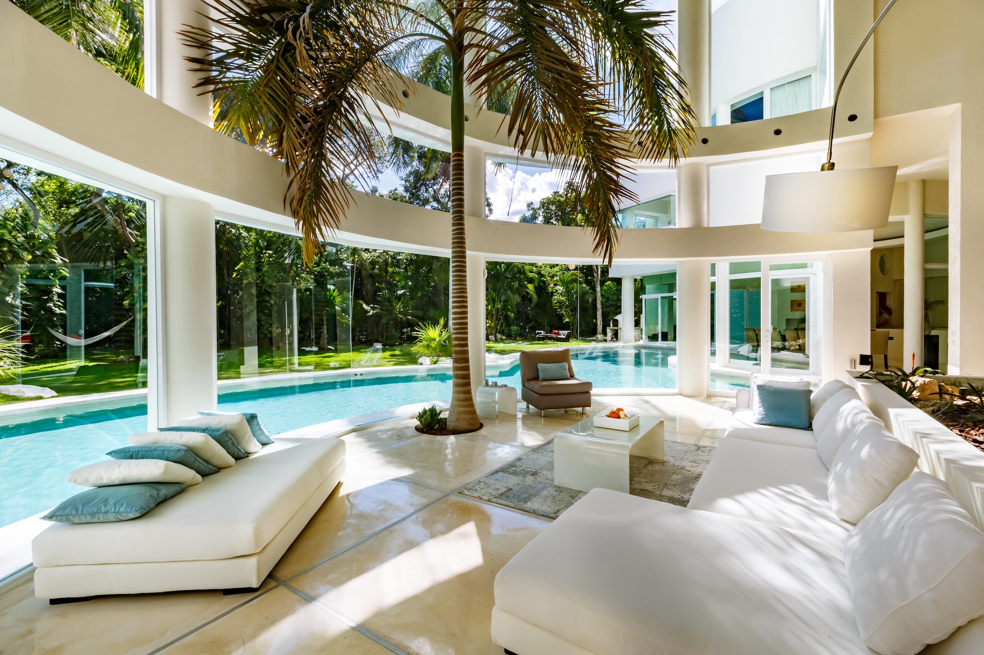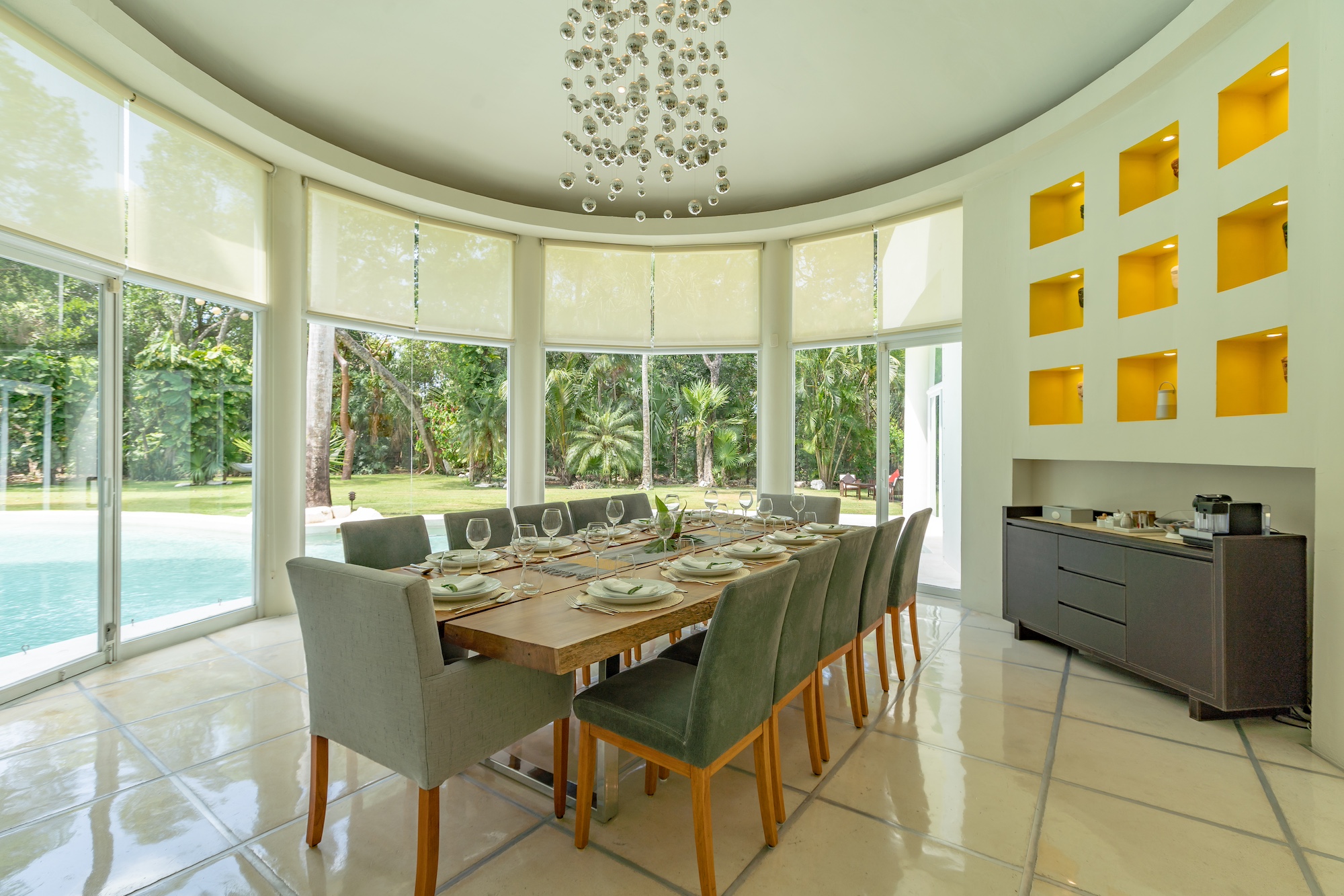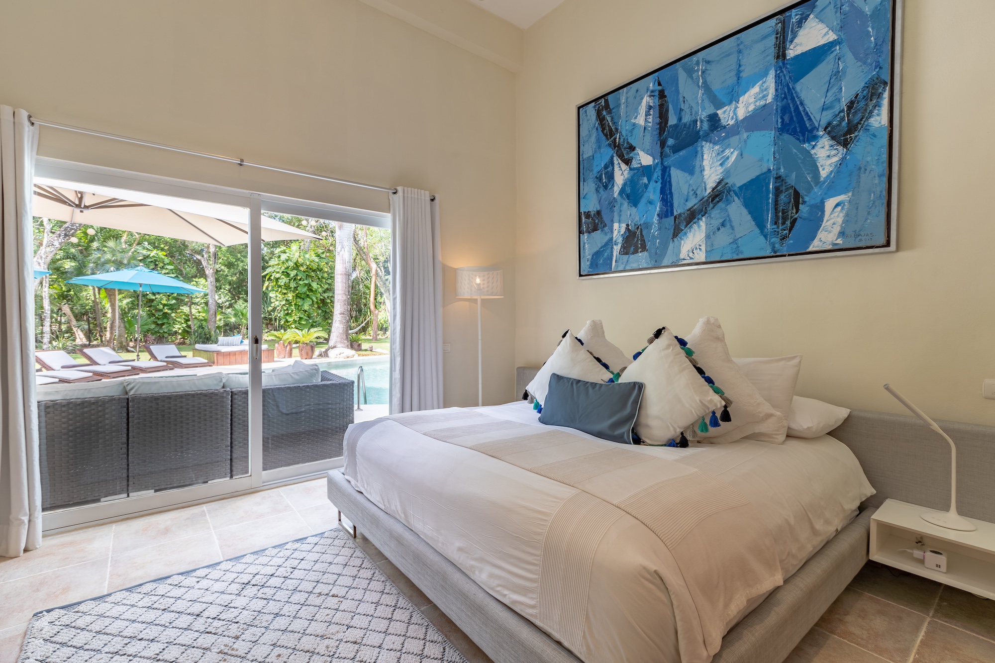 Villa Aqua blends bold architectural lines with vibrant accents, creating a seamless flow between lush exteriors and bright, breezy interiors. A wraparound pool encircles the central tower, where a soaring indoor palm anchors the double-height living area and complements the sweeping garden views. The kitchen features professional-grade appliances, and the dining space comfortably seats ten.
