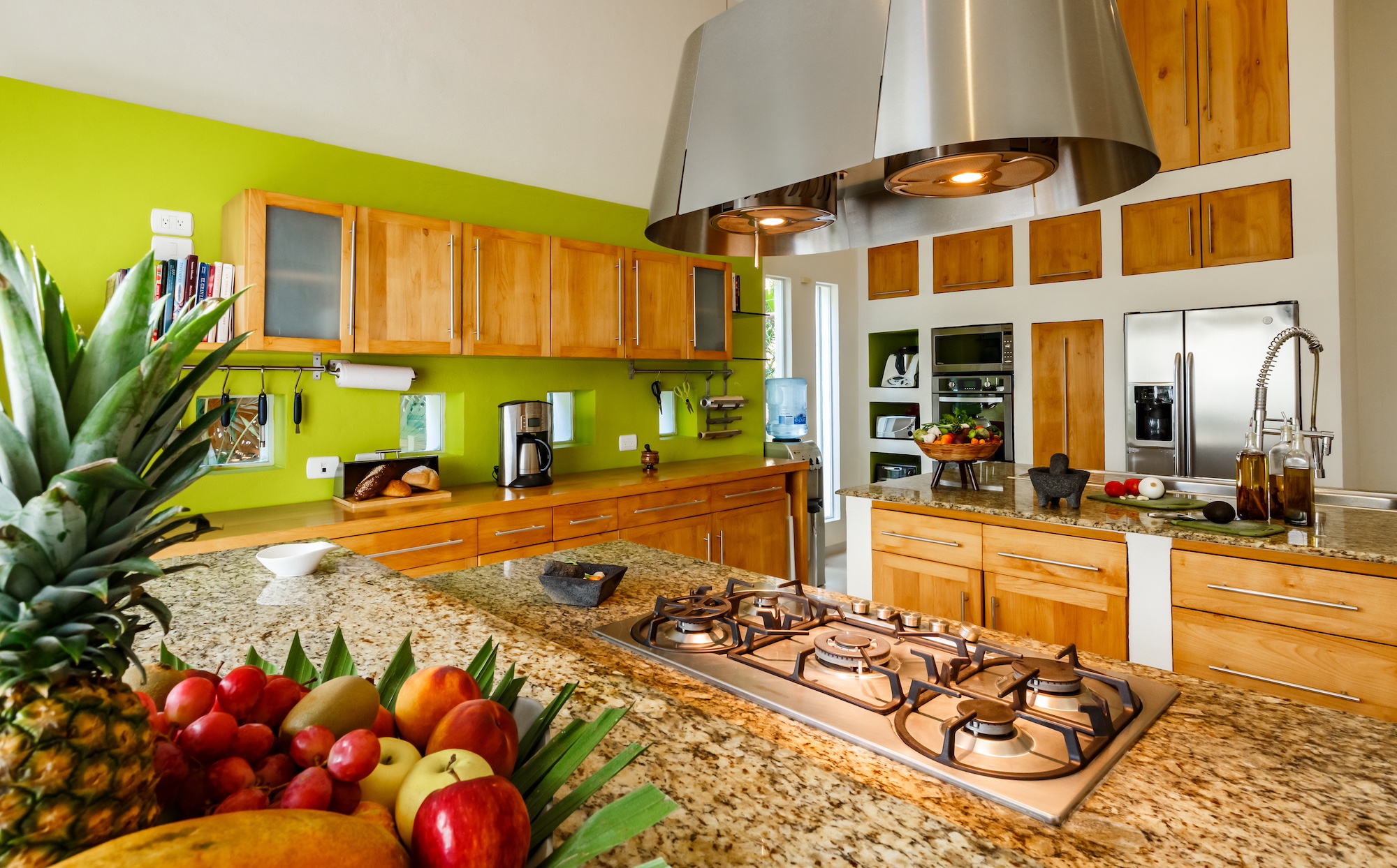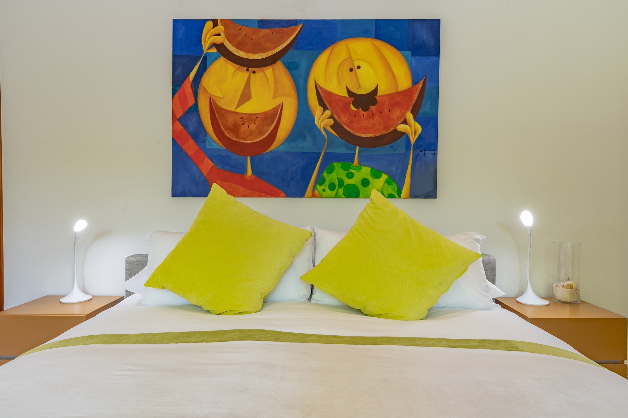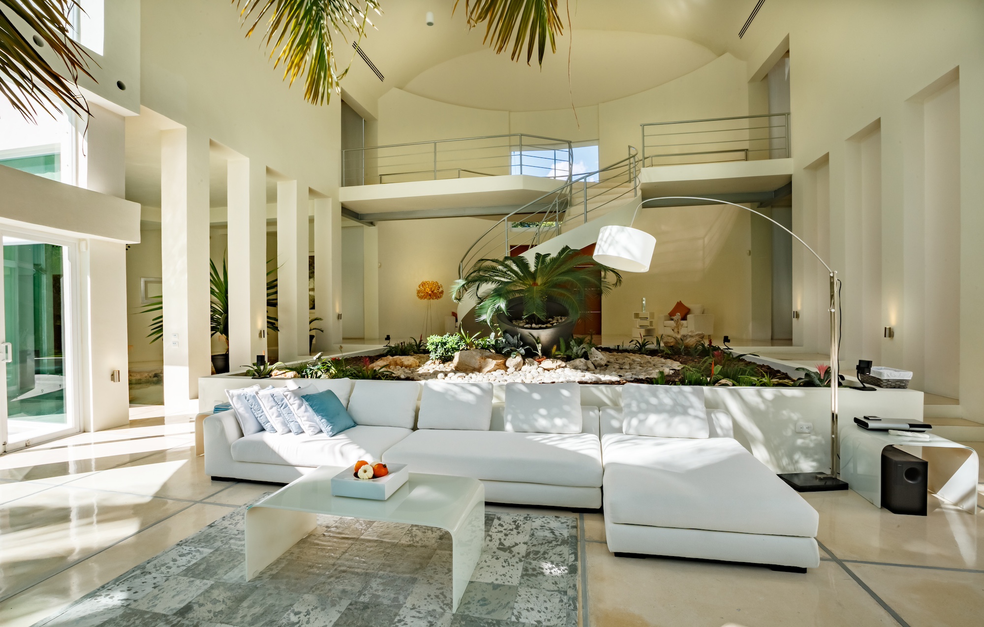 Villa Aqua blends bold architectural lines with vibrant accents, creating a seamless flow between lush exteriors and bright, breezy interiors. A wraparound pool encircles the central tower, where a soaring indoor palm anchors the double-height living area and complements the sweeping garden views. The kitchen features professional-grade appliances, and the dining space comfortably seats ten.