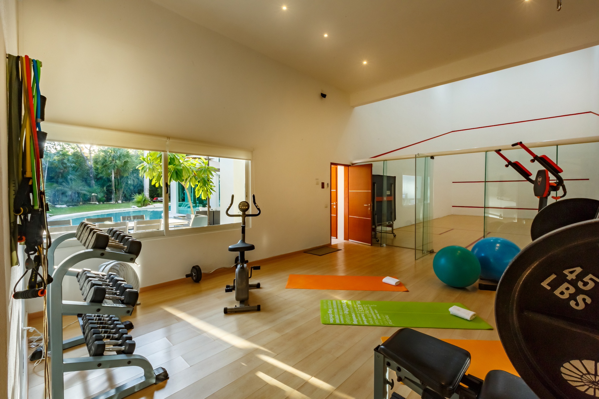 Outside, the manicured grounds frame a jacuzzi, alfresco dining area, woodfired pizza oven, and even a built-in trampoline. Additional amenities include a fully outfitted gym, a dedicated squash court, and a lively game room complete with a stocked bar and oversized TV in the sunken lounge.