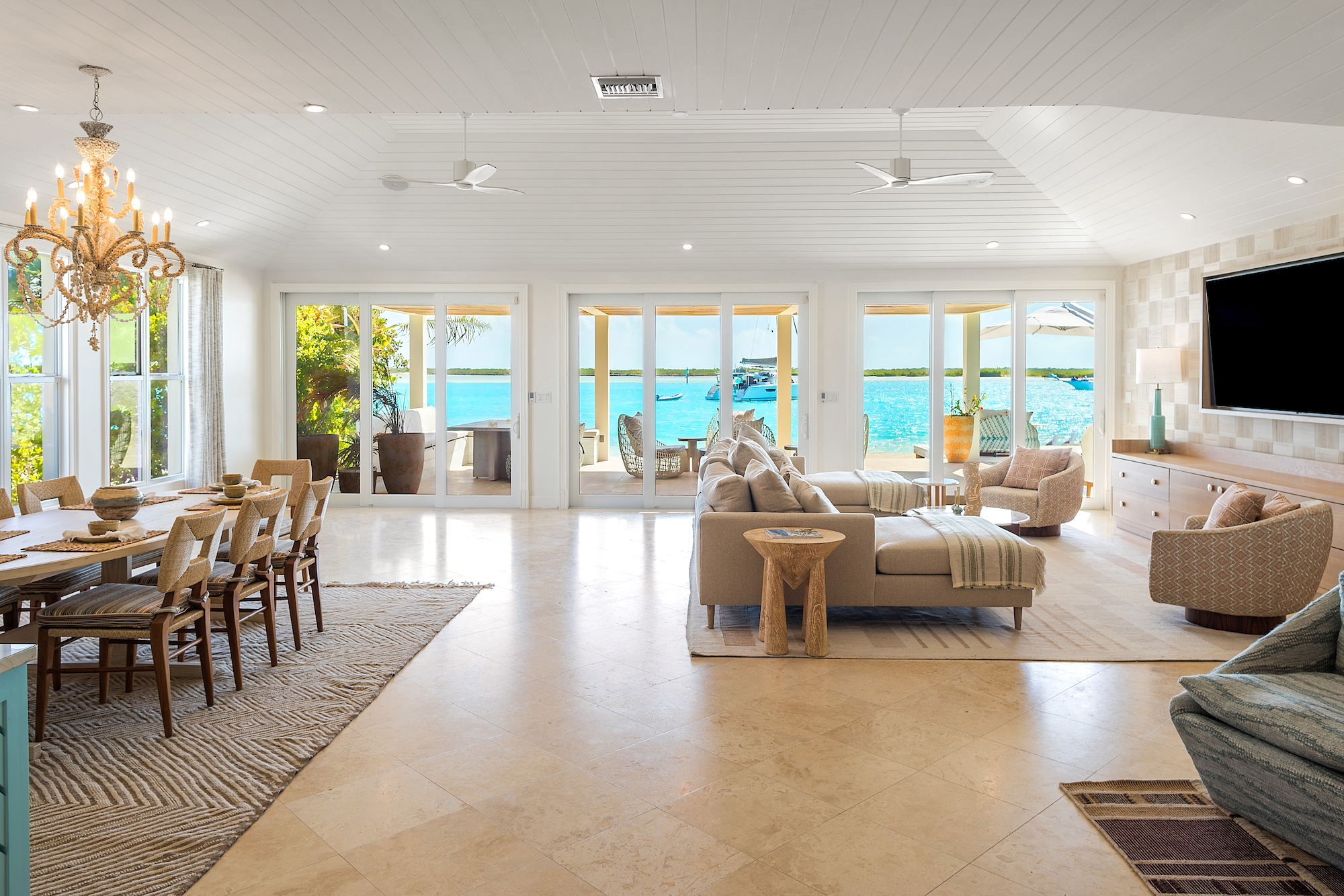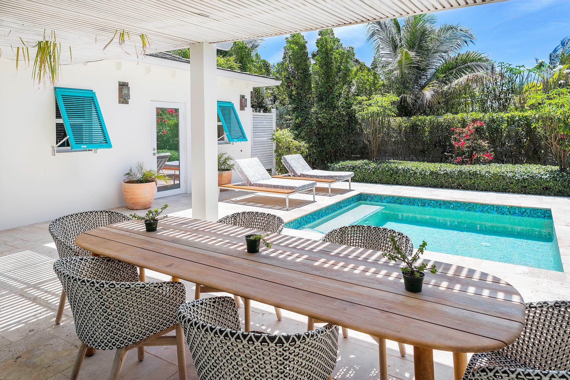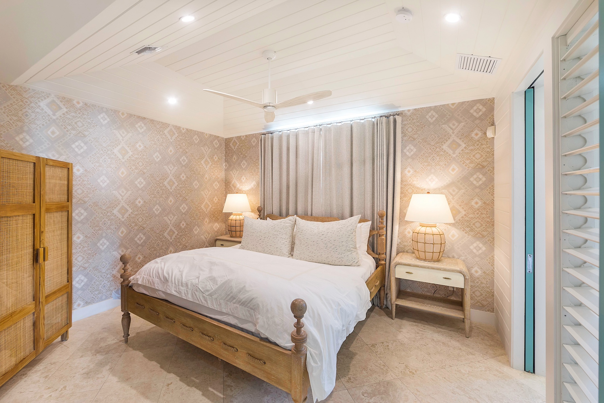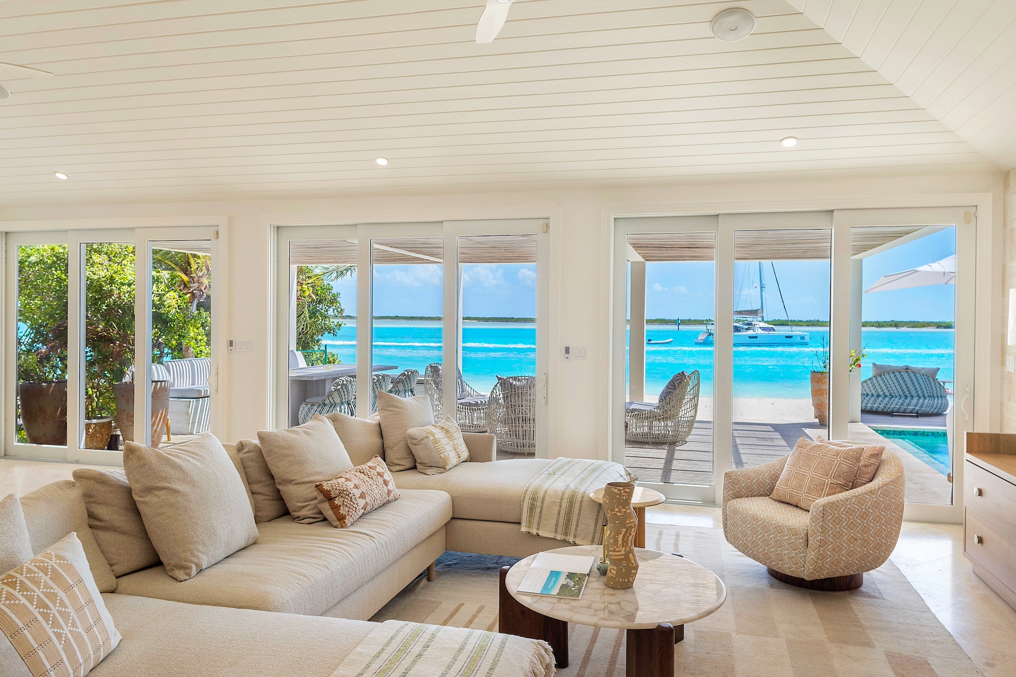 Each bedroom boasts a spacious ensuite bathroom, outdoor shower, private exterior deck space, flat-screen television, and ample closet space. The master bedroom provides stunning views of the pool and ocean, while the other three suites offer serene garden views.