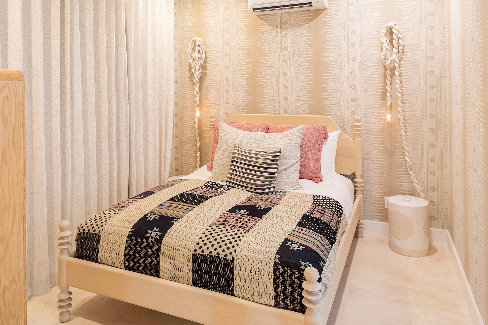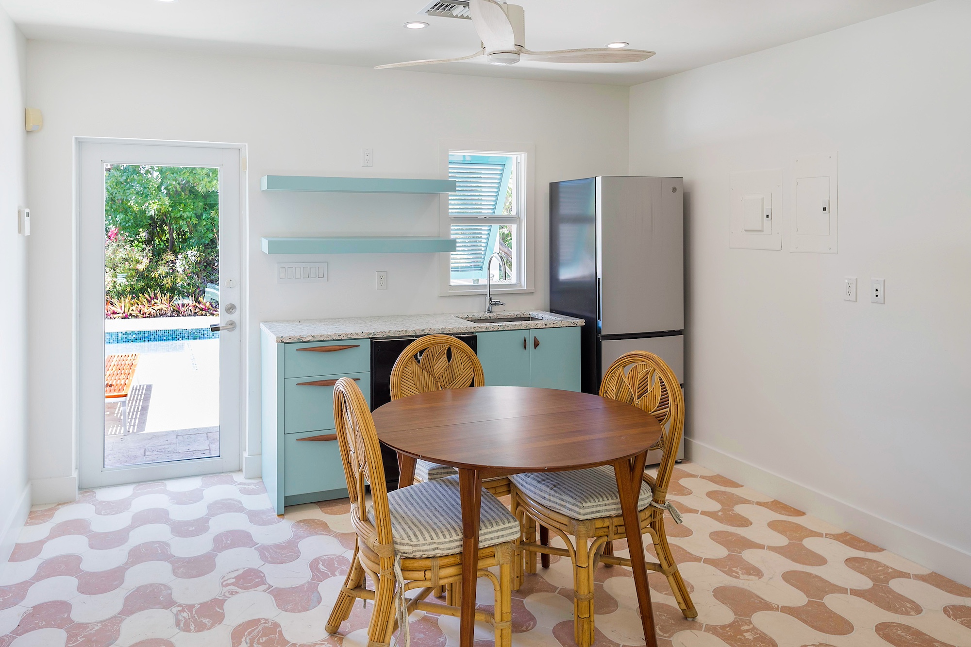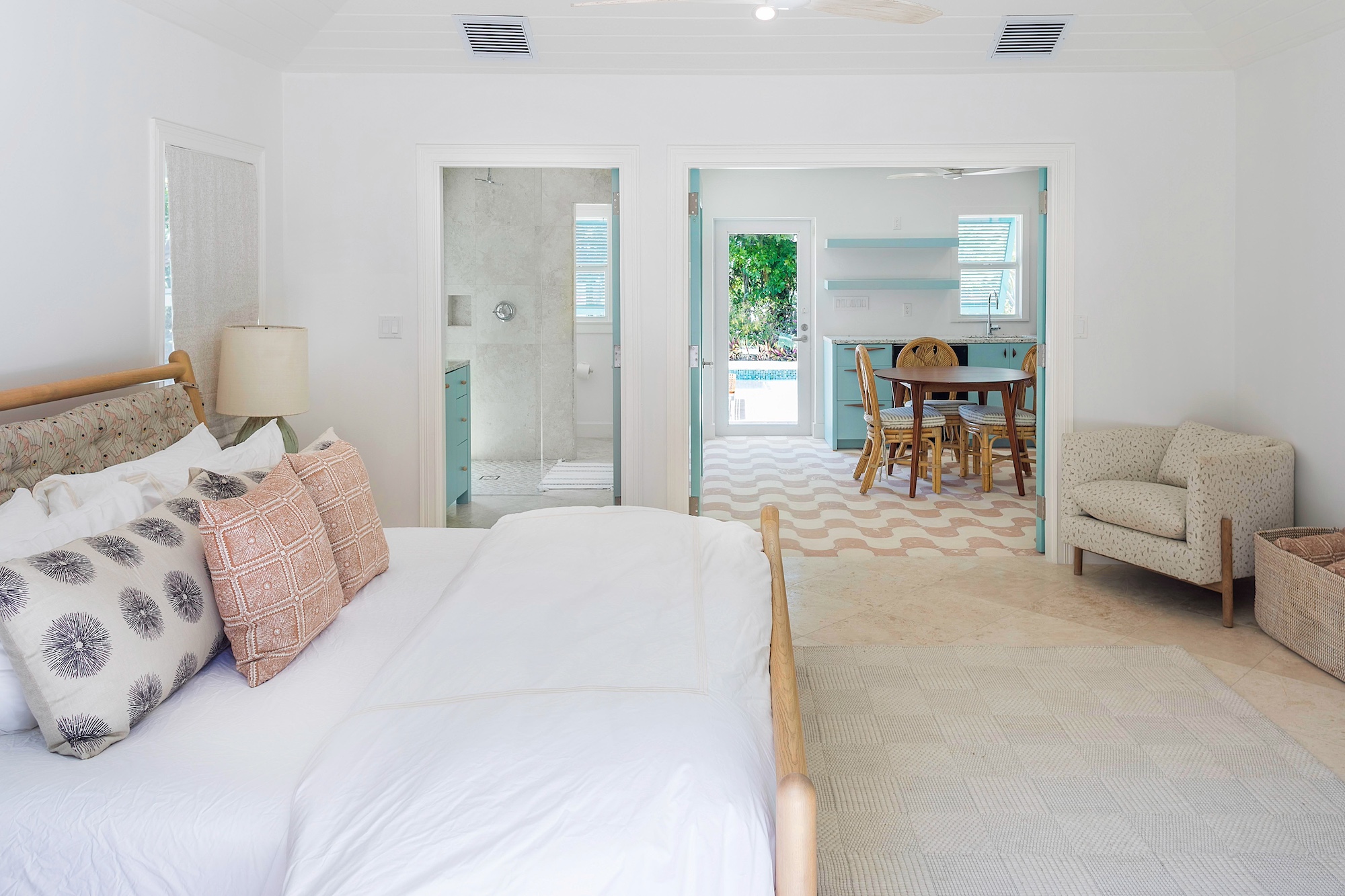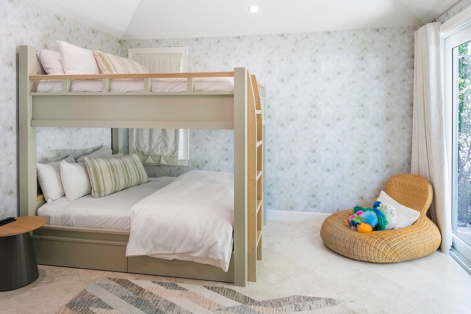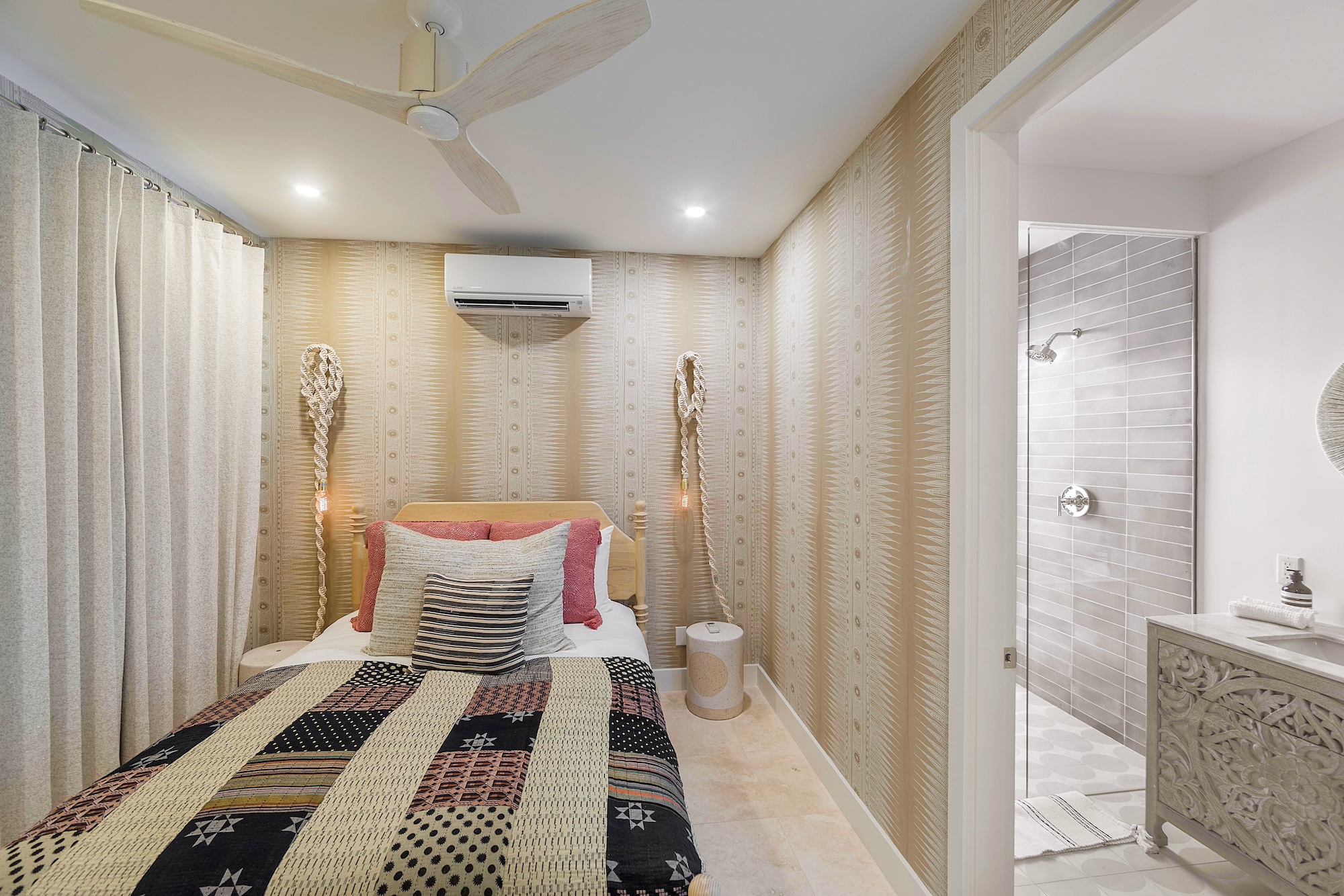 • Kid’s bunk room with garden view suite, ceiling fan, ensuite bathroom with outdoor shower and private patio.