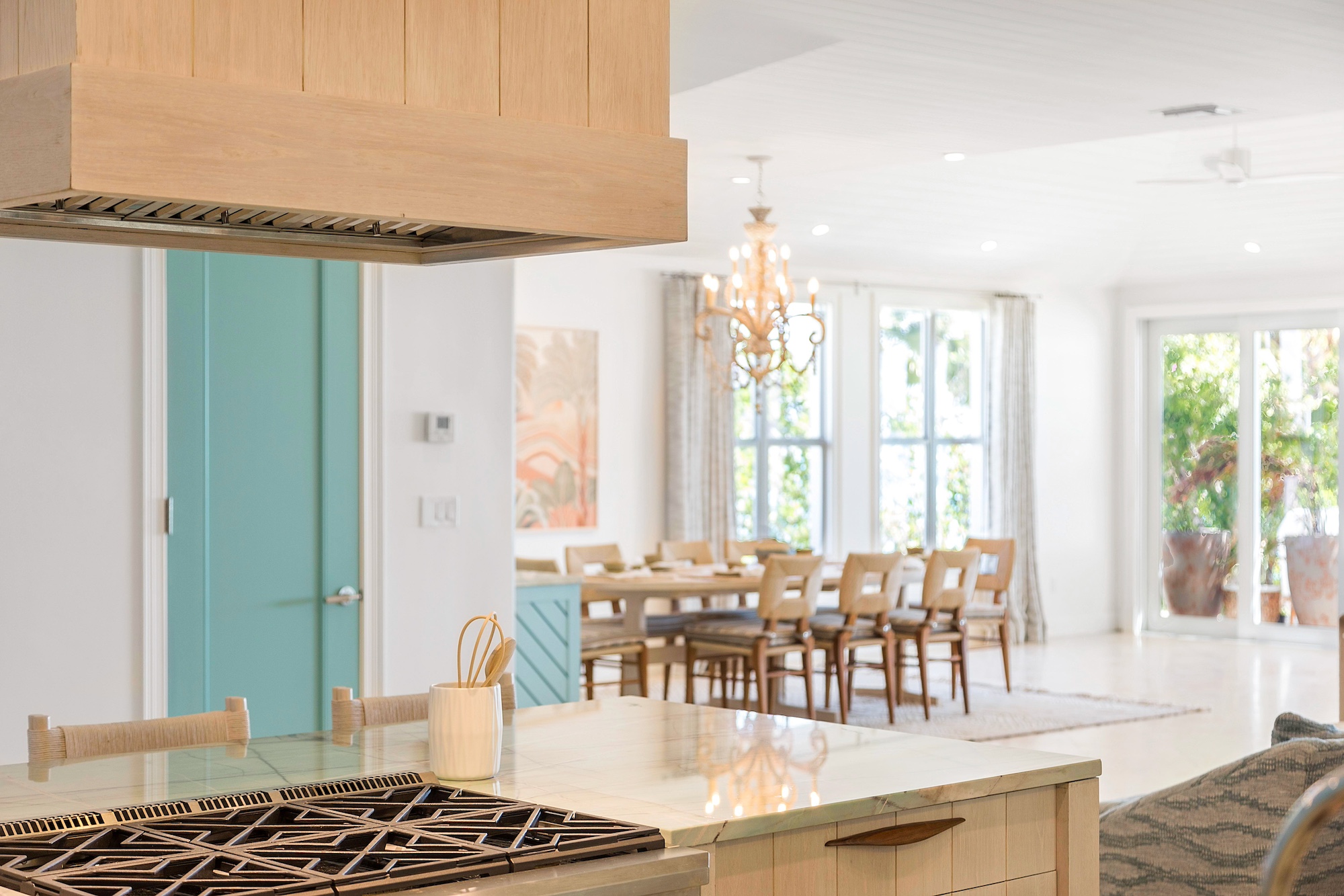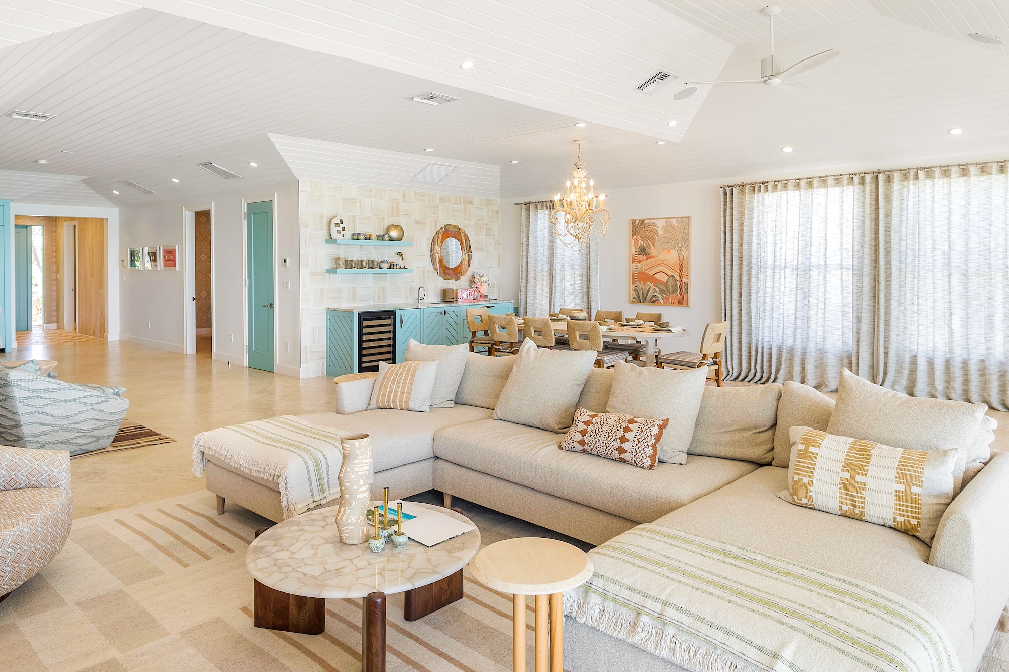 This five-bedroom suite property comprises a four-bedroom main house and a one-bedroom guest house. The main house features an open-concept floor plan, complete with a fully-equipped, exquisite kitchen, and a spacious dining and living area that seamlessly opens up to the ocean deck through large glass sliders.
