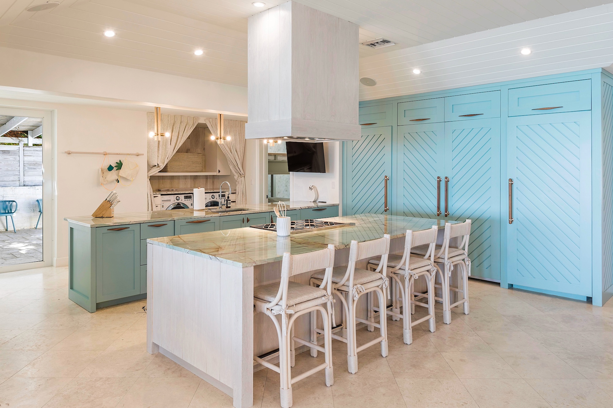 The beachfront Villa Aquazure presents a stunning, contemporary property that underwent recent renovations. Originally built in the 1980s before setback laws were established, the villa provides guests with unparalleled proximity to the ocean. Stepping off the beach deck places your feet directly in the sand.