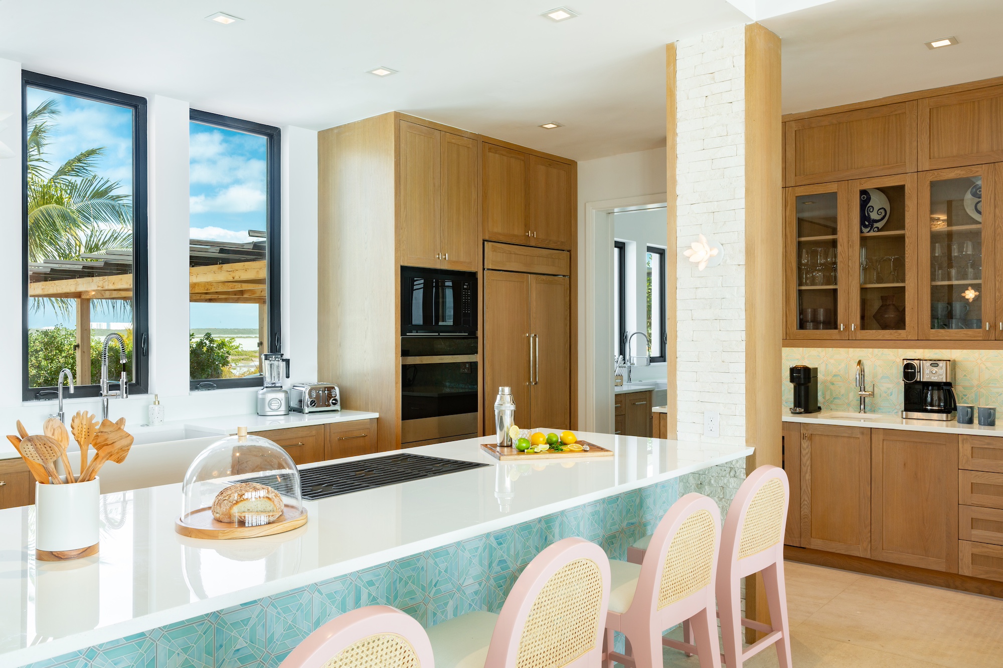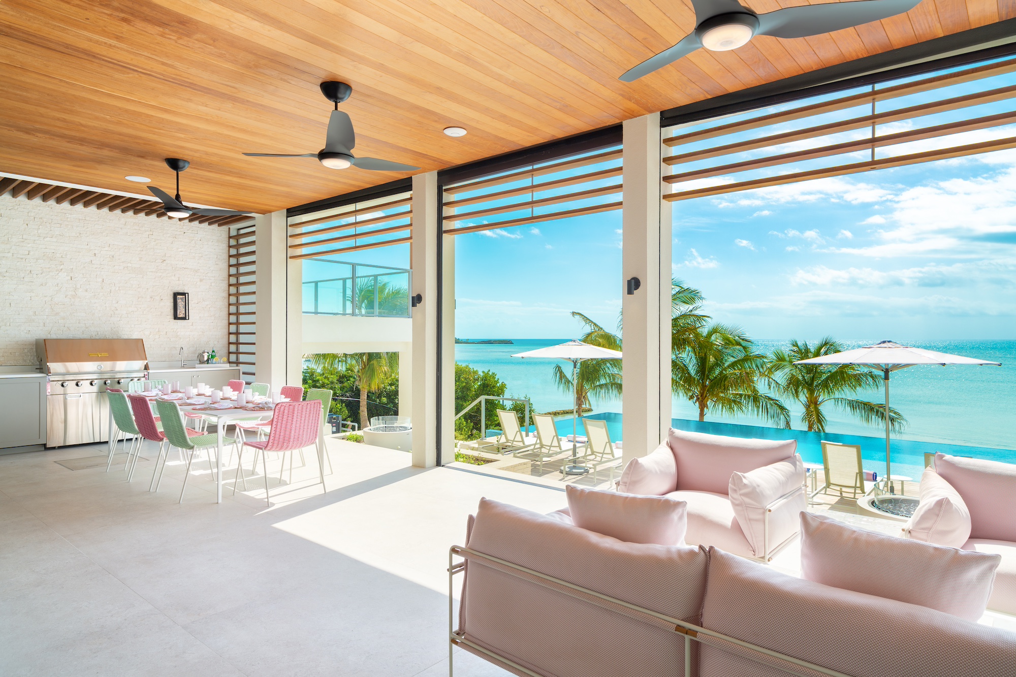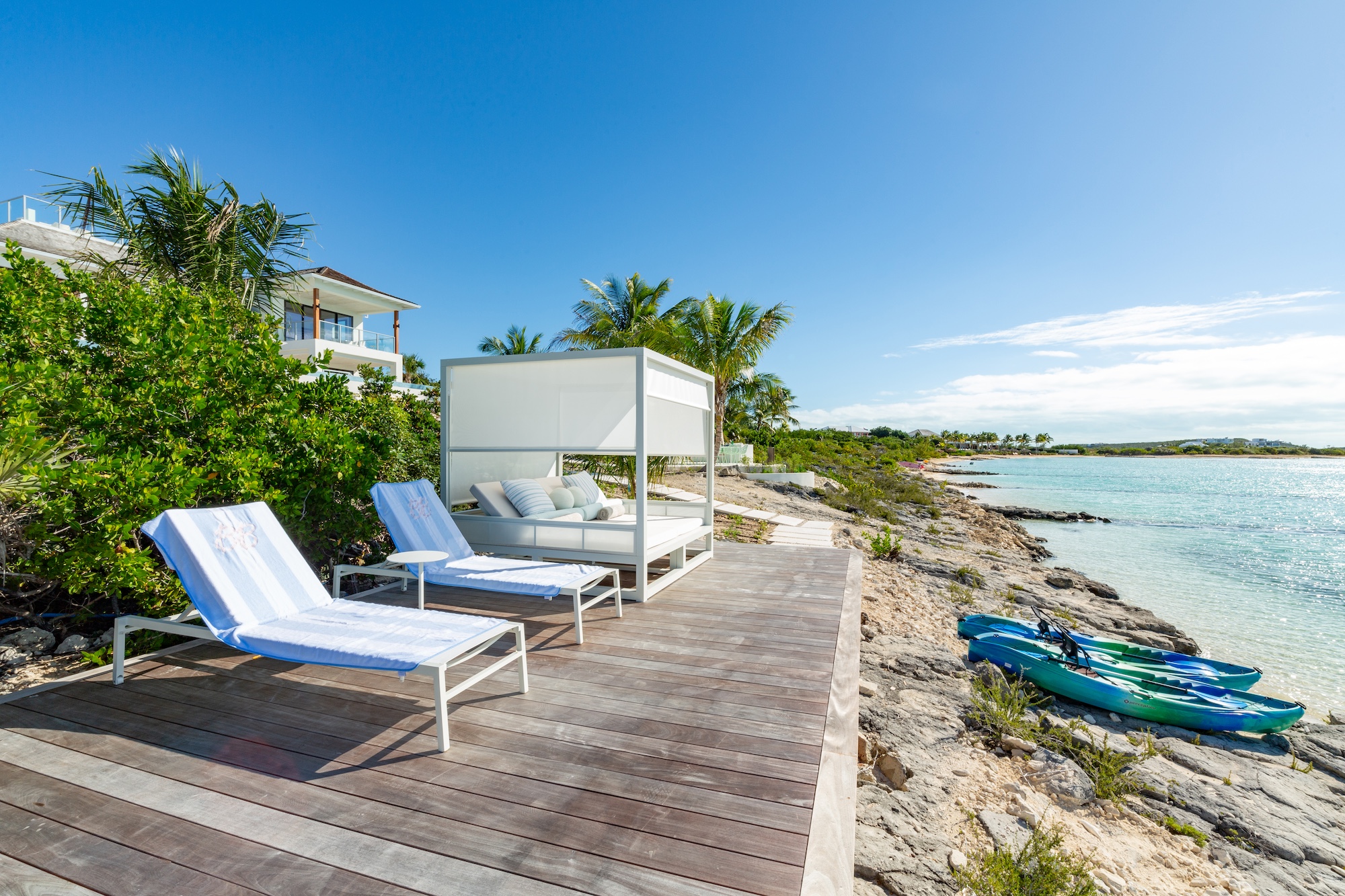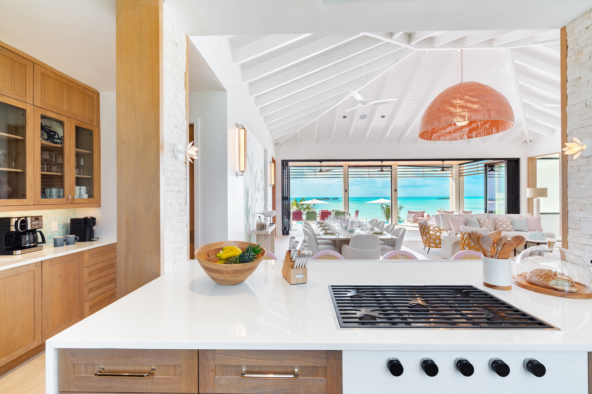 The use of natural materials such as native stone, hardwood panels, whitewashed wood, and elegant tile floors brings warmth and softness, reinforcing the villa’s inviting atmosphere. Interior spaces are designed for connectivity and ease, with bedrooms positioned just a half-level from the Great Room to maintain a sense of intimacy and accessibility. The open-plan living, dining, and kitchen areas remain distinct yet fluid, with the kitchen and bar tucked into a cozy corner while still blending seamlessly into the larger living space. Thoughtful details, including open-air showers in three of the bathrooms, create an immersive experience that highlights the villa’s harmonious relationship with its surroundings. From the entrance, the home appears as a single-story structure, while the ocean-facing side reveals a captivating split-level design that minimizes stair usage while enhancing the visual appeal. Every element of Bristol Breeze has been carefully curated to celebrate its exceptional location, offering a refined yet relaxed coastal retreat.