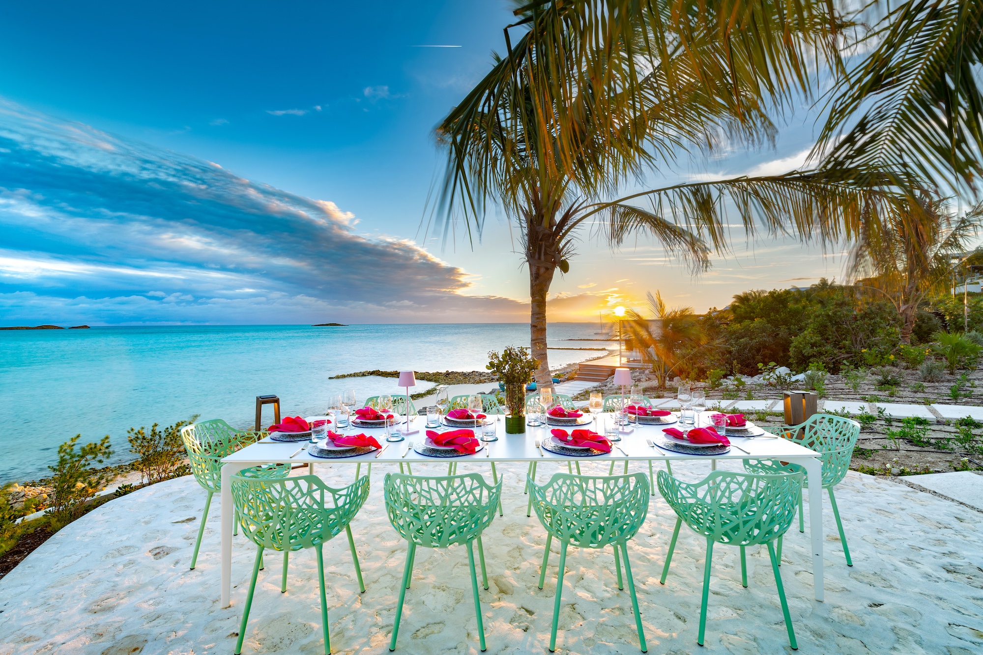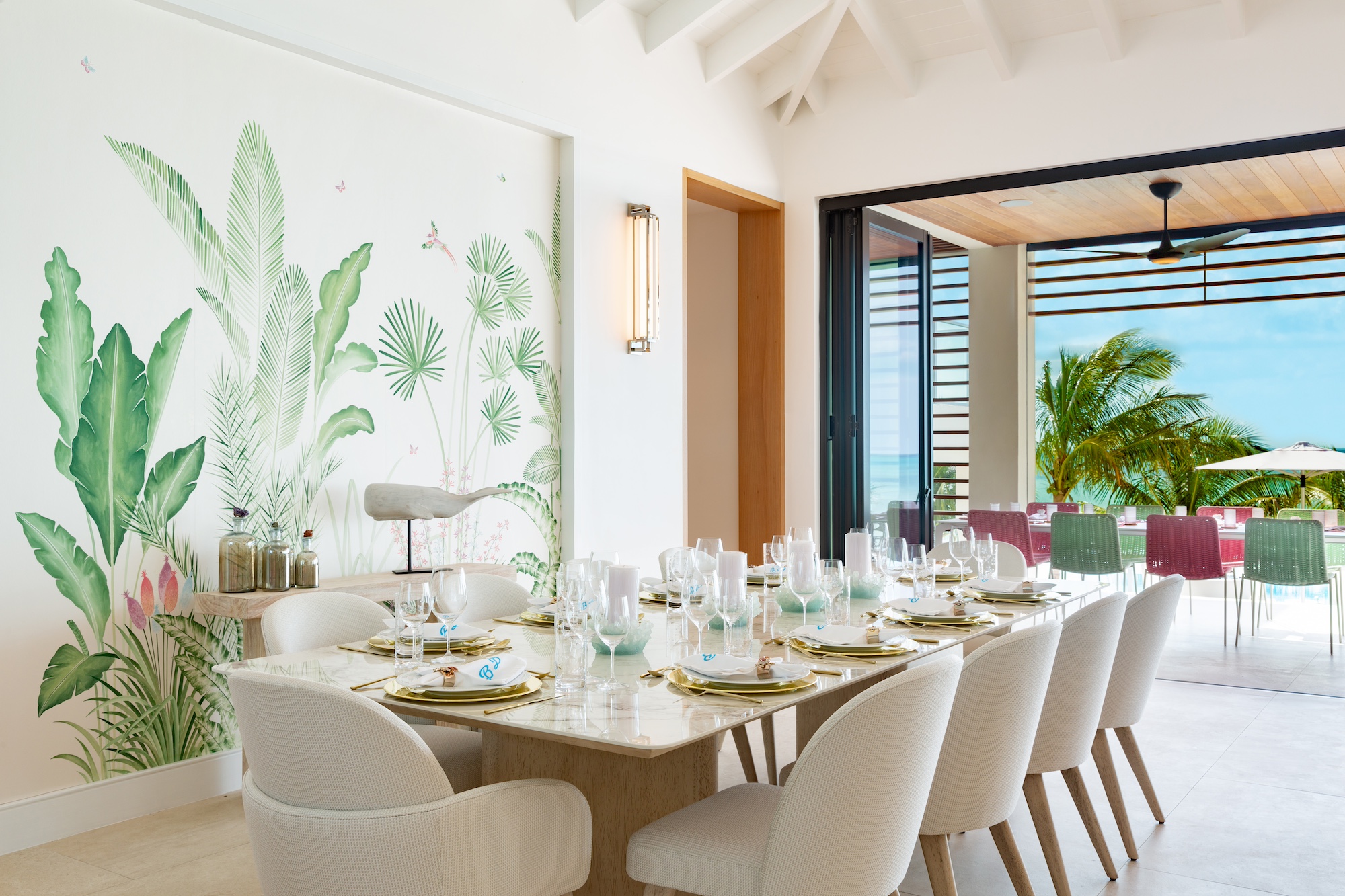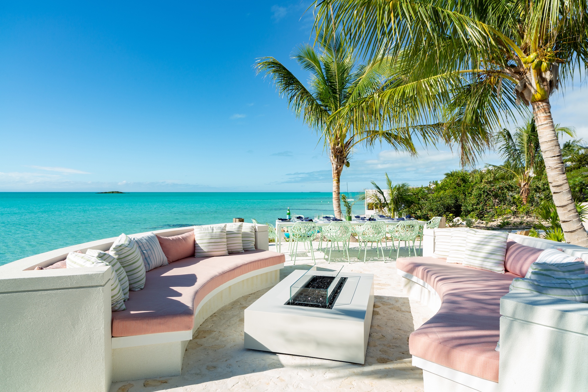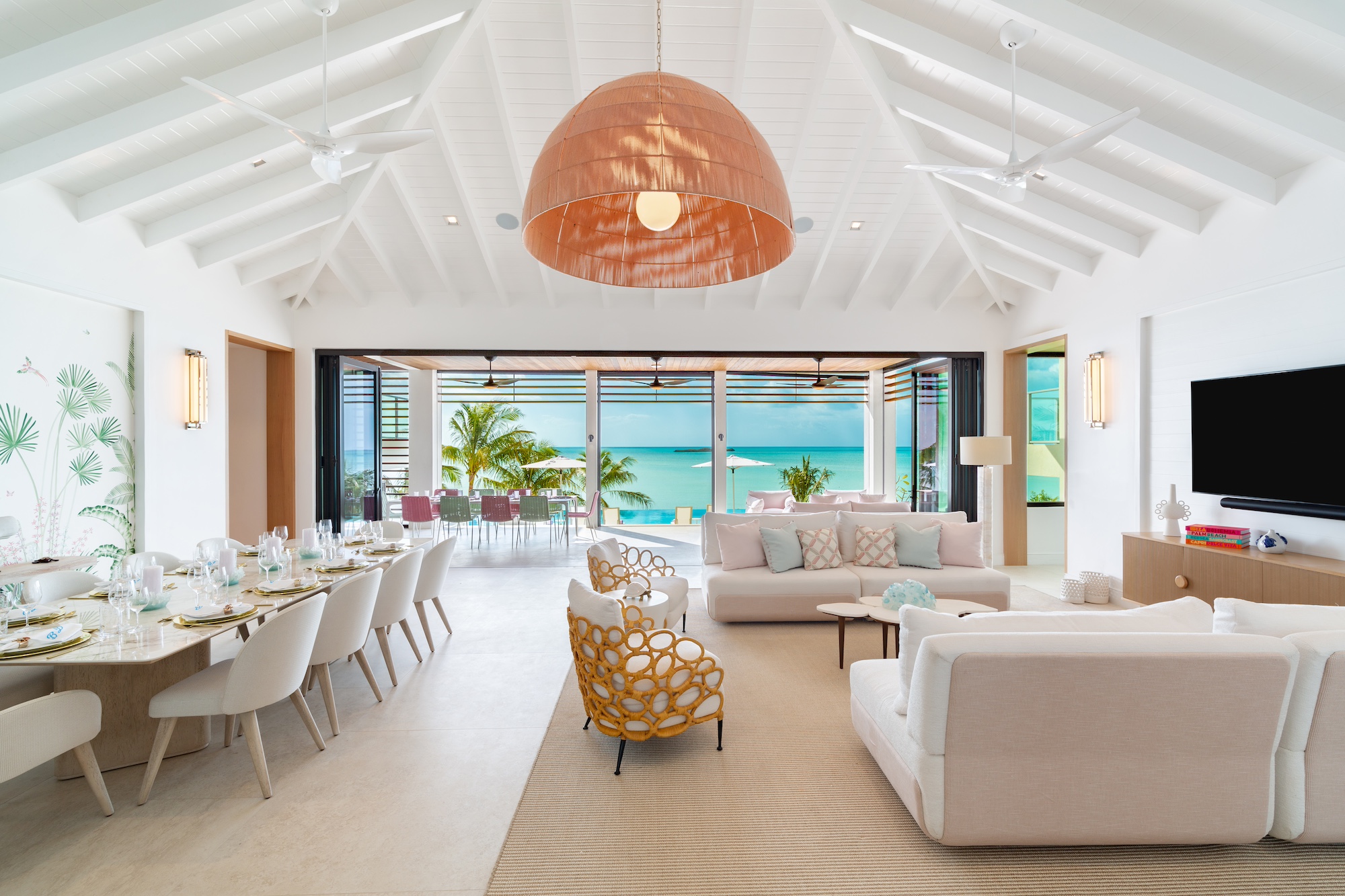 The use of natural materials such as native stone, hardwood panels, whitewashed wood, and elegant tile floors brings warmth and softness, reinforcing the villa’s inviting atmosphere. Interior spaces are designed for connectivity and ease, with bedrooms positioned just a half-level from the Great Room to maintain a sense of intimacy and accessibility. The open-plan living, dining, and kitchen areas remain distinct yet fluid, with the kitchen and bar tucked into a cozy corner while still blending seamlessly into the larger living space. Thoughtful details, including open-air showers in three of the bathrooms, create an immersive experience that highlights the villa’s harmonious relationship with its surroundings. From the entrance, the home appears as a single-story structure, while the ocean-facing side reveals a captivating split-level design that minimizes stair usage while enhancing the visual appeal. Every element of Bristol Breeze has been carefully curated to celebrate its exceptional location, offering a refined yet relaxed coastal retreat.
