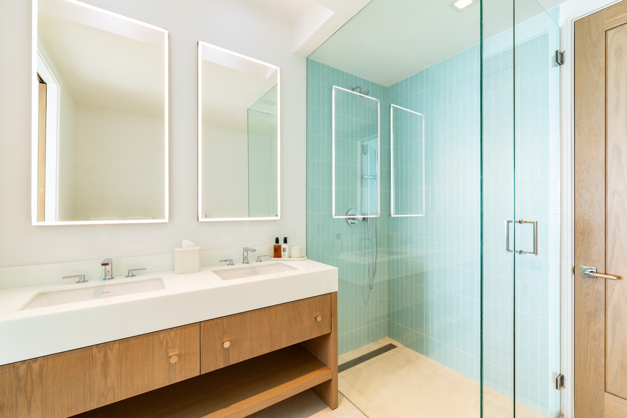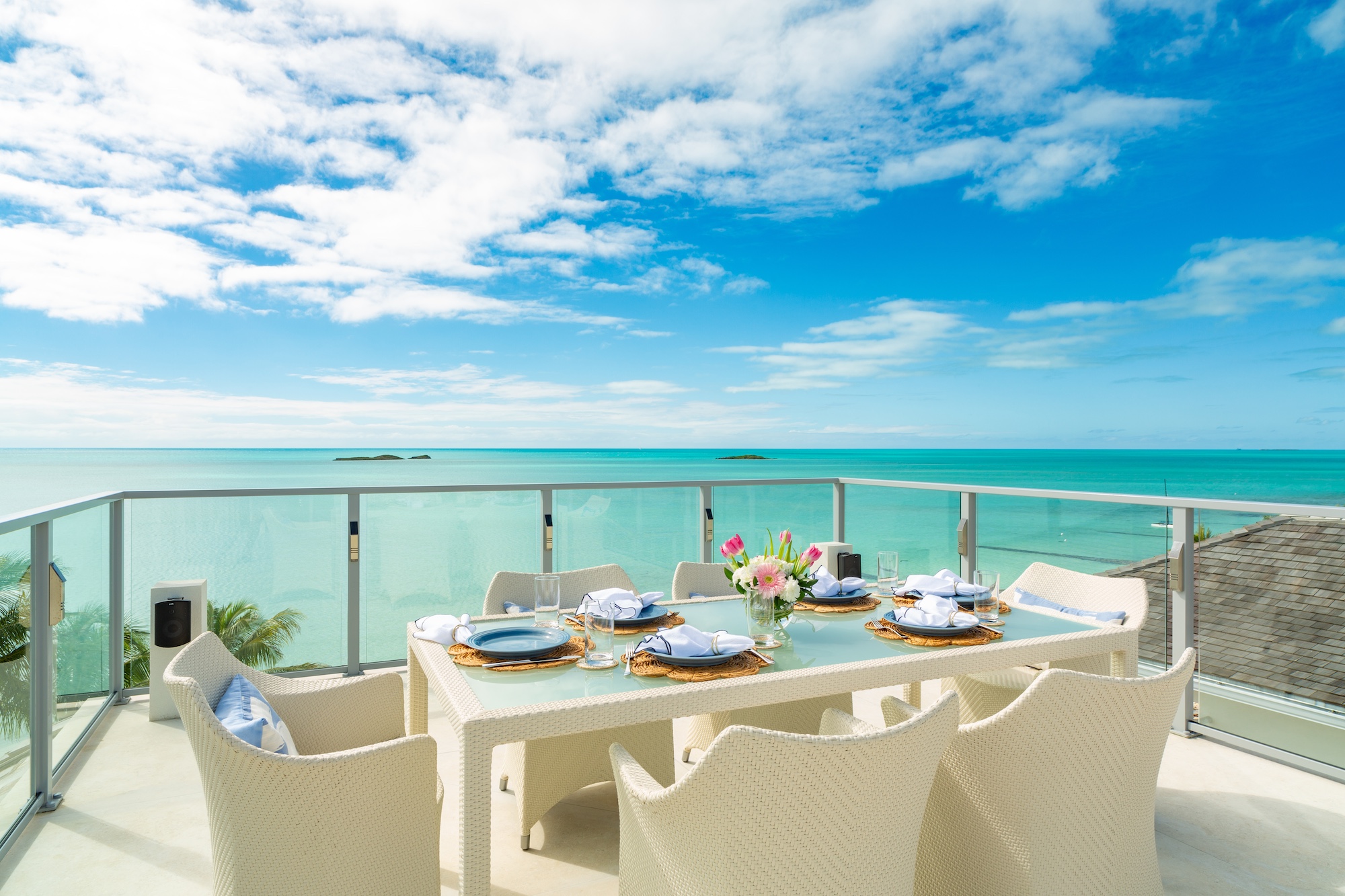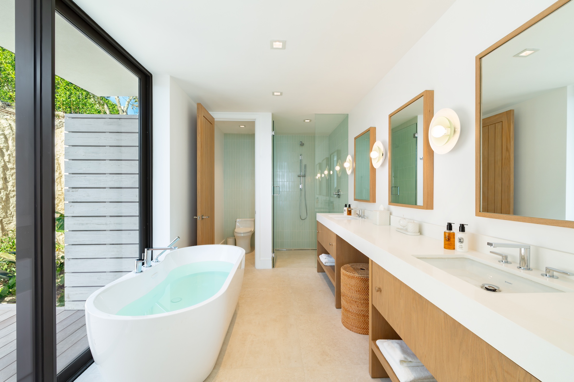 • Principal Suite – West Wing - first floor: Oceanfront, Indoor shower, Indoor tub, Double vanity, Outdoor shower with tub, TV, Balcony, Sunrise view