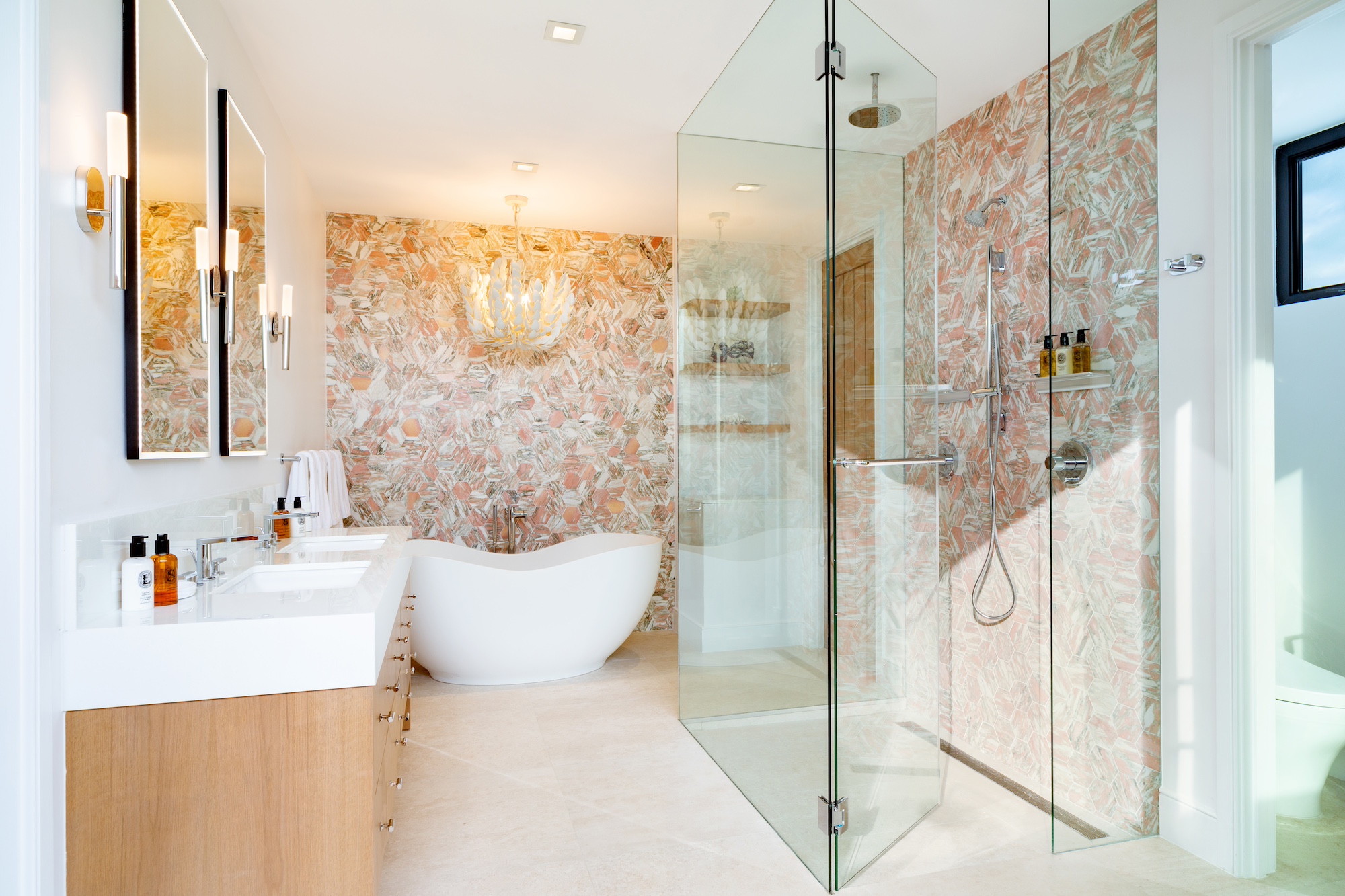 The villa’s thoughtful layout creates a seamless connection between indoor and outdoor spaces, with terraces flowing effortlessly toward the ocean despite the elevated terrain. A carefully balanced architectural design features a distinctive shingle roof terrace that integrates harmoniously into the structure, overcoming design challenges to enhance both form and function.