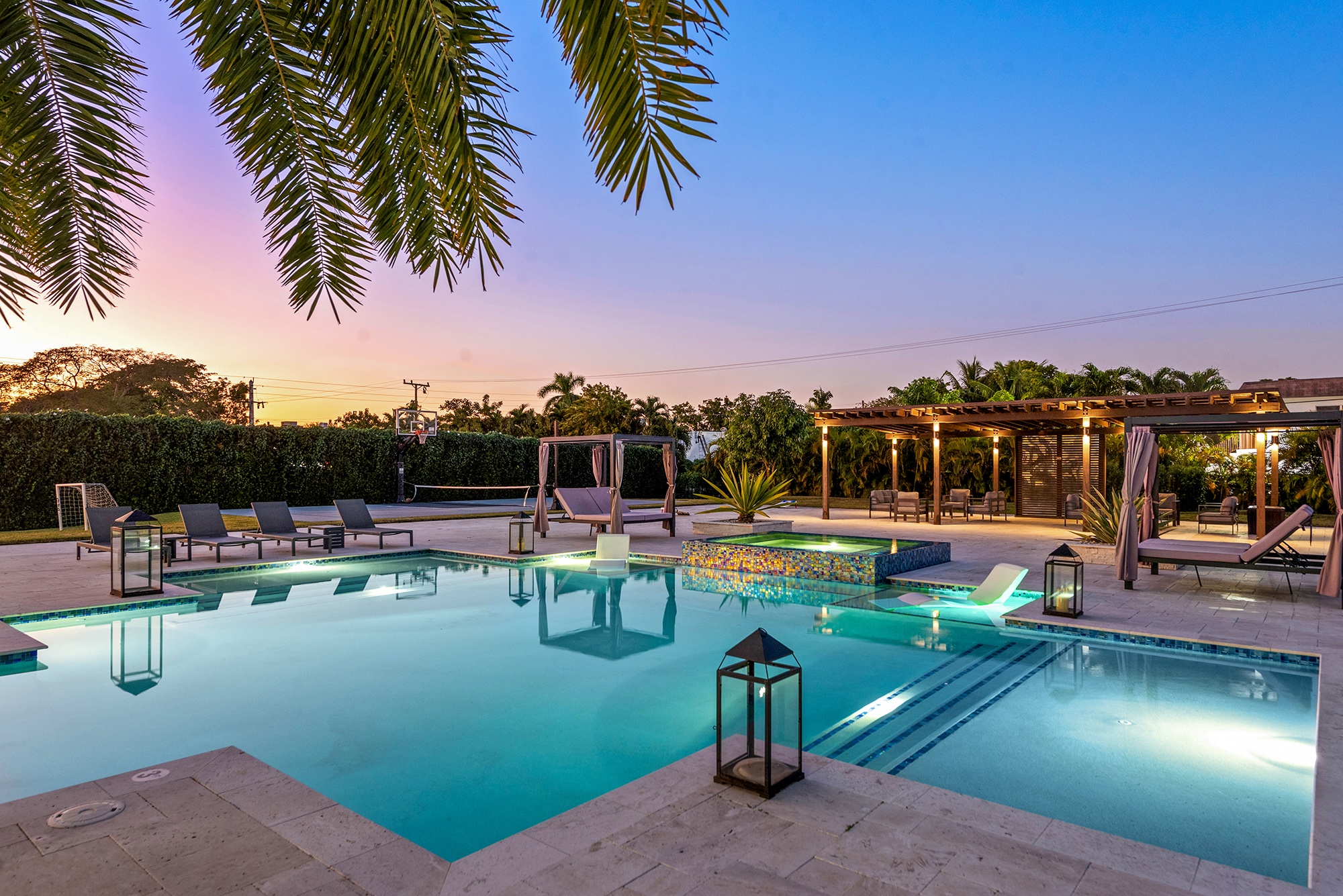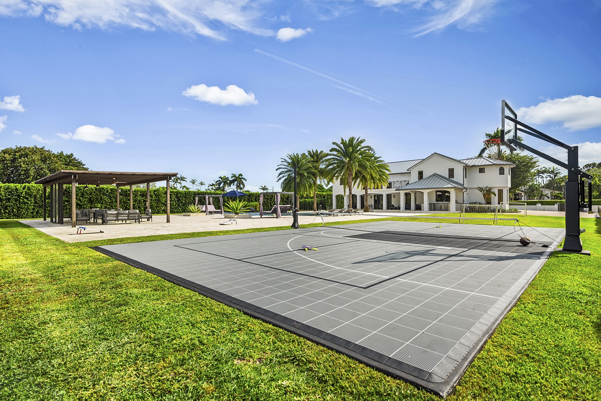 The outdoors unfold like a private resort, complete with a sparkling pool, shaded cabanas, a combined Basketball/Pickleball court, a full barbecue and bar setup, and a covered lounge area. Accommodates up to 12 guests.