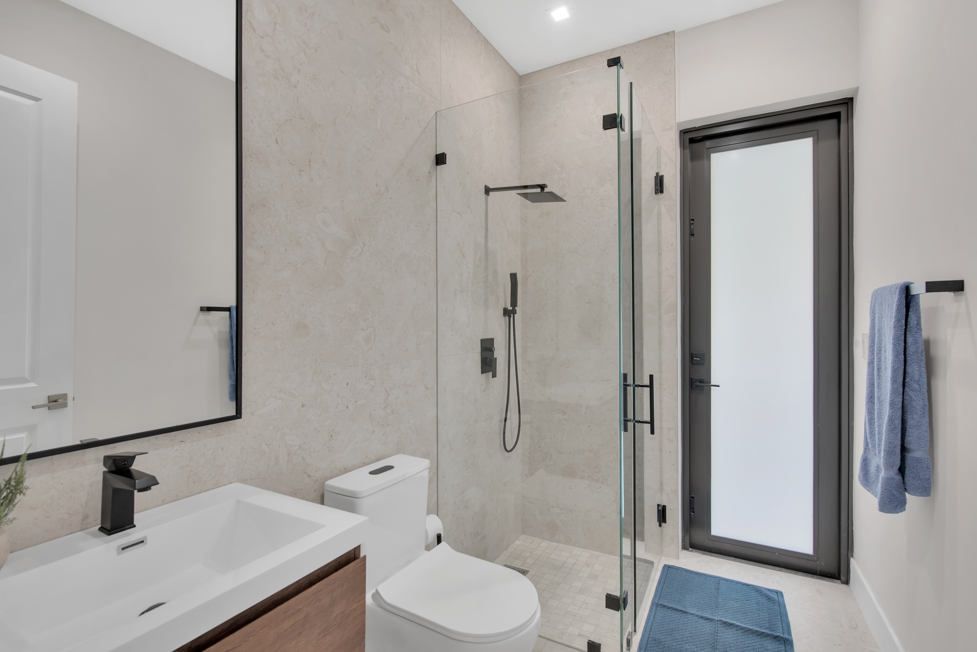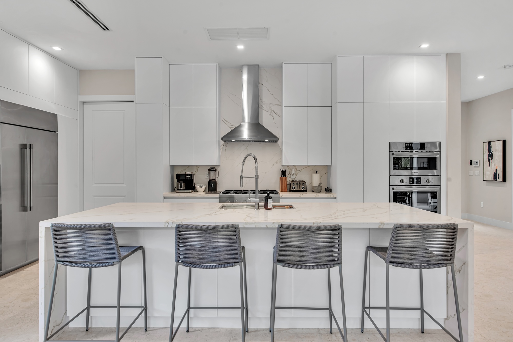 Expansive glass walls erase the boundary between indoors and out, opening to covered terraces ideal for lounging and dining. Sunlit interiors showcase refined wood plank flooring and limestone tile, while the show-stopping kitchen serves as a true culinary centerpiece. Custom cabinetry, a dramatic 12-foot waterfall quartz island, and premium stainless steel appliances—including a built-in micro/oven duo, cooktop, hood, dishwasher, and wine cooler—make it perfect for hosting unforgettable private chef experiences.