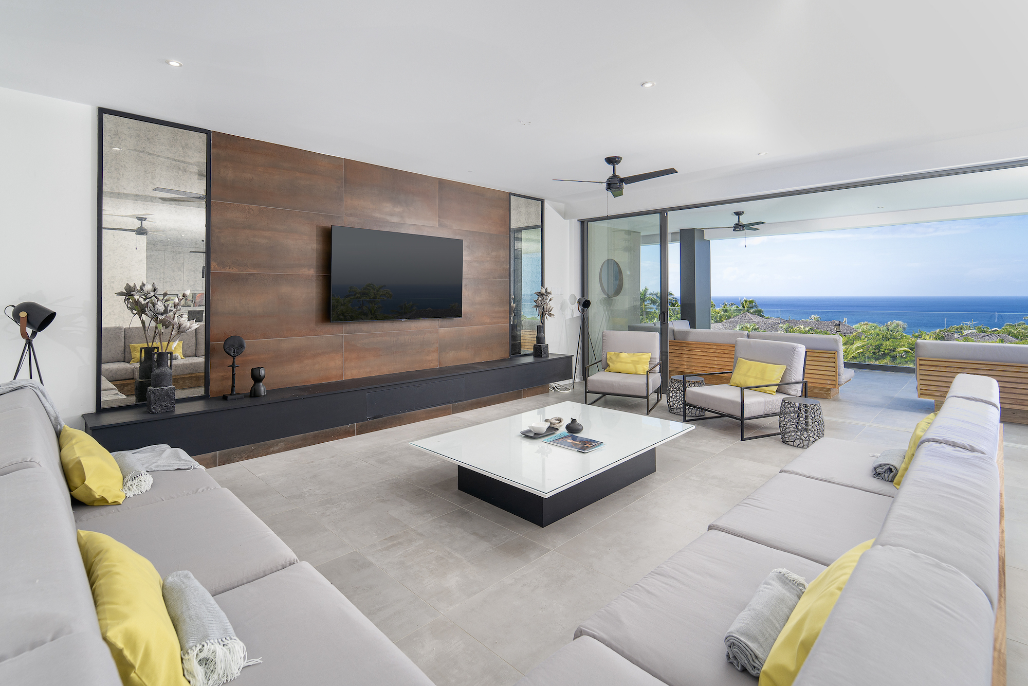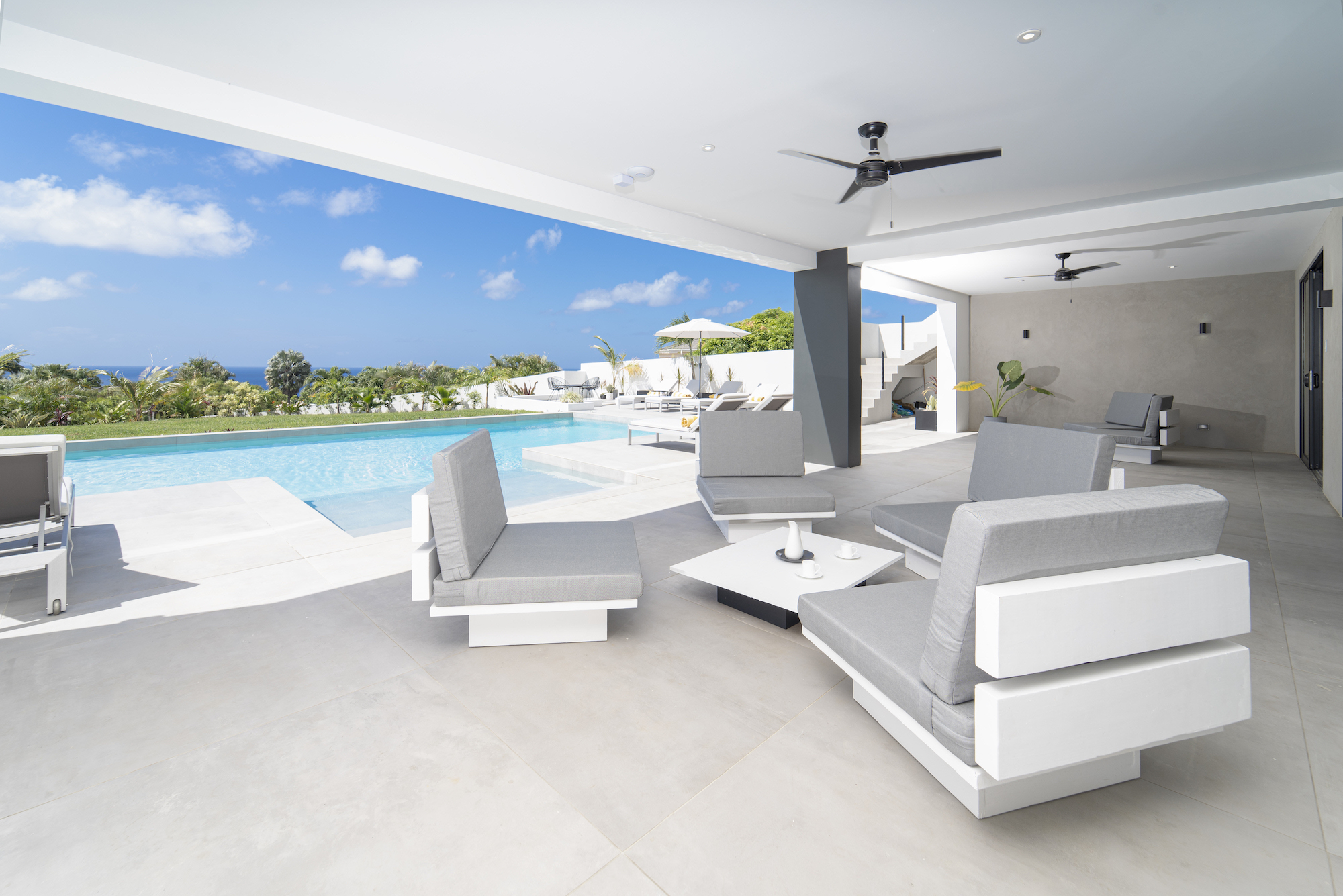 Upon arrival, guests are greeted by a grand lobby that seamlessly transitions into an expansive open-plan living space, effortlessly merging indoor and outdoor realms. Oversized sliding doors invite the gentle Caribbean breezes and reveal captivating vistas of the crystal-clear waters and iconic Barbados skyline, while a sprawling terrace overlooks a luxurious 46-foot saltwater swimming pool, perfect for both relaxation and entertainment.
